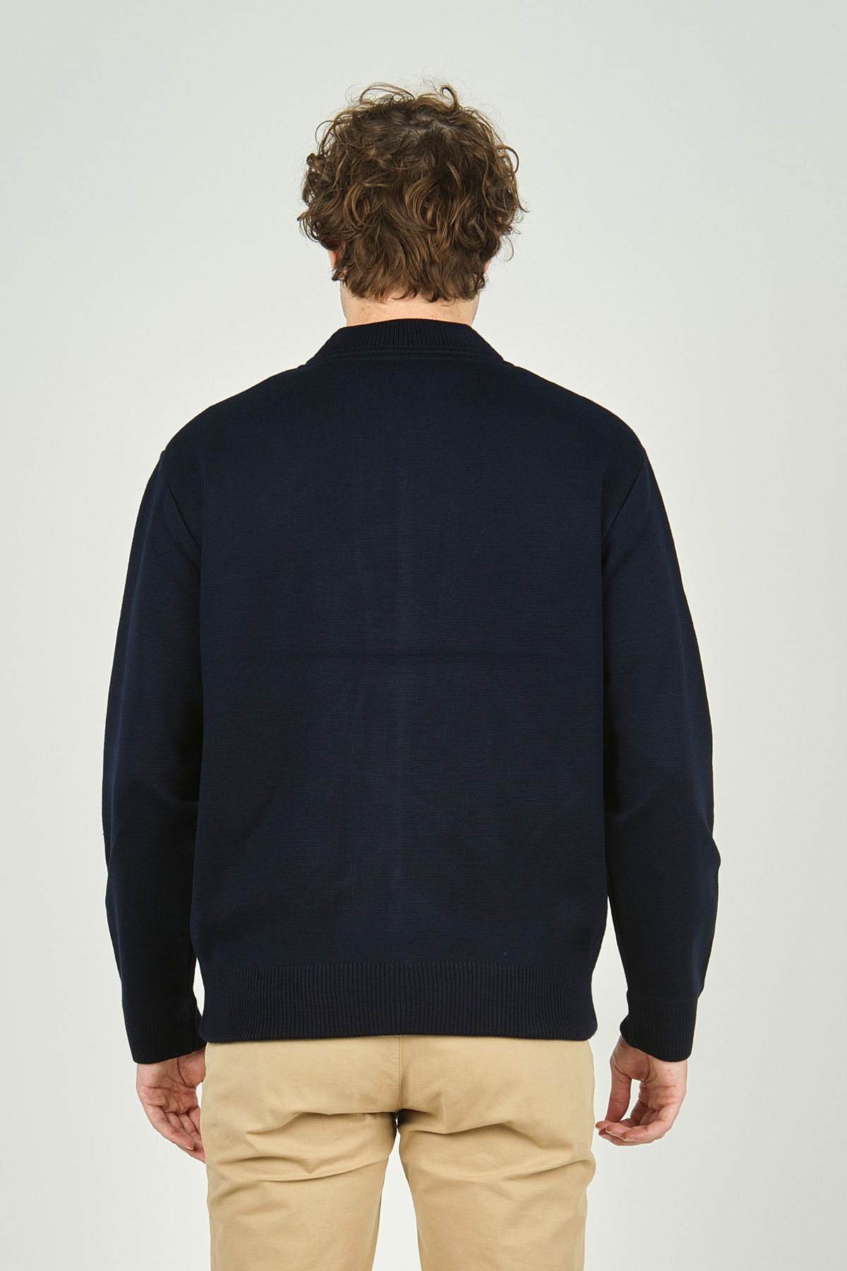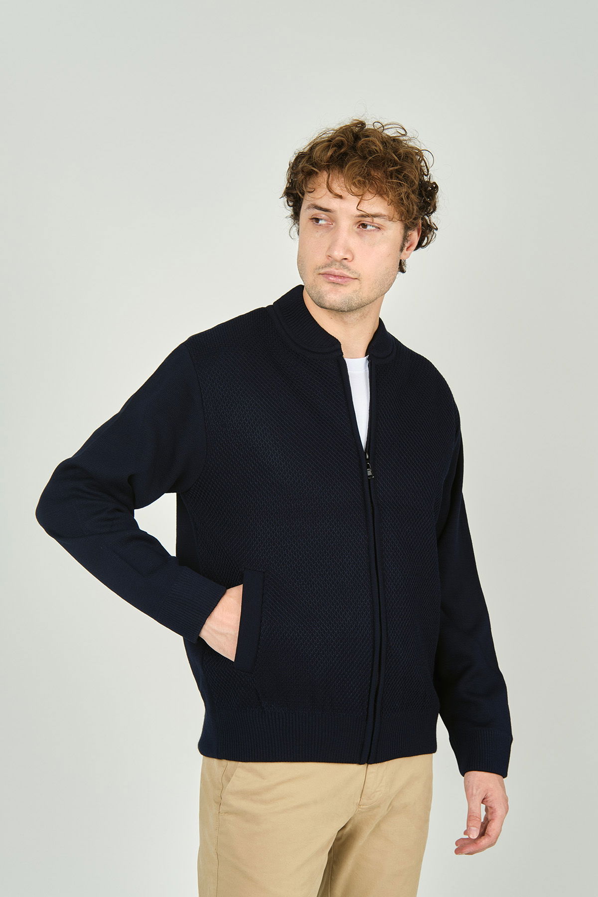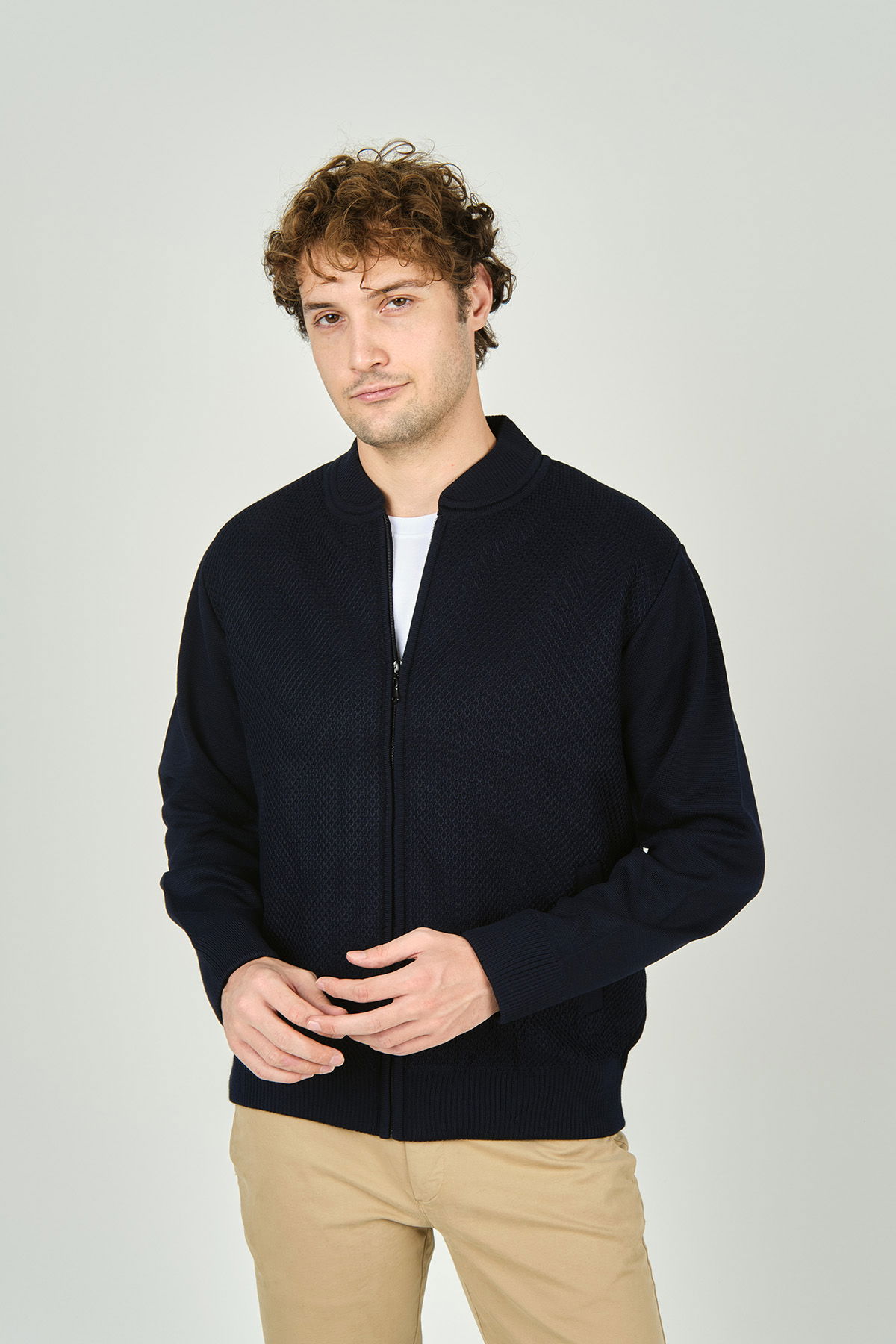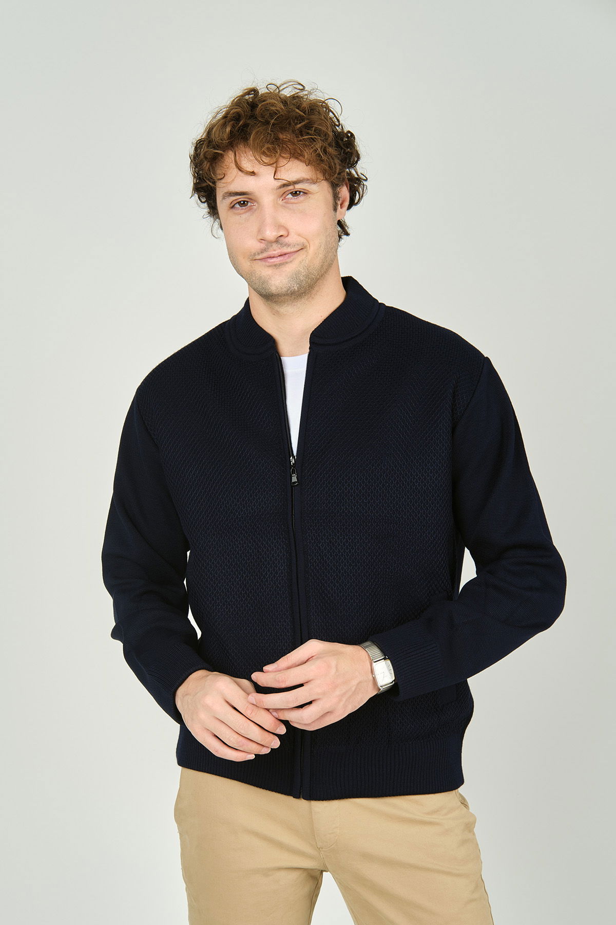 Detay: Fermuar kapamalı, hakim yaka, çift cepli, desenli, triko mont;