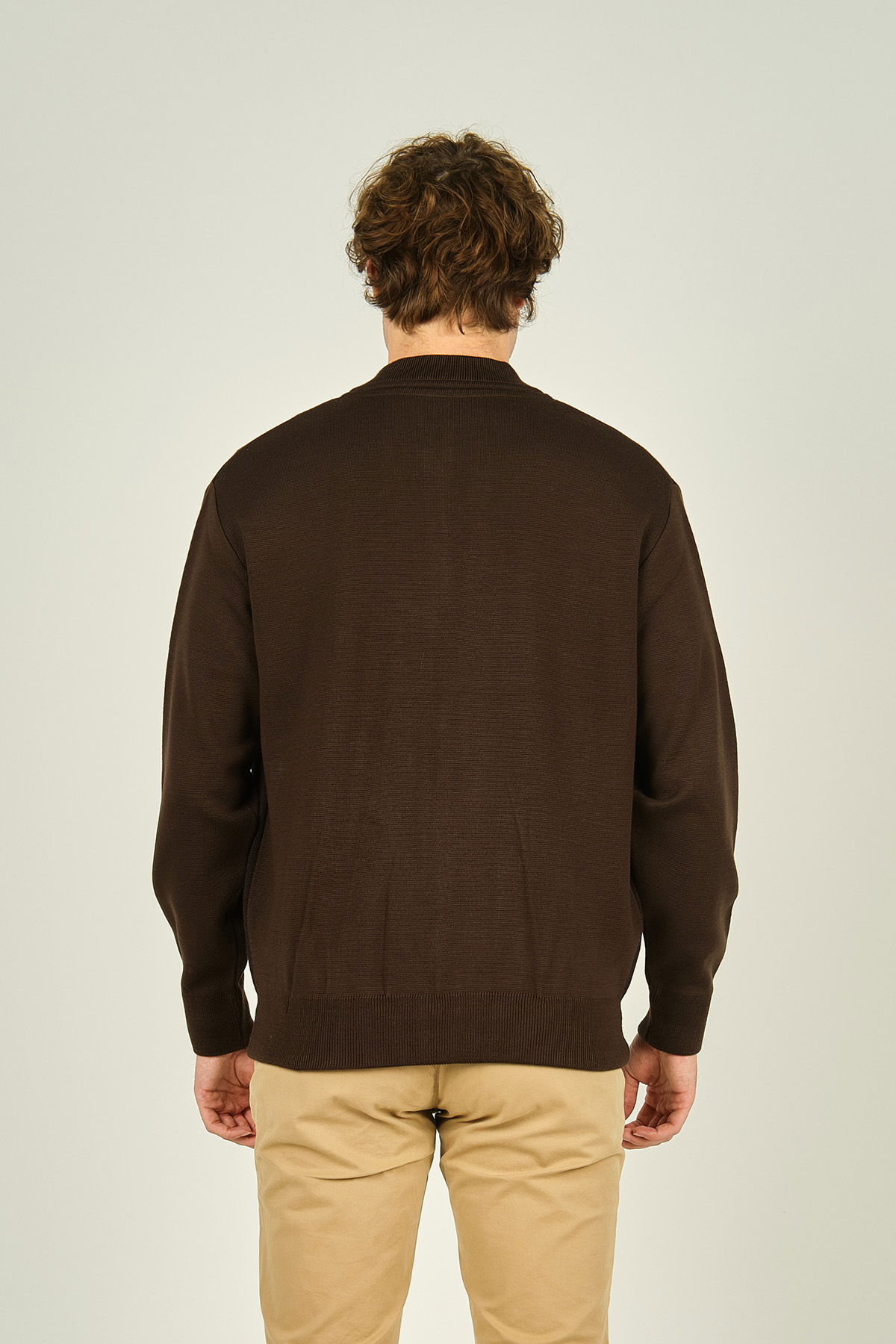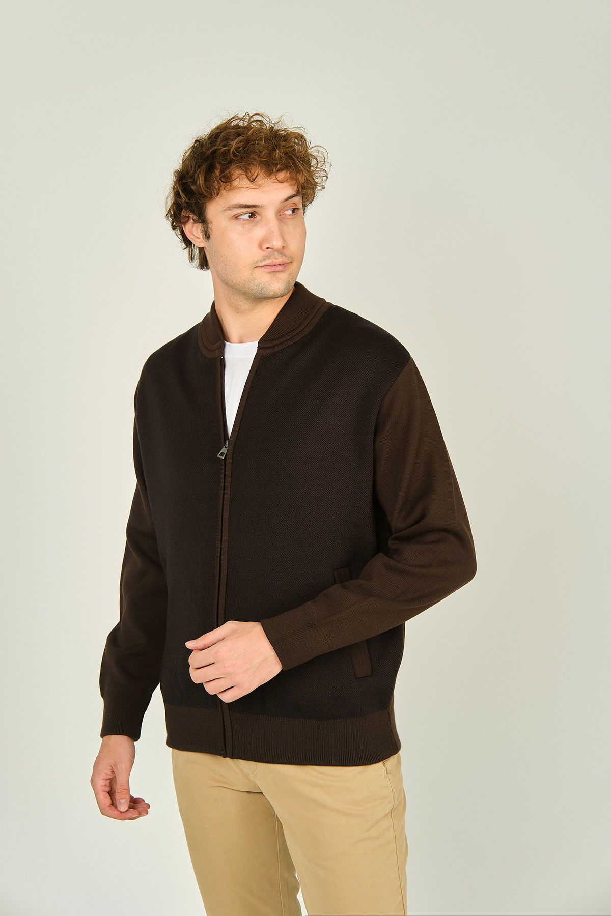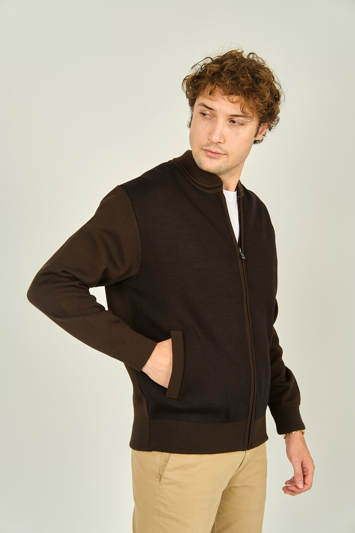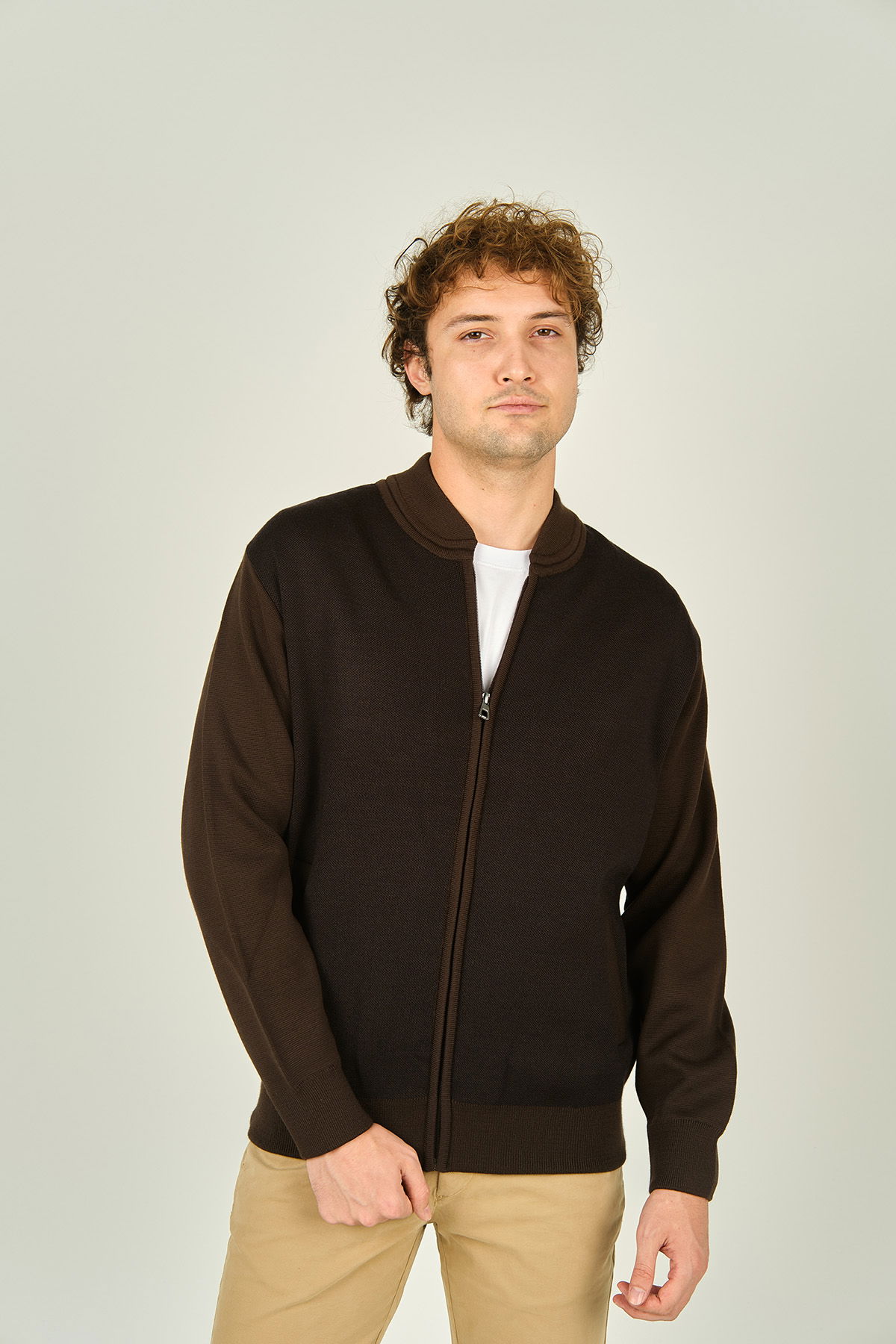 Ateş Triko Erkek Fermuarlı Çift Cepli Hakim Yaka Triko Yün Mont 9050 Kahverengi