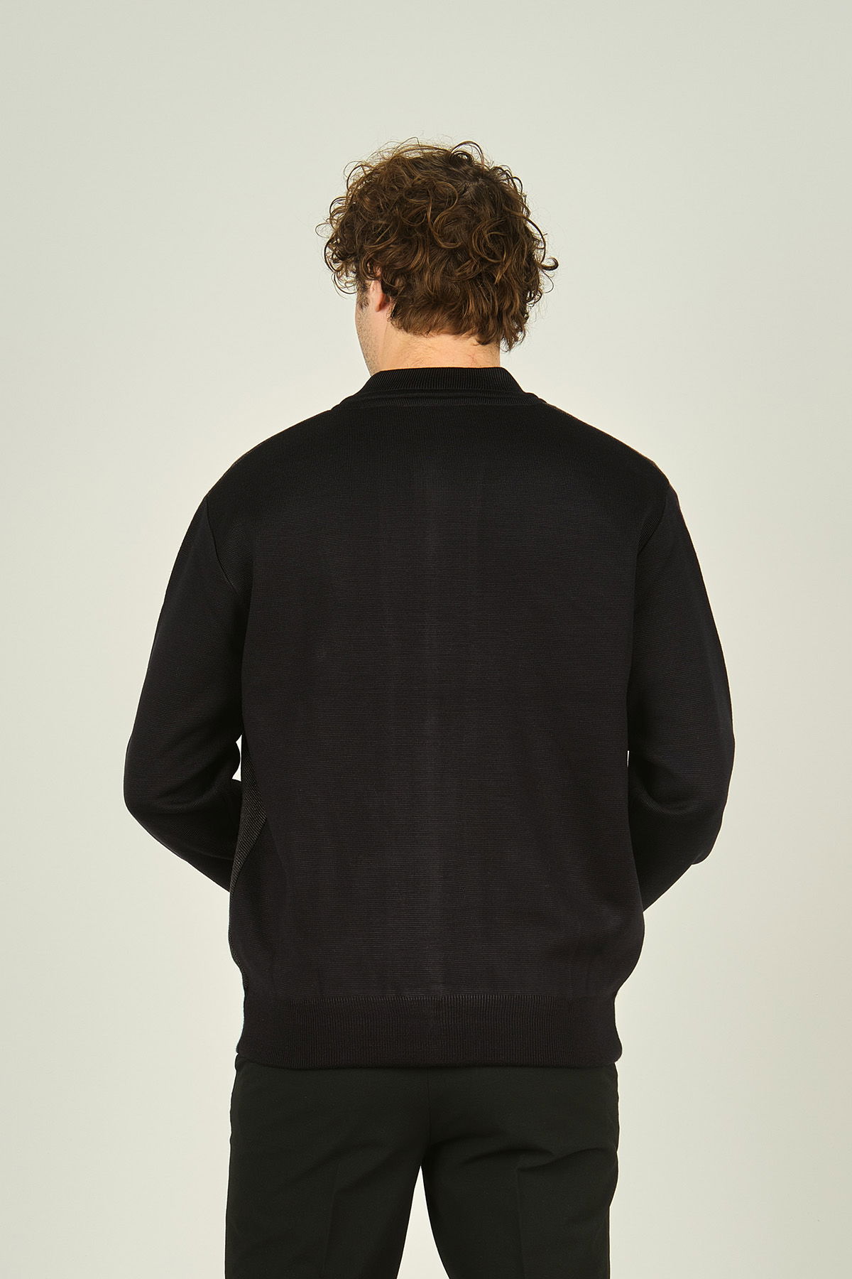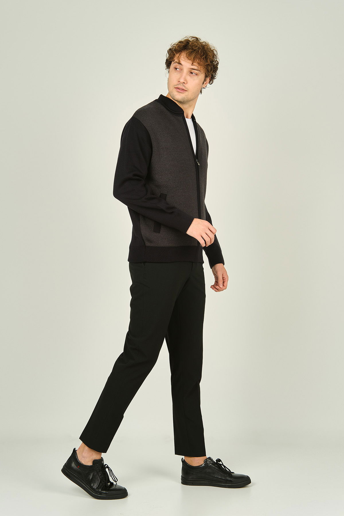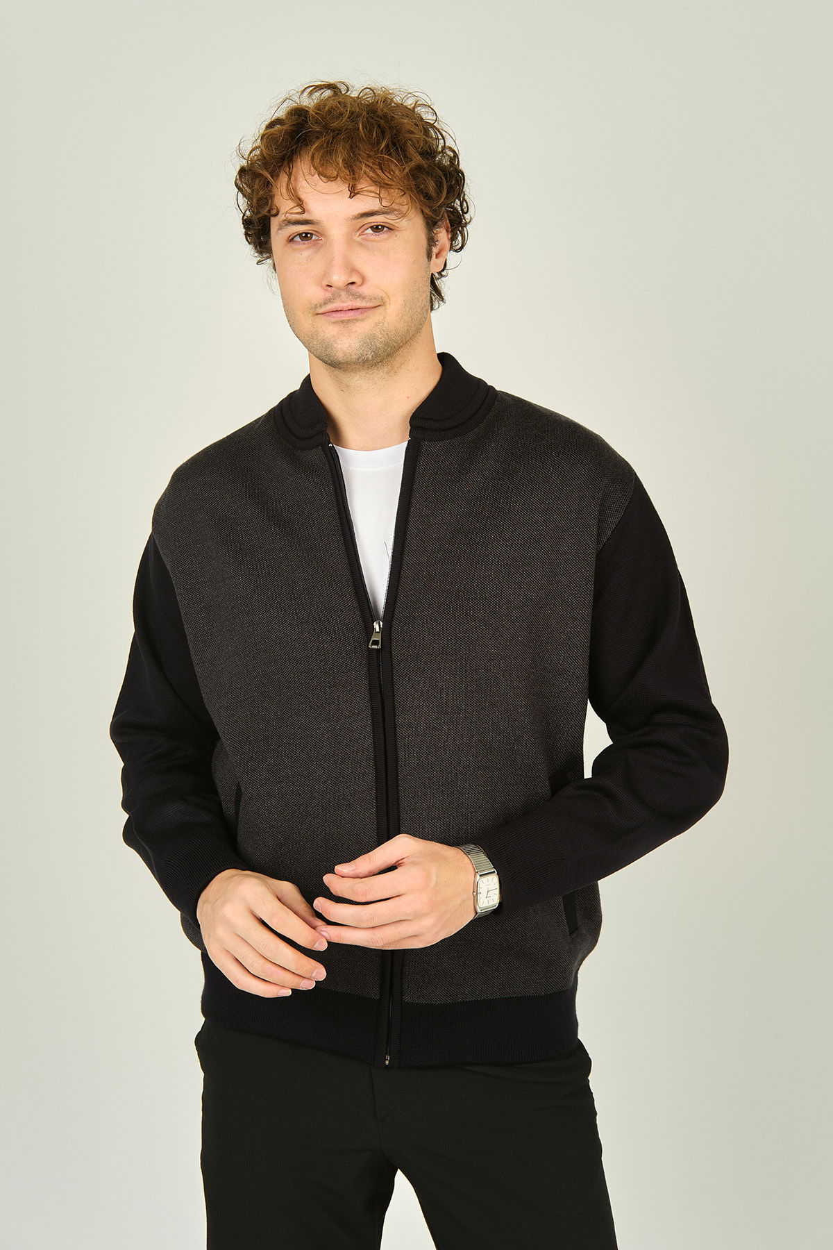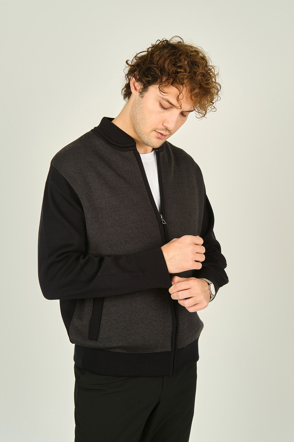 Detay: Fermuarlı, çift cepli, hakim yaka triko yün mont;
