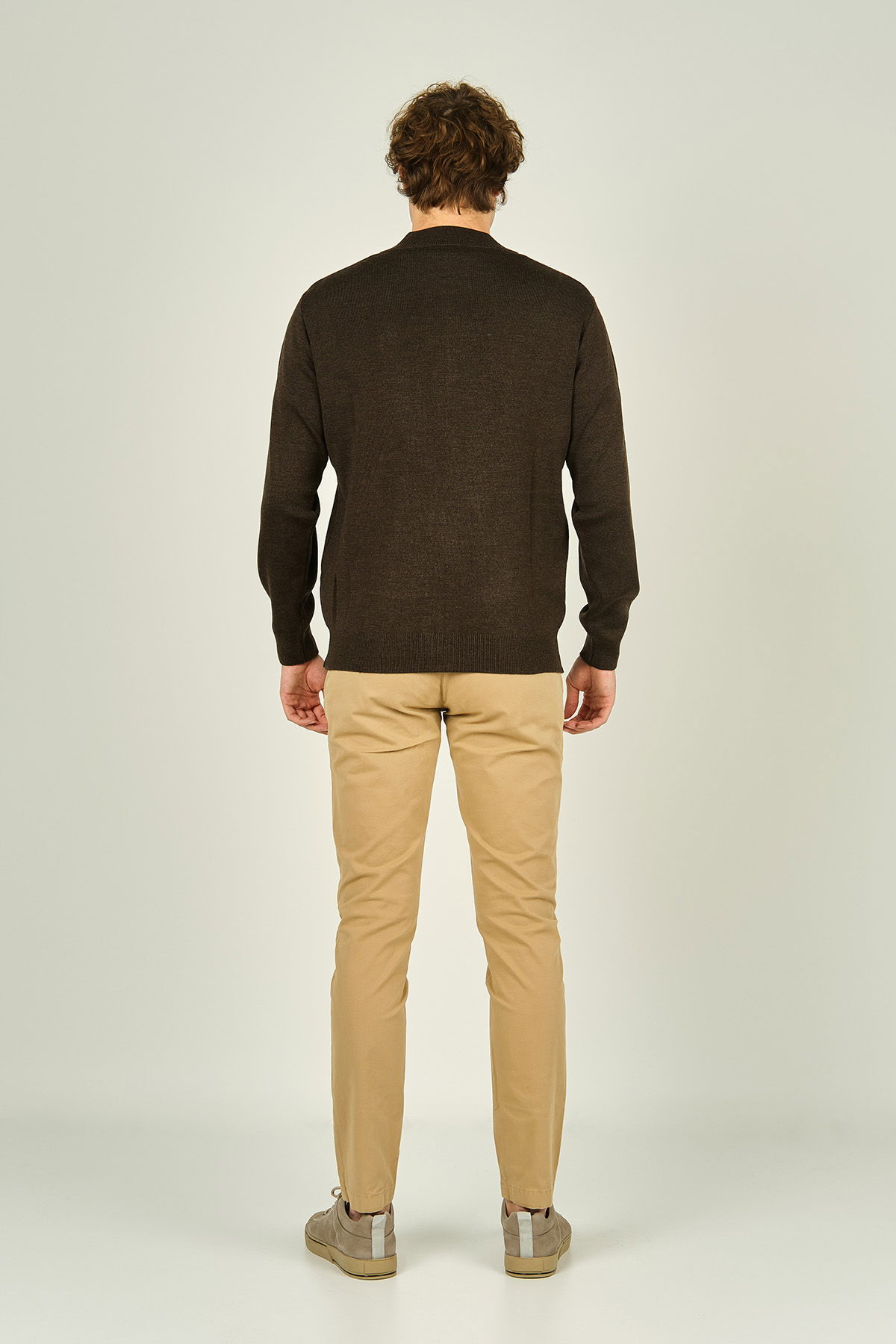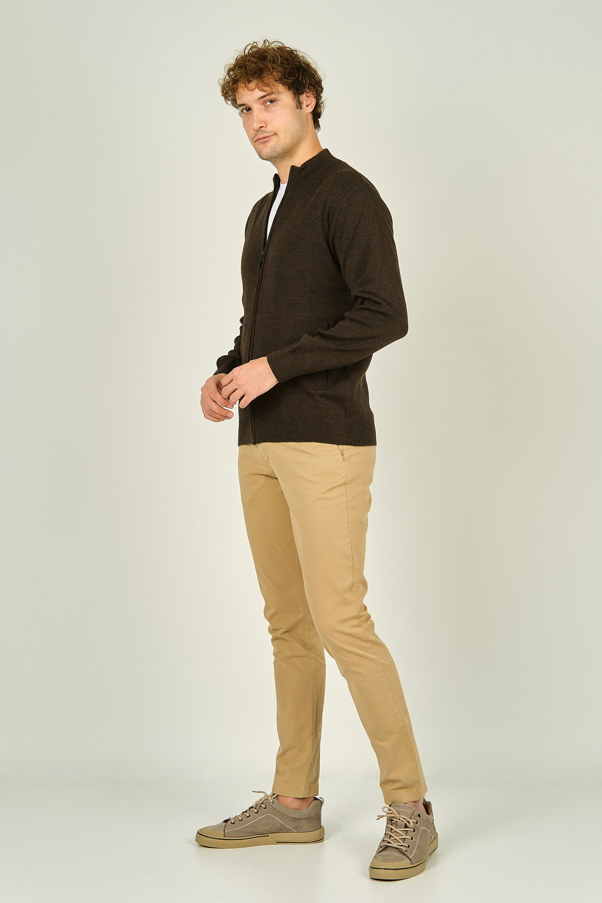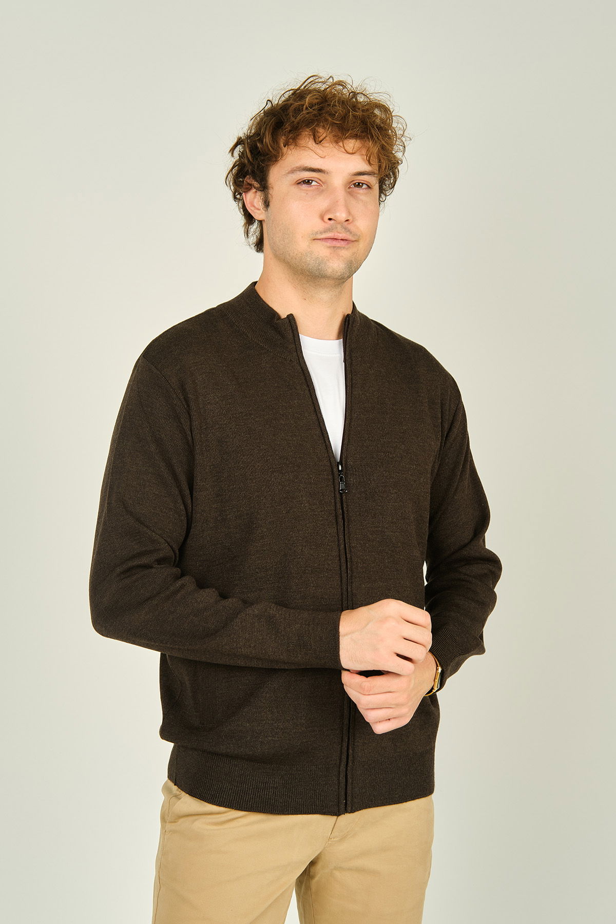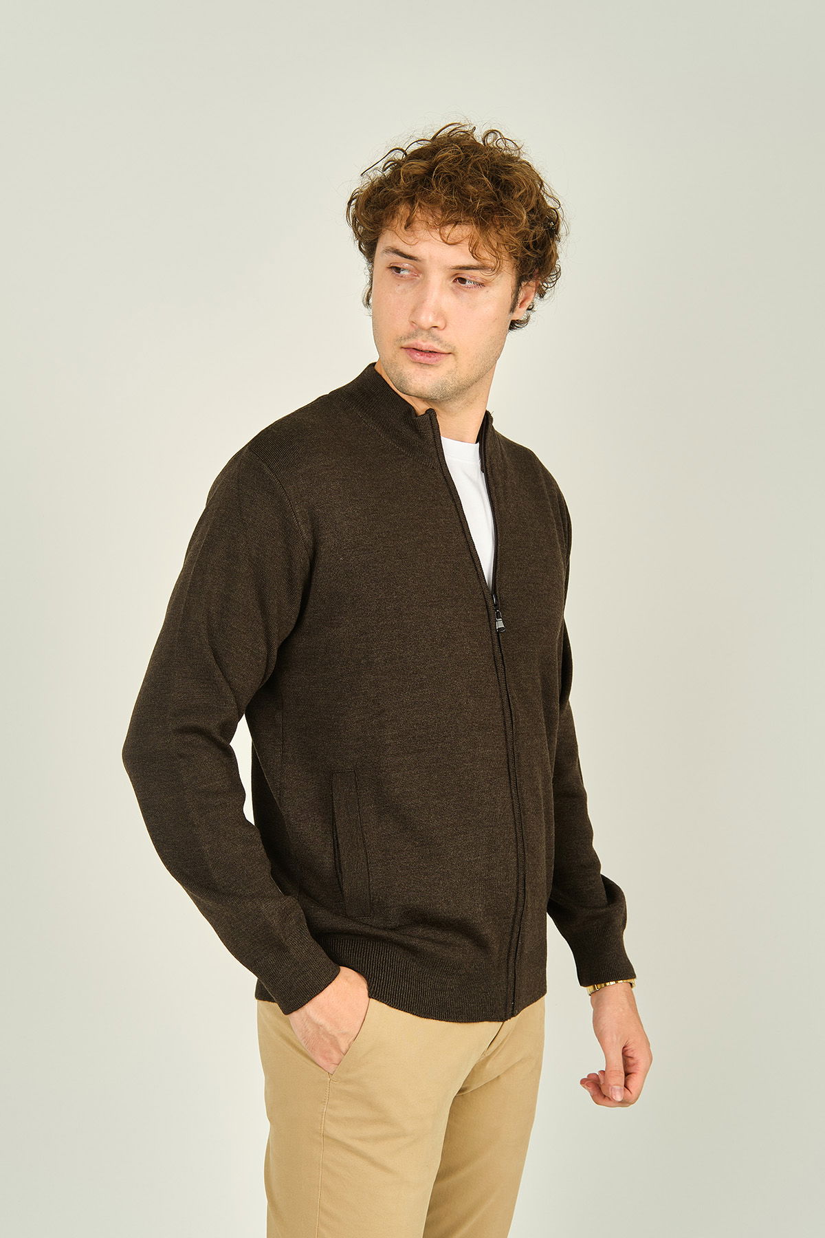 Detay: Fermuarlı, uzun kollu, çift cepli, dik yaka yün hırka;