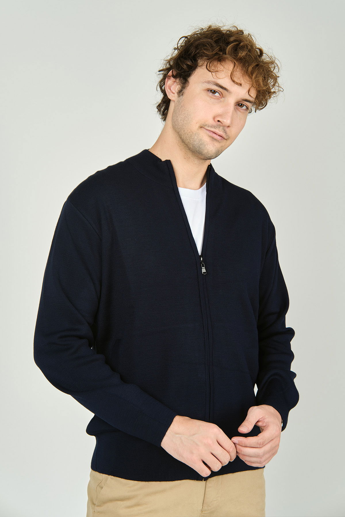 Detay: Fermuarlı, uzun kollu, çift cepli, dik yaka yün hırka;