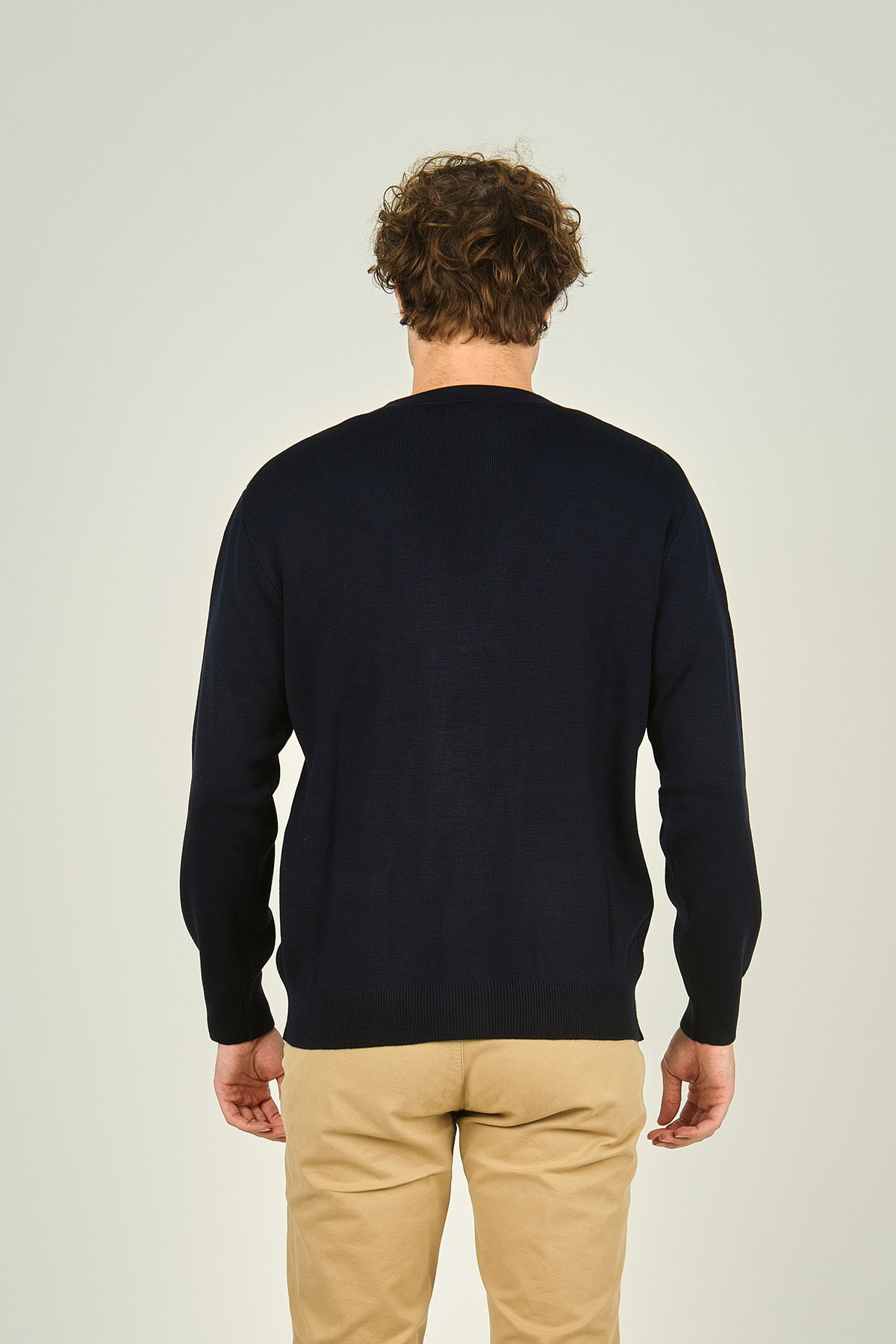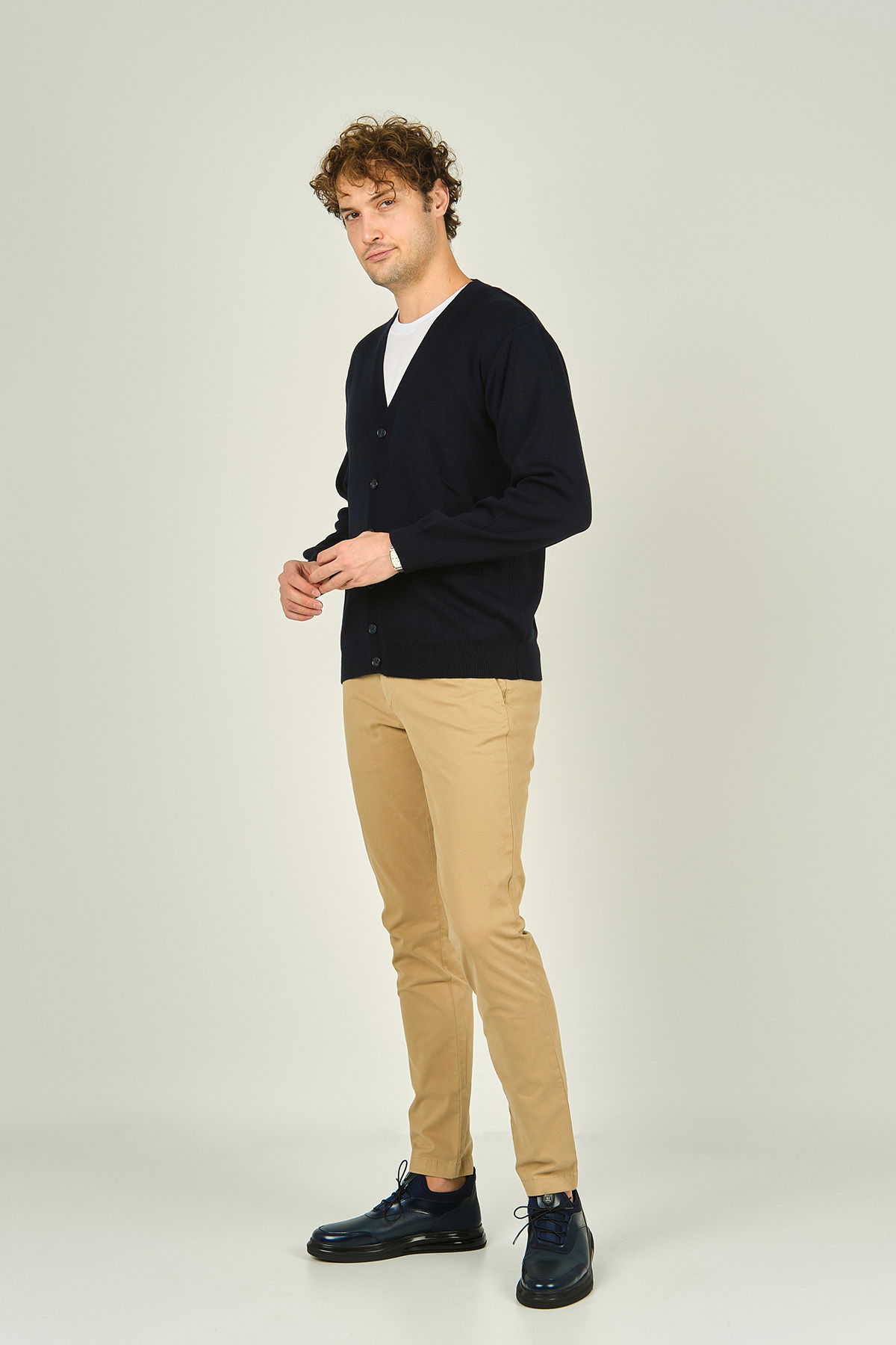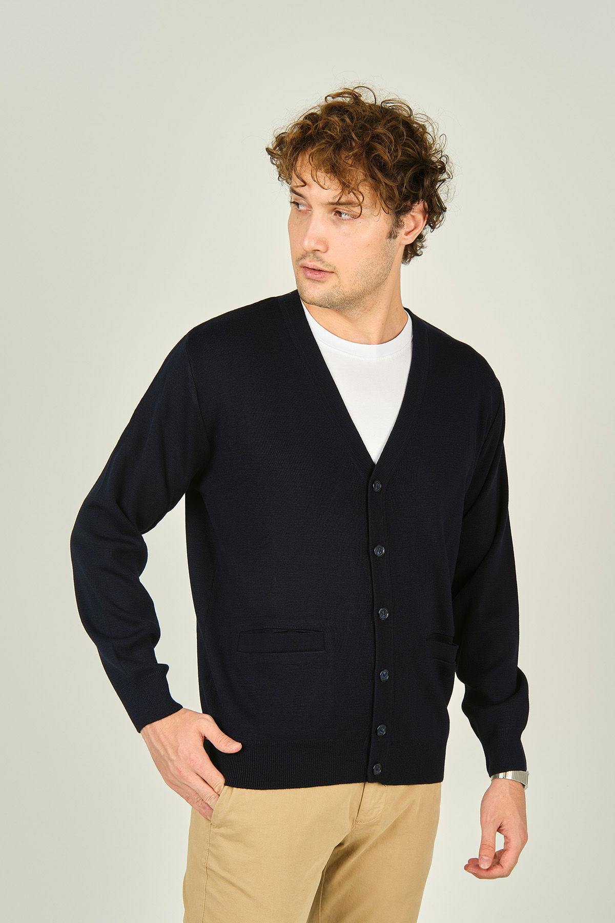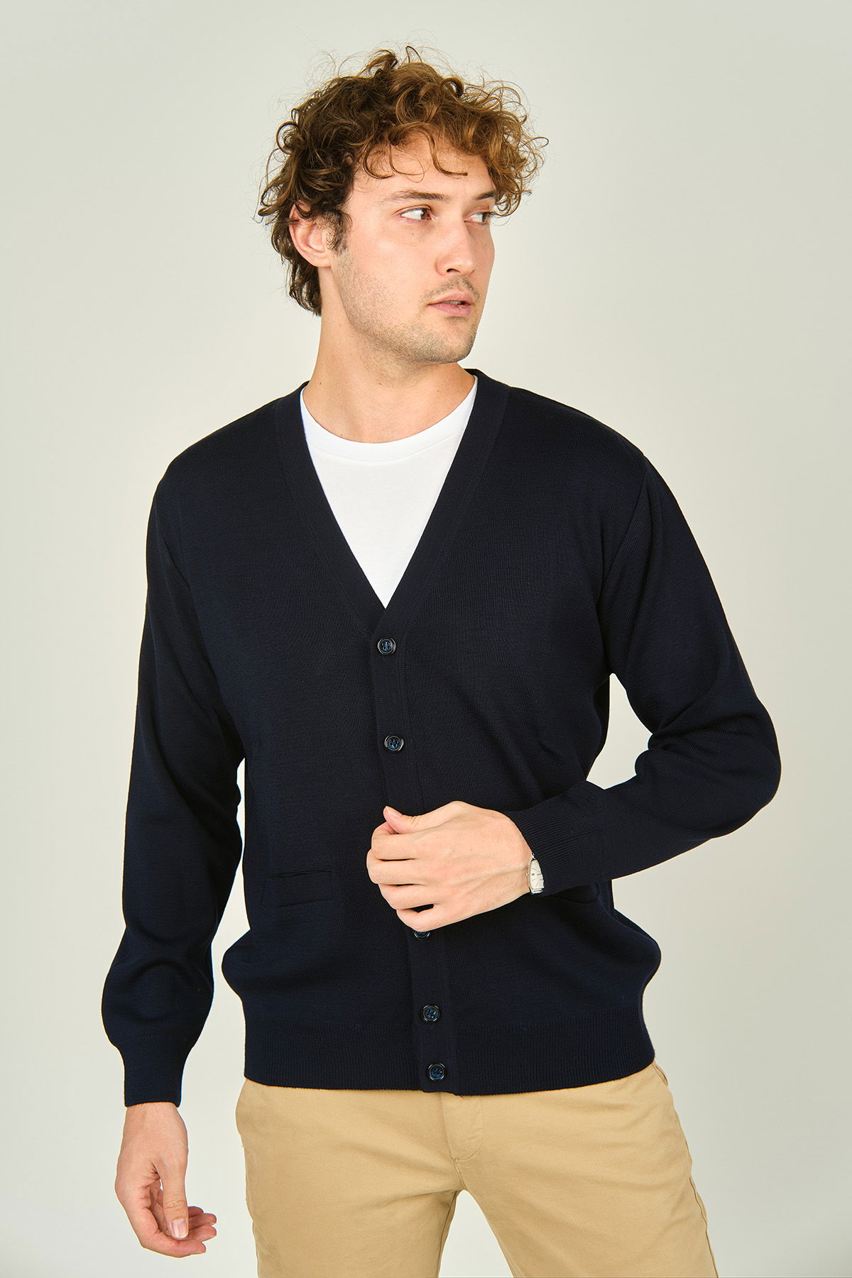 Detay: Uzun kollu, V yaka, düğme kapamalı, yün karışımlı hırka;