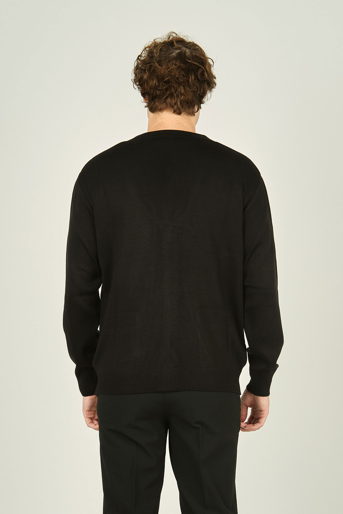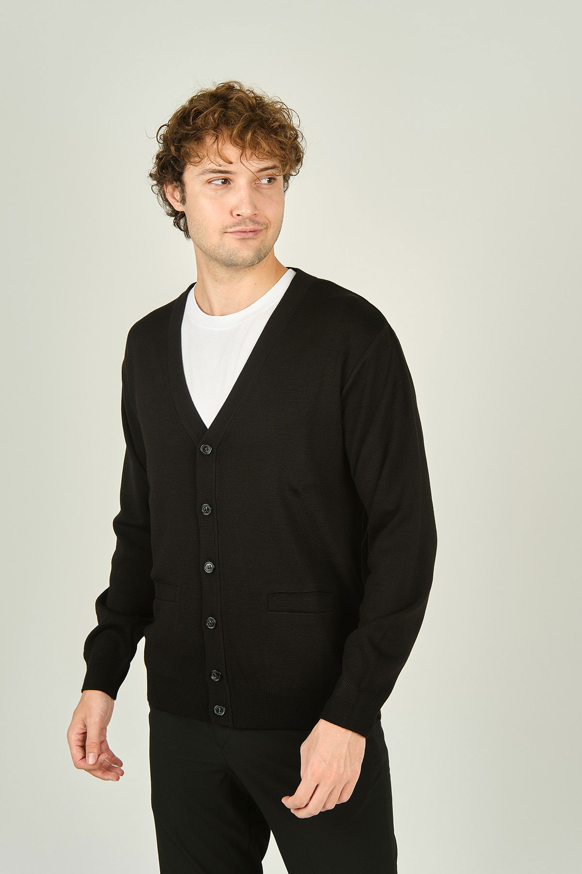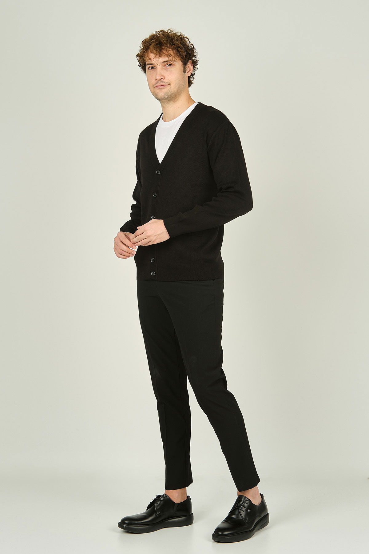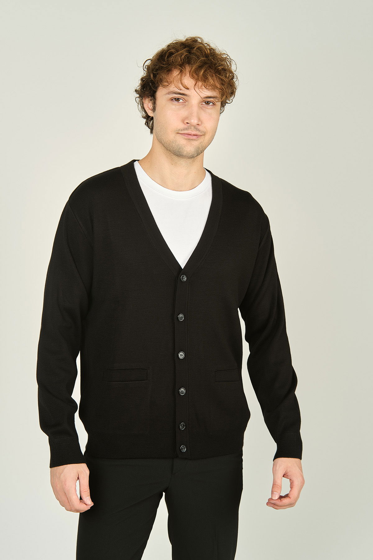 Detay: V yaka, uzun kollu, düğmeli yün hırka;