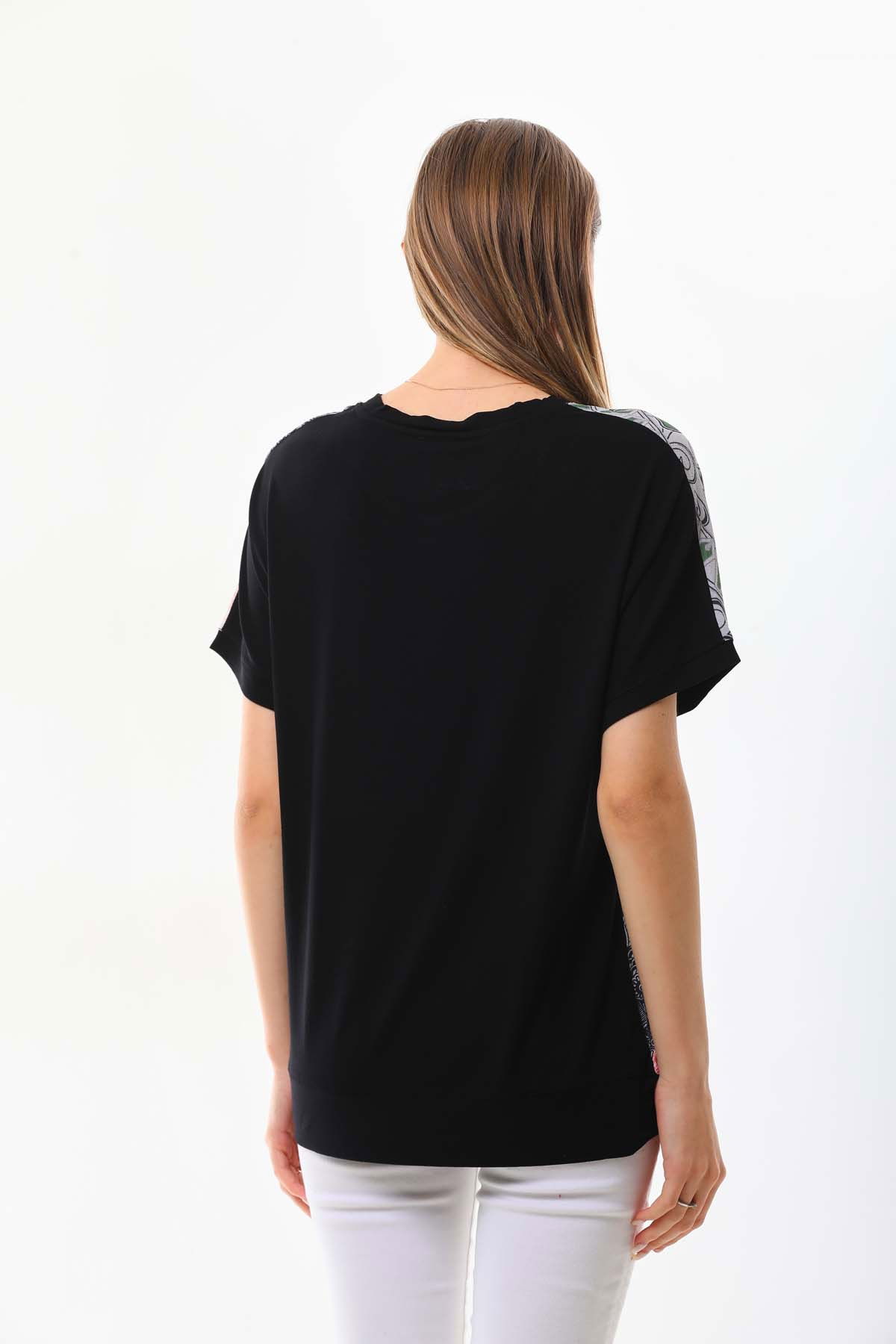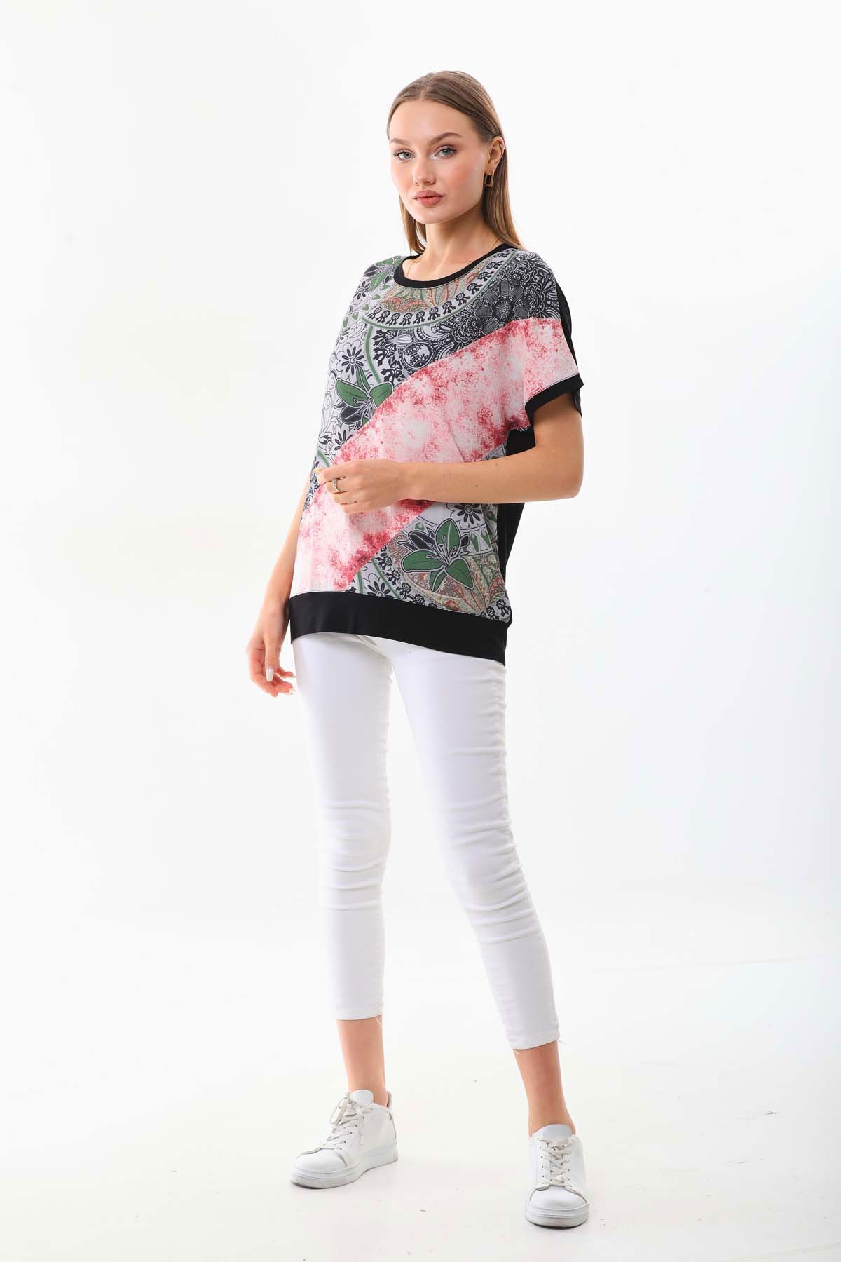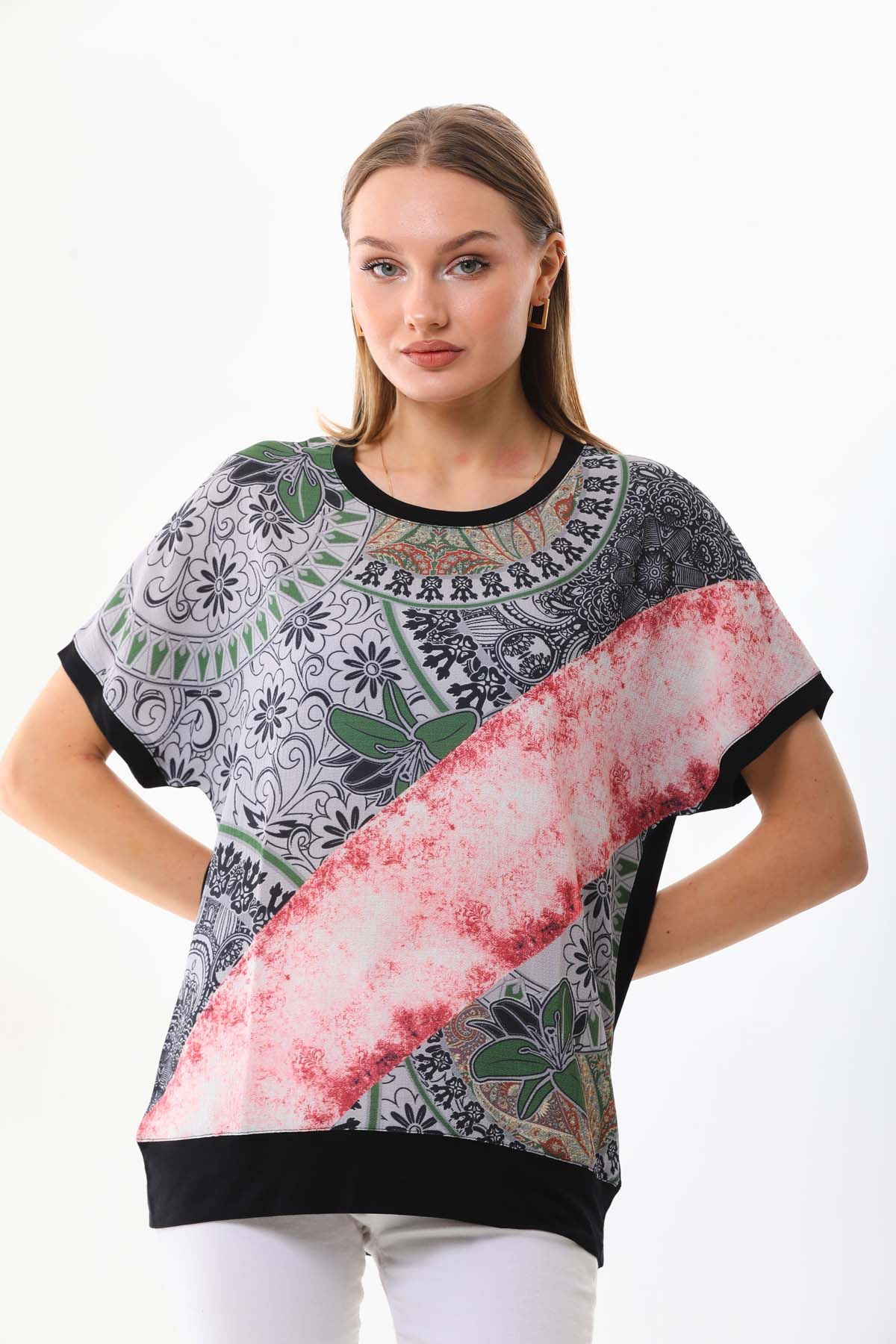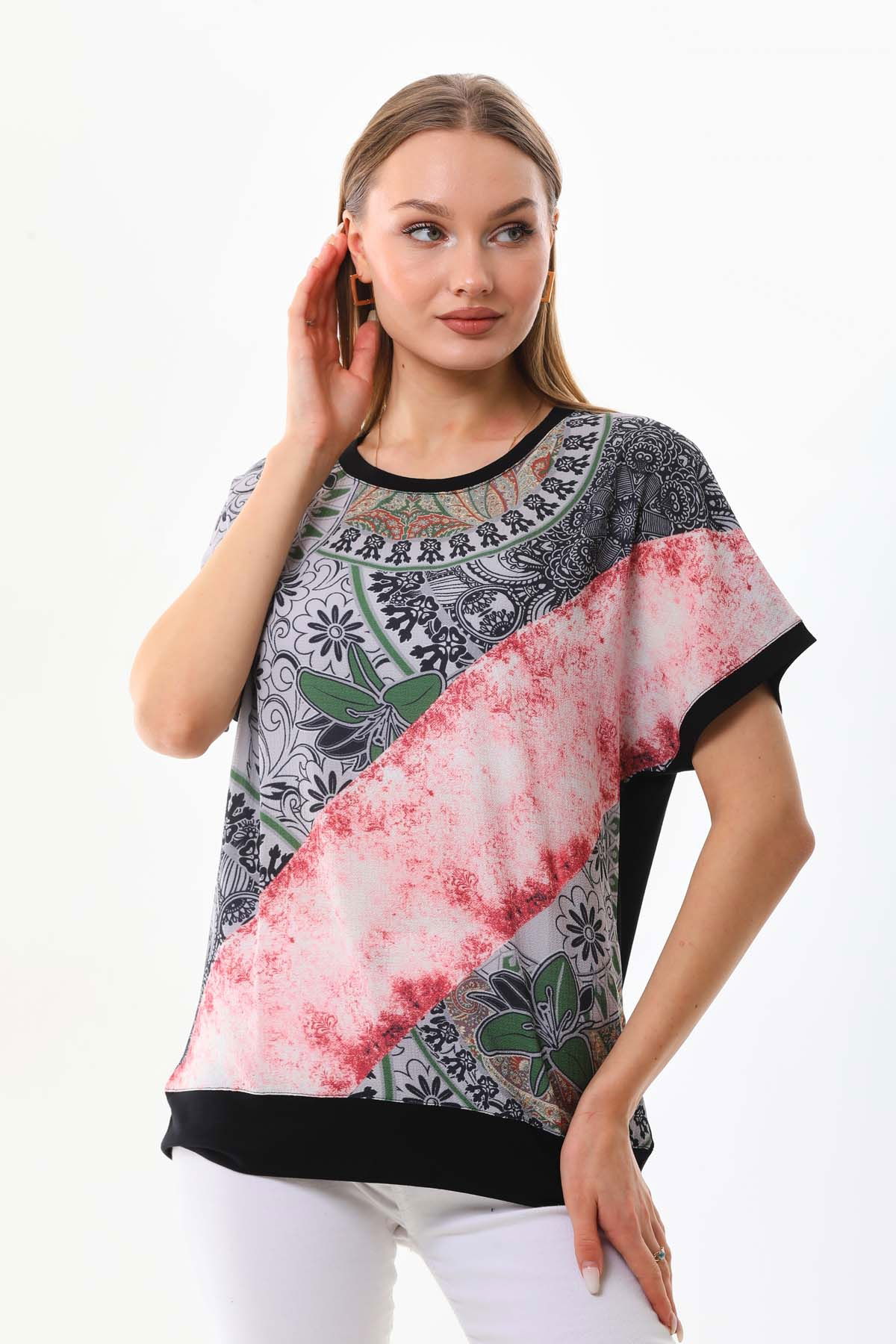 Detay: Bisiklet yaka, desenli, kısa kol bluz;