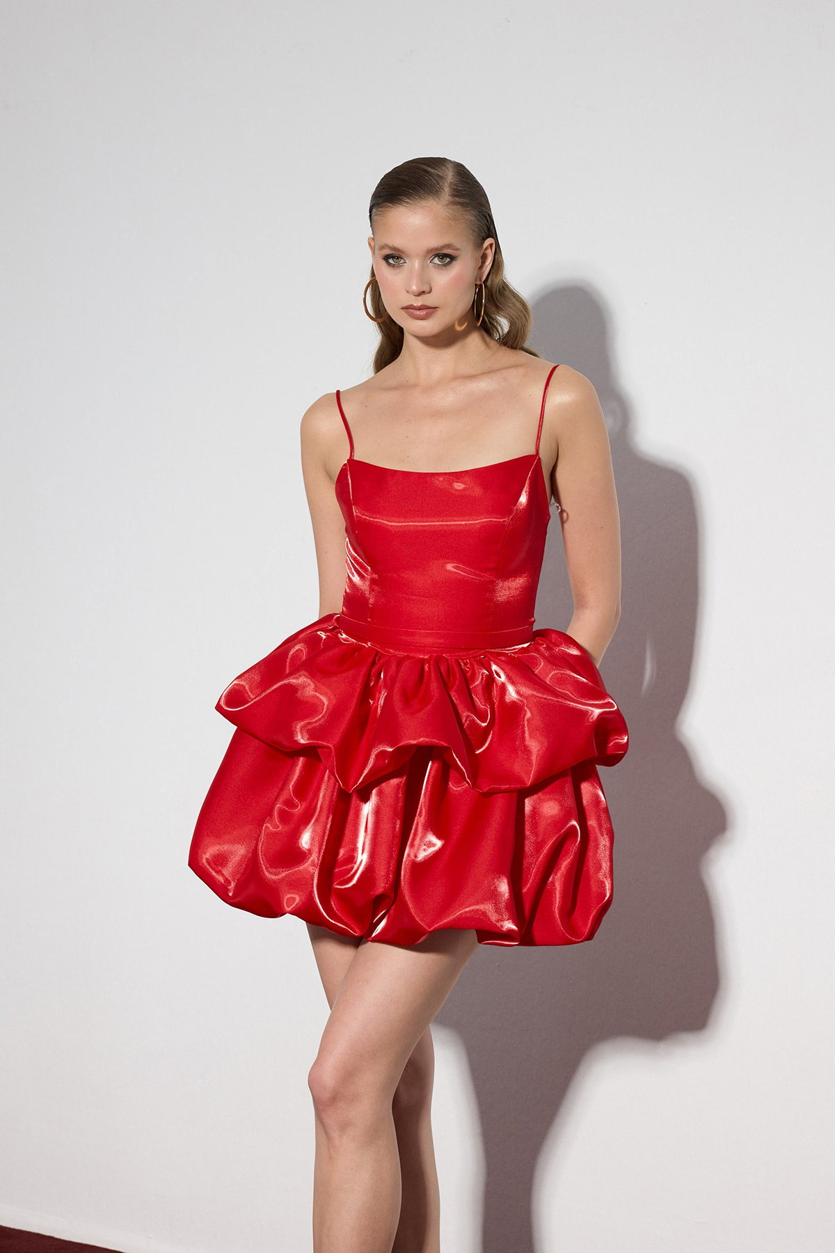 Detay: Askılı, kare yaka, dokuma tafta kumaş, mini, cepsiz, fermuarlı ve astarlı abiye elbise zarif detaylarıyla modern bir görünüm sunar. Tafta kumaşın dokusu ve astarlı yapısı konforu artırırken, kare yaka ve askılı tasarım feminen bir şıklık kazandırır. Mini boy, cepsiz form ve fermuar detayıyla sade ama etkileyici bir duruş sergileyen bu abiye, özel davetlerde stil sahibi bir tercih olur;