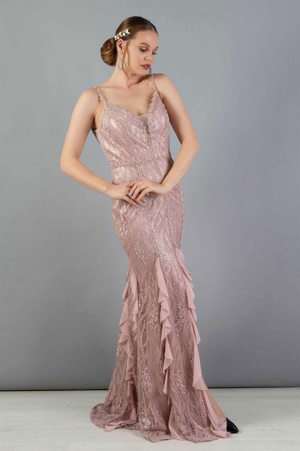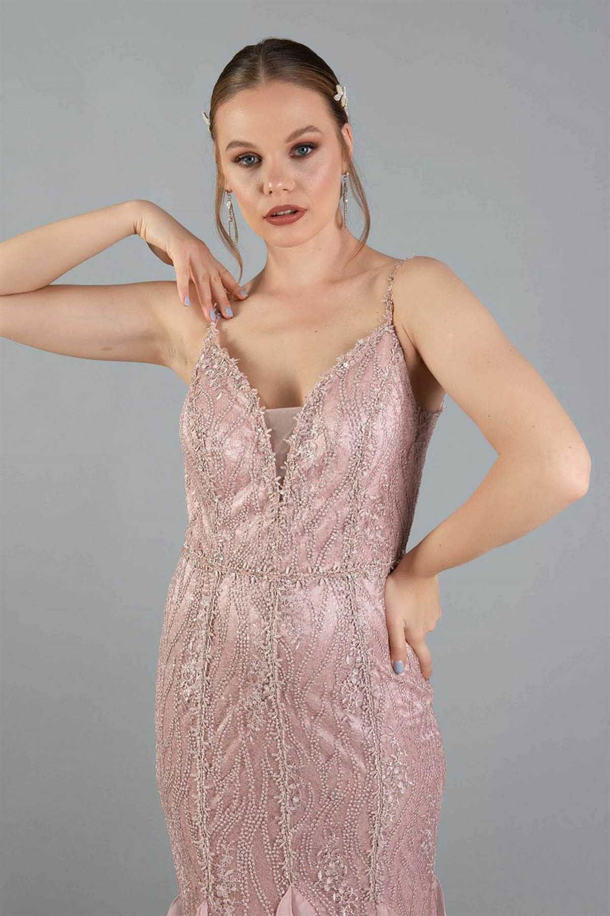 Detay: Göğsü gloplu, astarlı (açık renklerde çift kat astar), maxi boy, kolsuz, balık kalıp, kalp yaka, nakışlı-