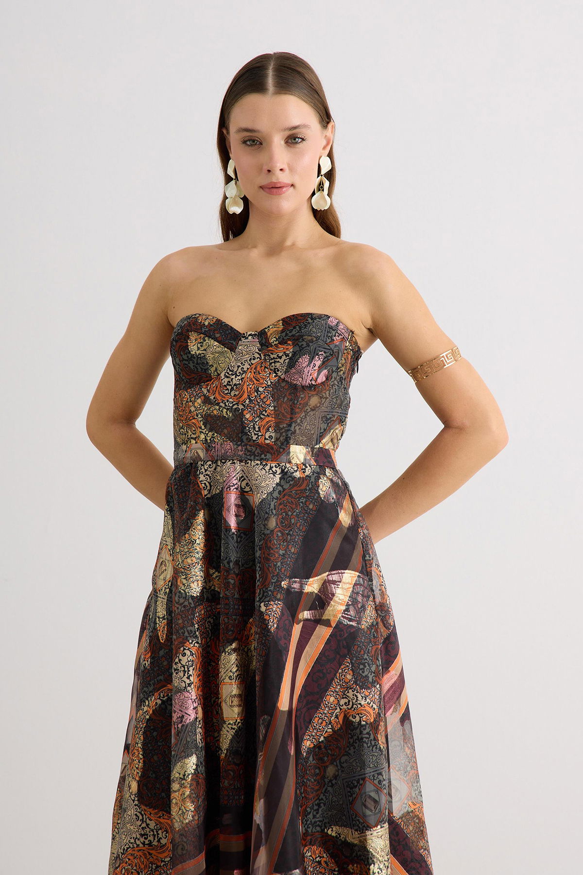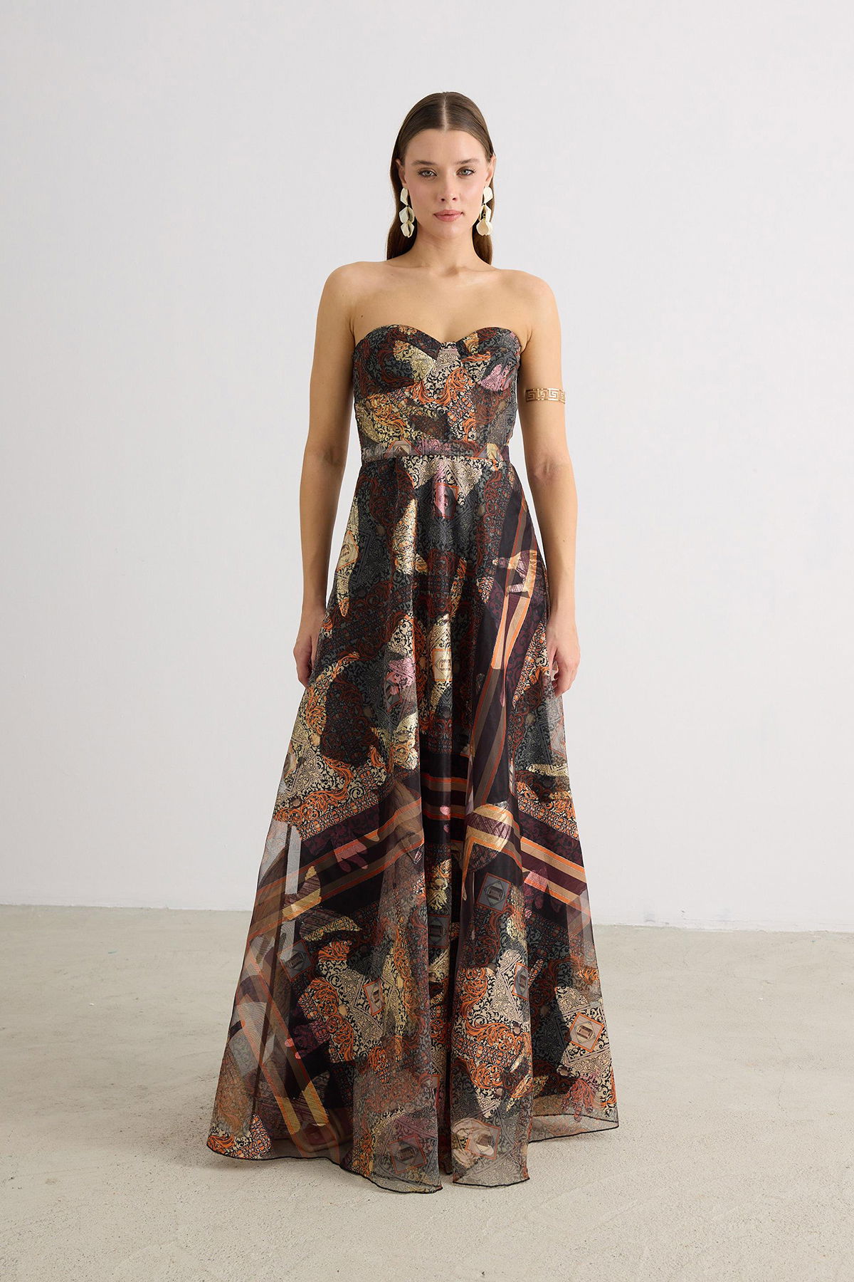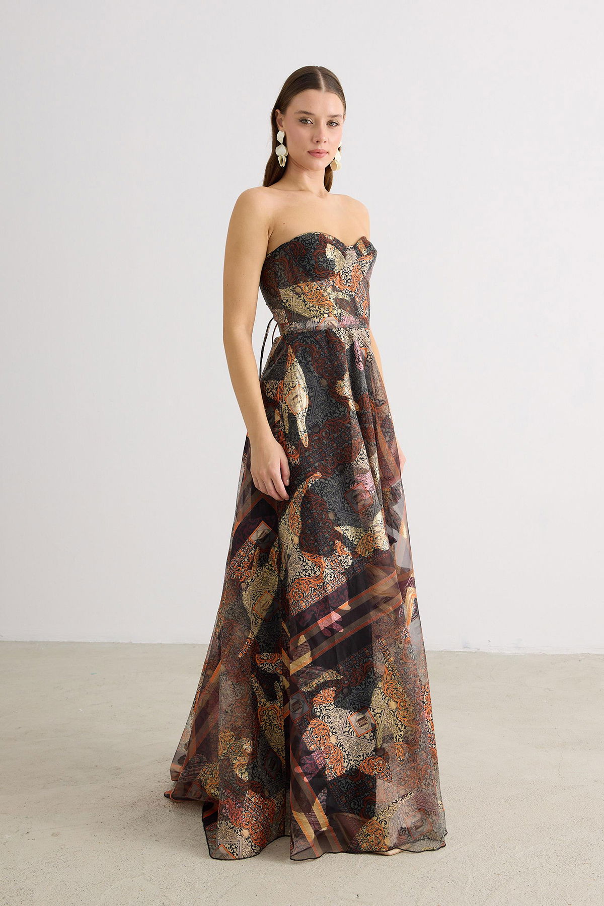 Detay: Astarlı (açık renklerde çift kat astar), maxi boy, kolsuz ve jakarlı kumaştan tasarlanan bu abiye elbise; dar kalıp ve straplez formuyla zarif bir siluet sunar. Dekoltesiz, cepsiz ve fermuarlı yapısı modern sadeliği ön plana çıkarırken, kemersiz tasarımıyla sofistike bir duruş sergiler. Özel davetlerde şıklığıyla öne çıkan bu abiye, zarafet ve konforu bir arada sunan ideal bir seçimdir;