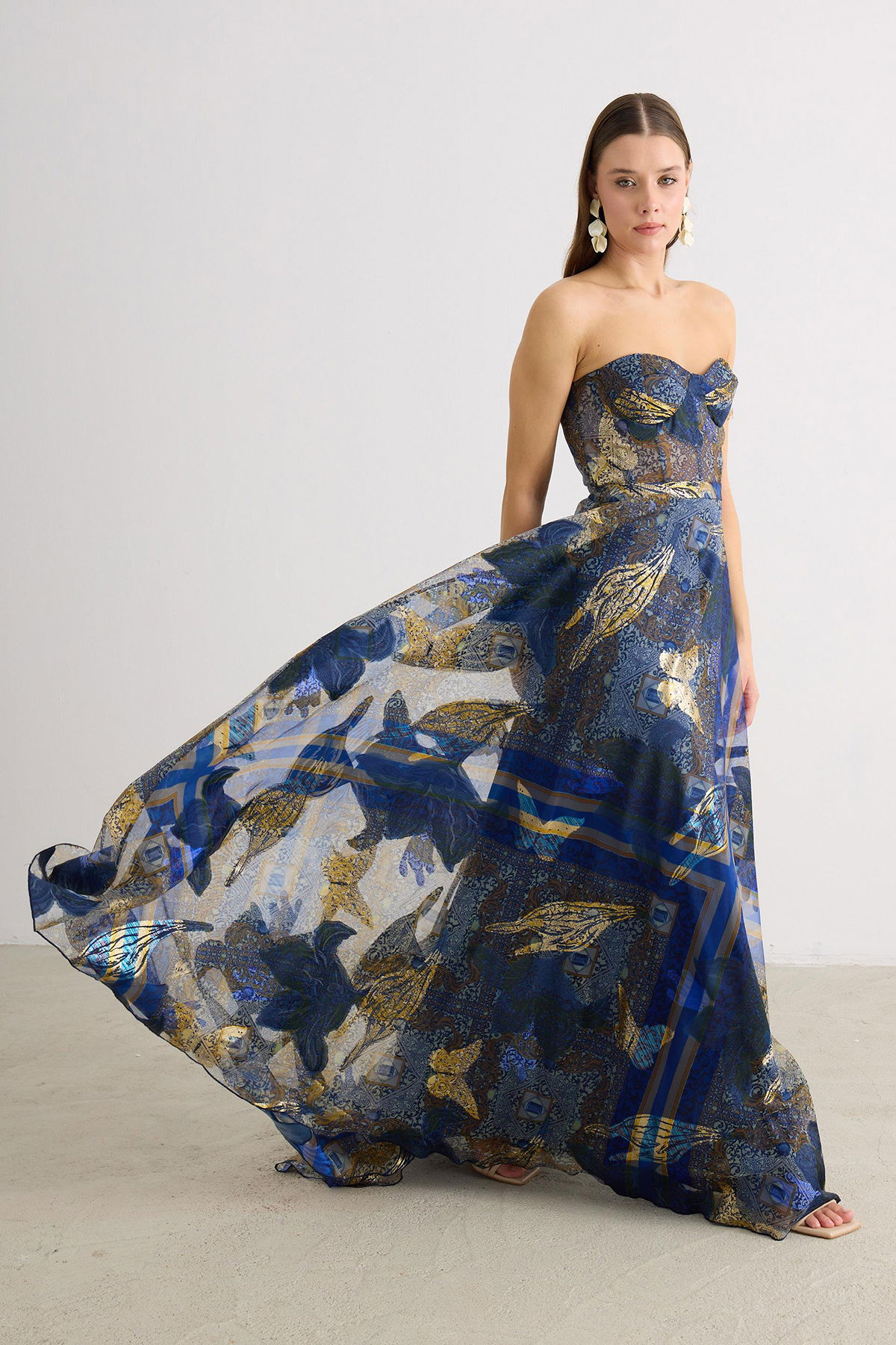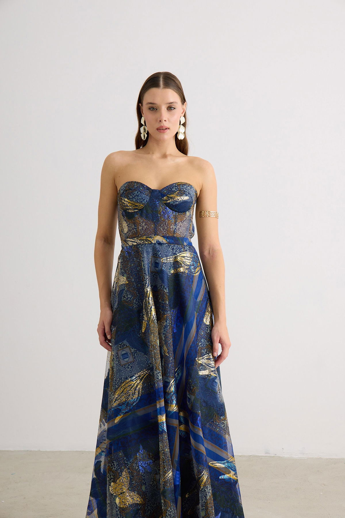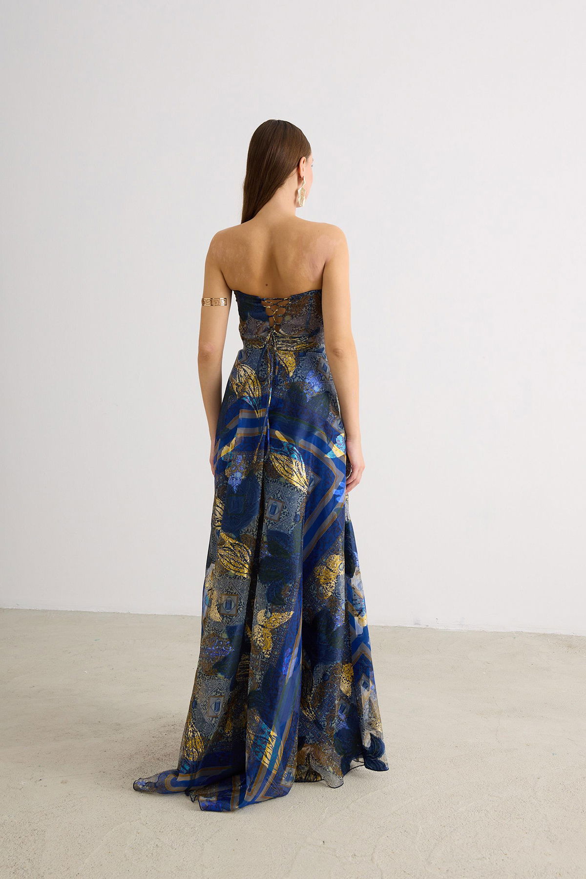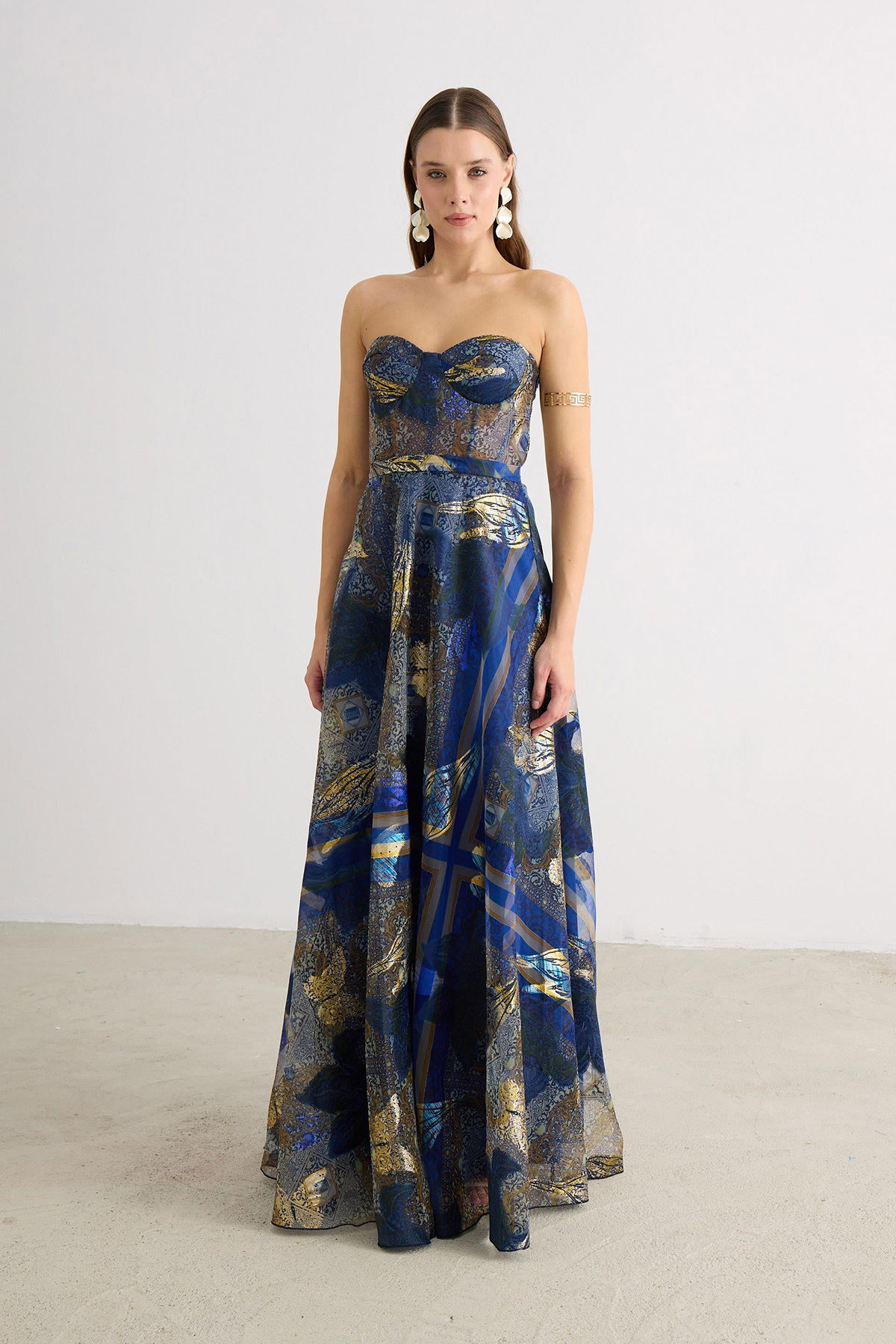 Detay: Astarlı (açık renklerde çift kat astar), maxi boy, kolsuz ve jakarlı kumaştan tasarlanan bu abiye elbise; dar kalıp ve straplez formuyla zarif bir siluet sunar. Dekoltesiz, cepsiz ve fermuarlı yapısı modern sadeliği ön plana çıkarırken, kemersiz tasarımıyla sofistike bir duruş sergiler. Özel davetlerde şıklığıyla öne çıkan bu abiye, zarafet ve konforu bir arada sunan ideal bir seçimdir;