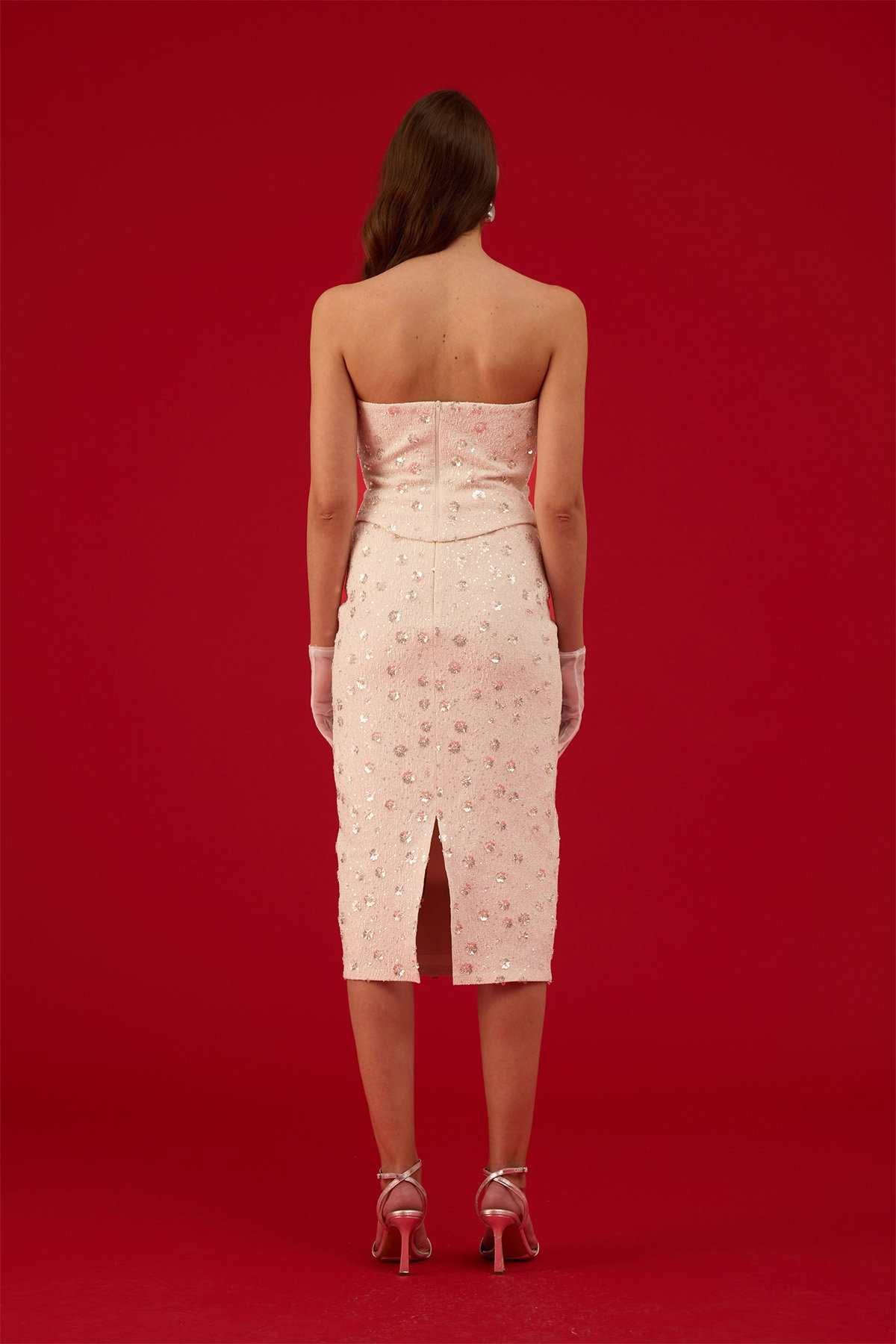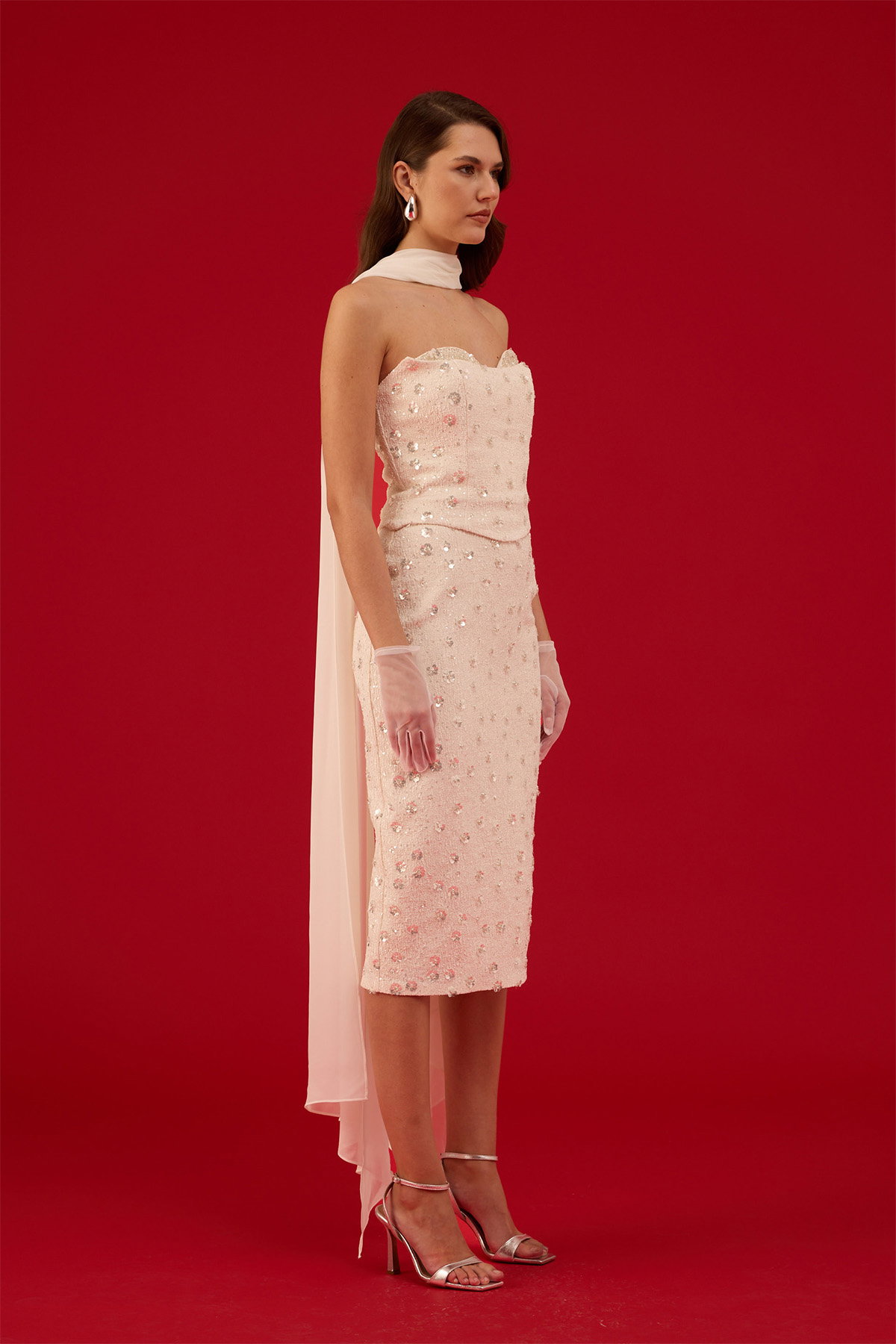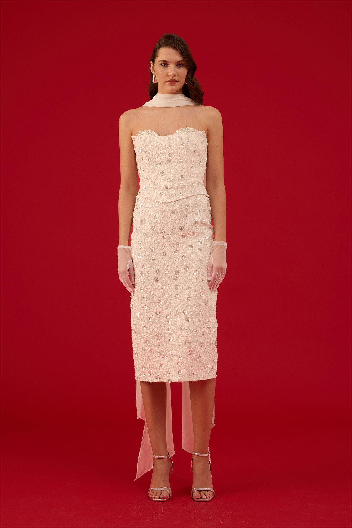 Detay: Midi boy, kolsuz, straplez, payetli, dokuma, dekolteli, fermuar kapamalı, astarlı, kemersiz söz-nikah elbisesi;