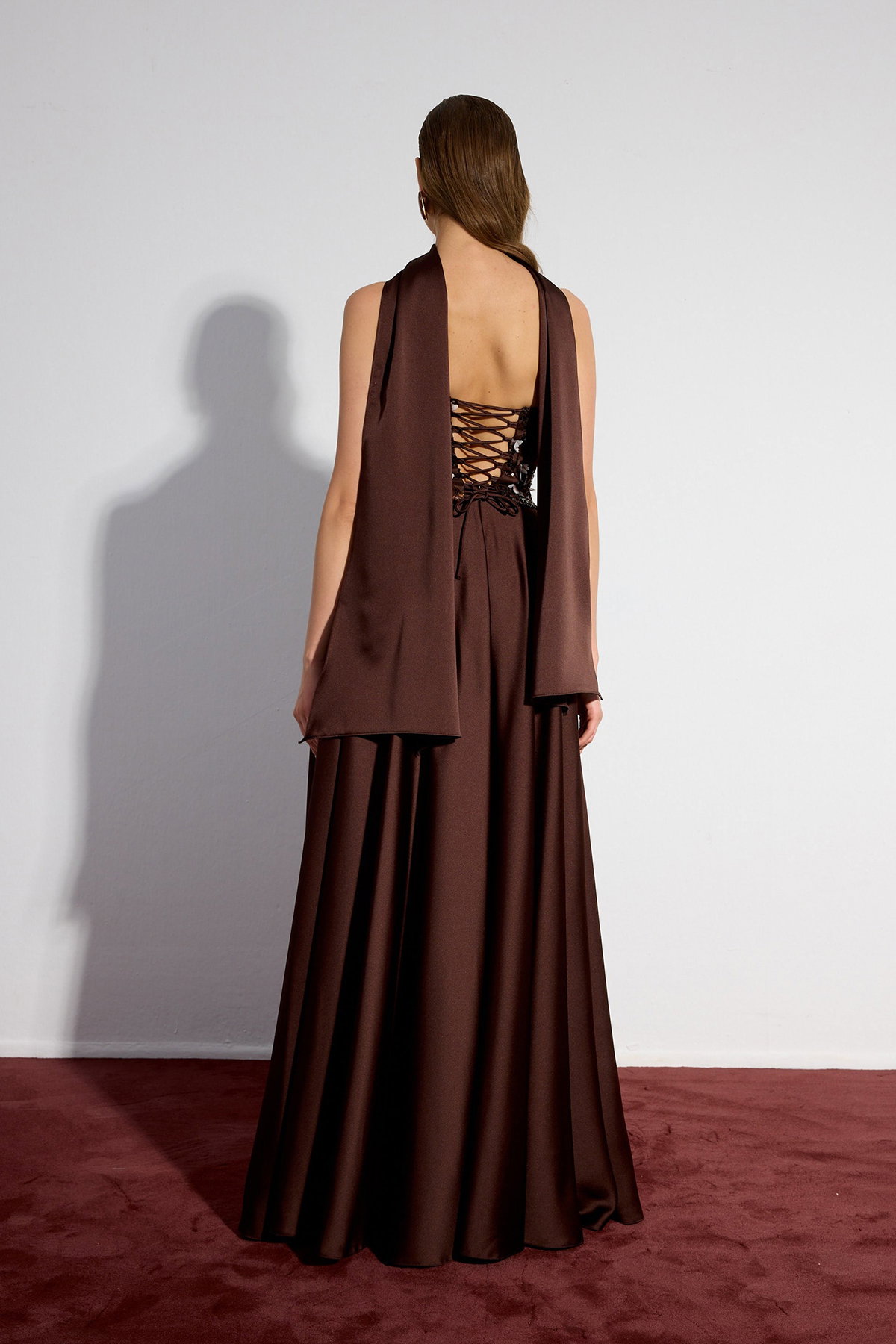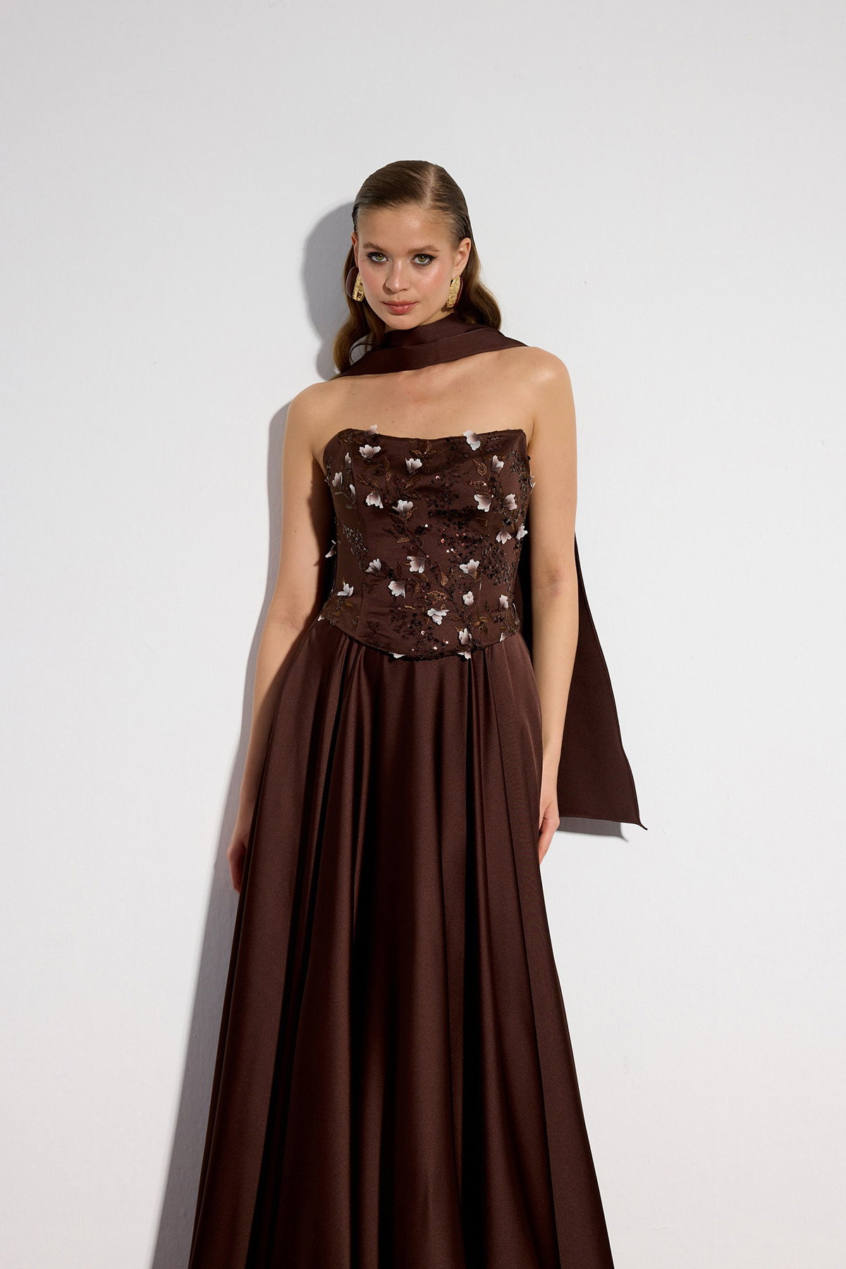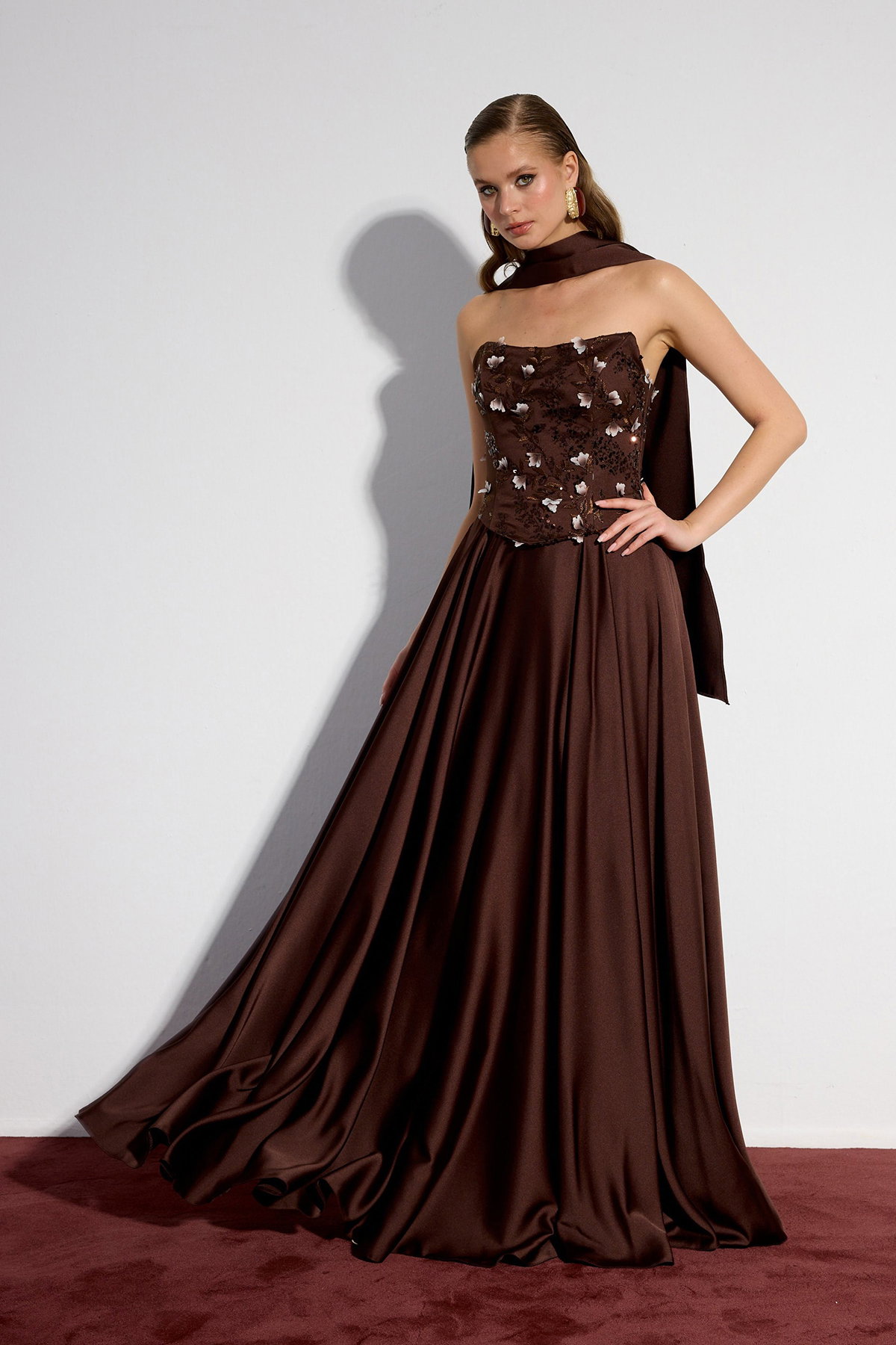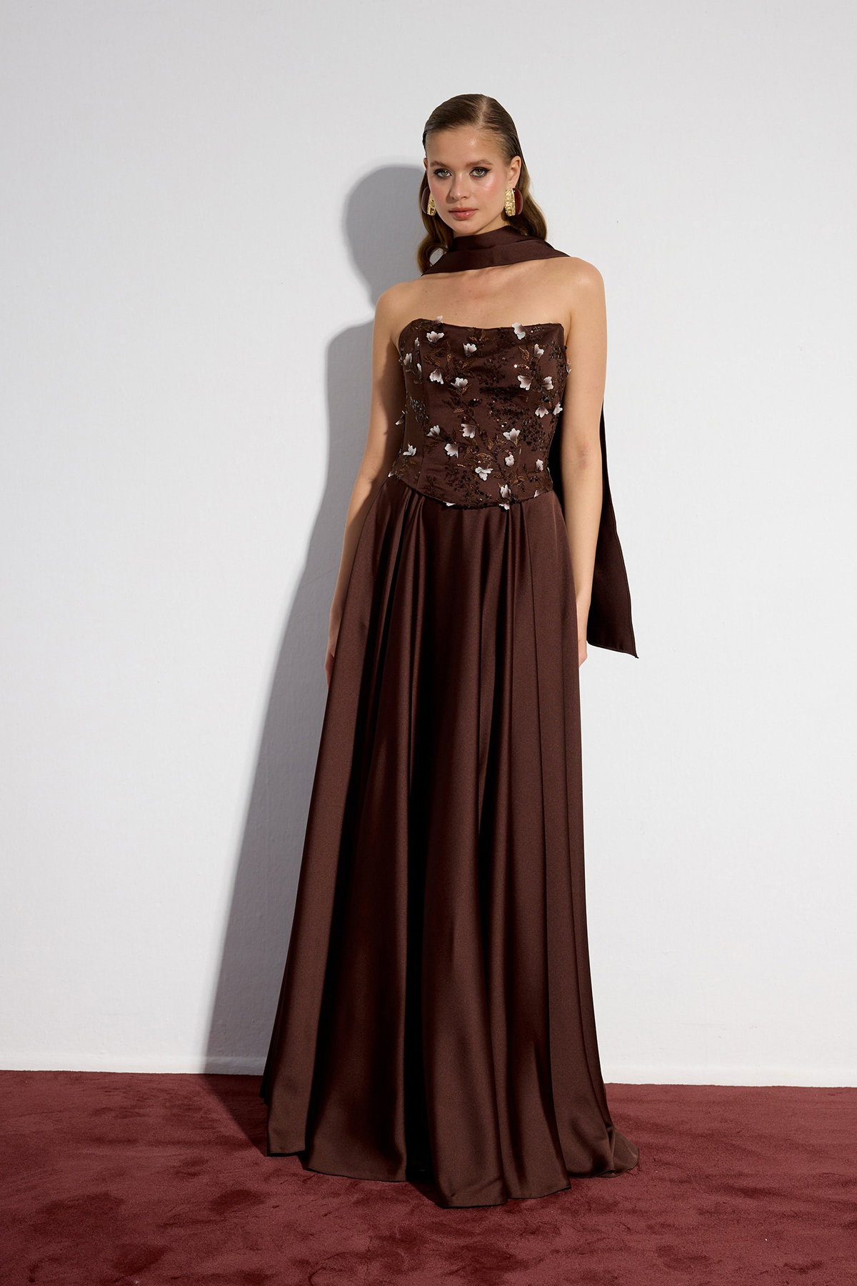 Carmen Kadın Straplez Şallı İşlemeli Saten Uzun Abiye Elbise 58699 Kahverengi