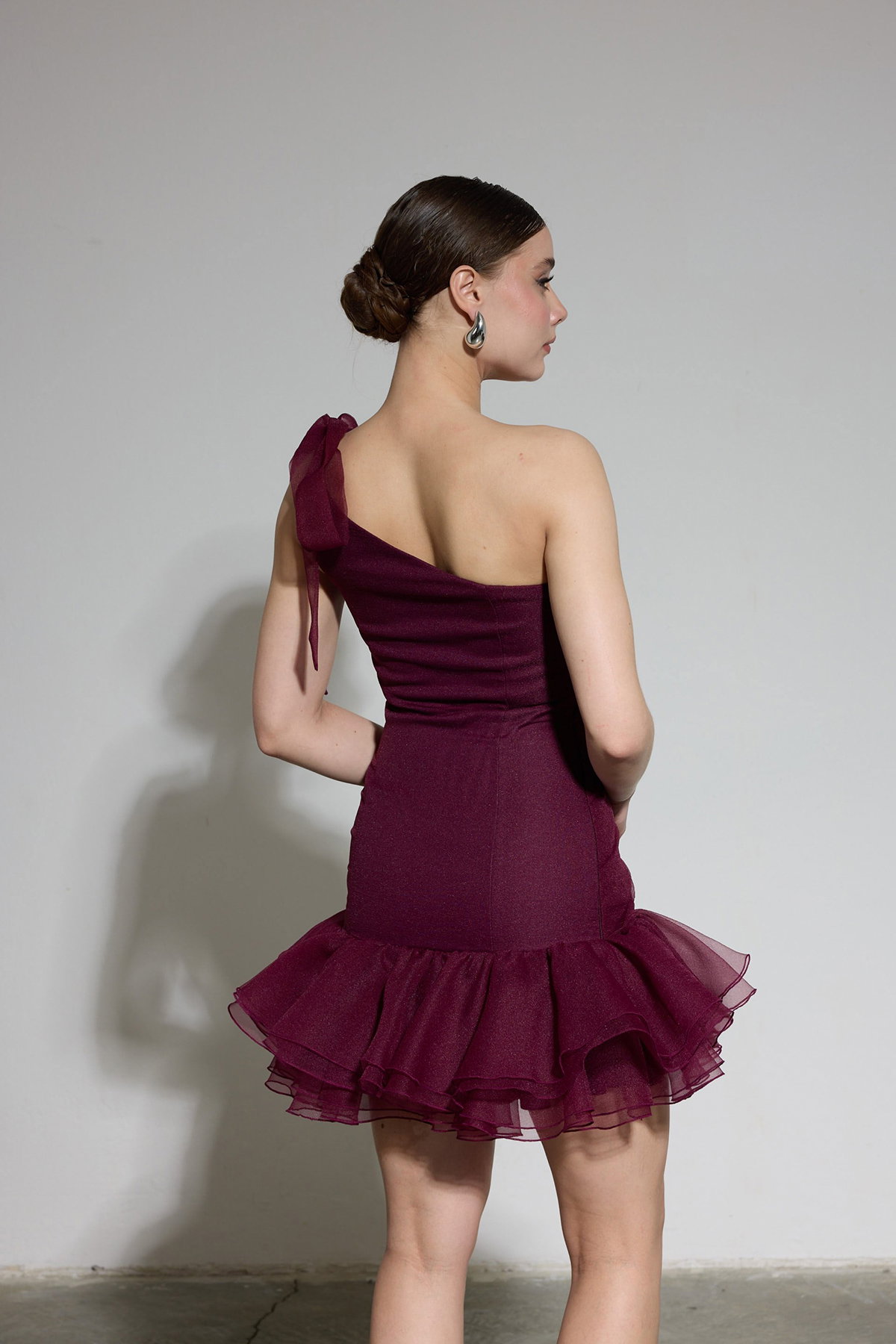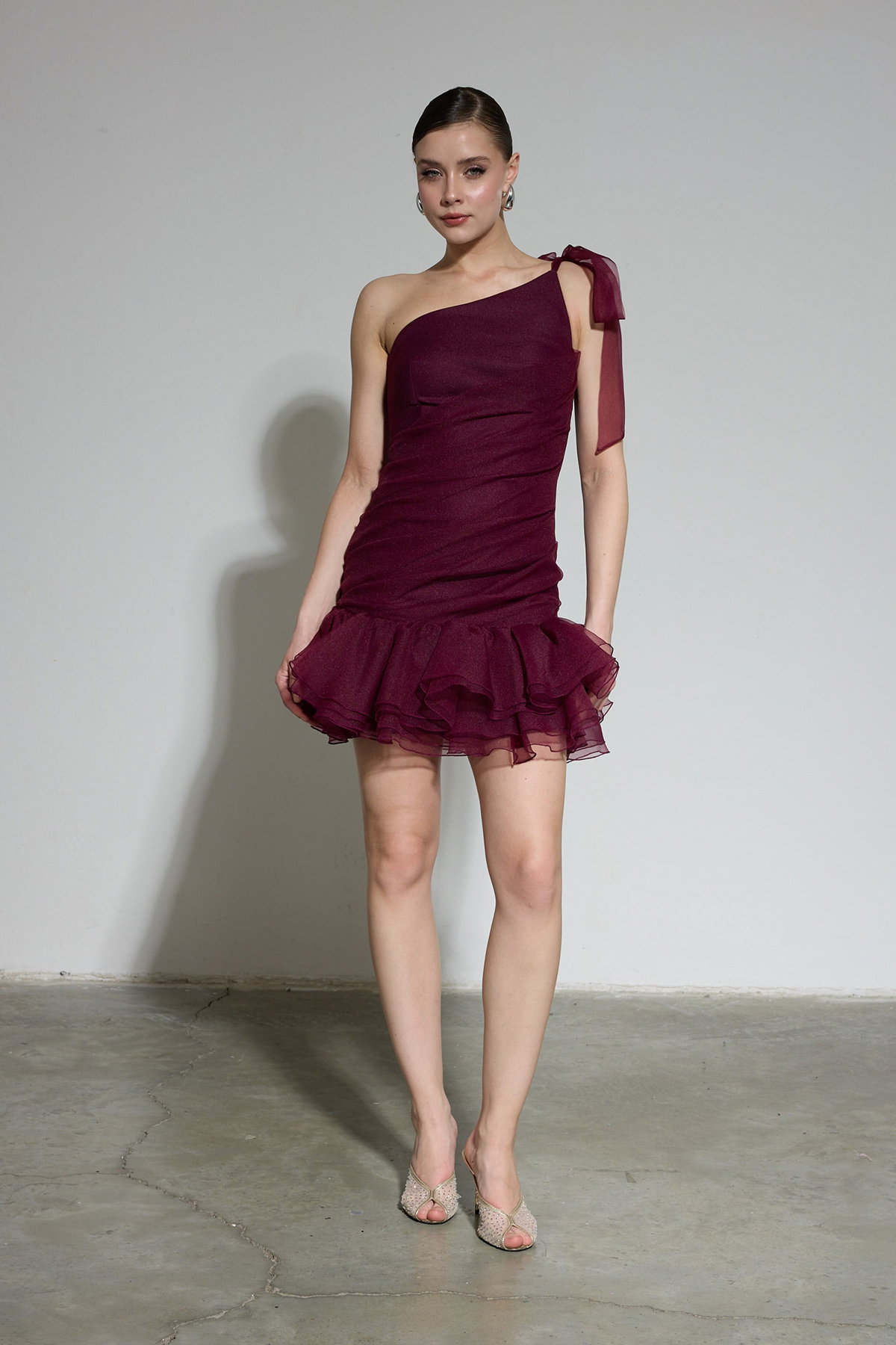 Carmen Kadın Tek Kol Fırfırlı Organze Abiye Elbise 58619 Bordo