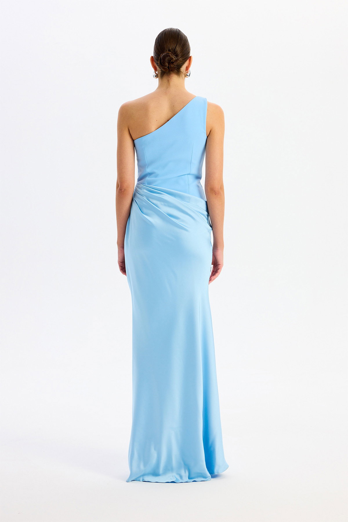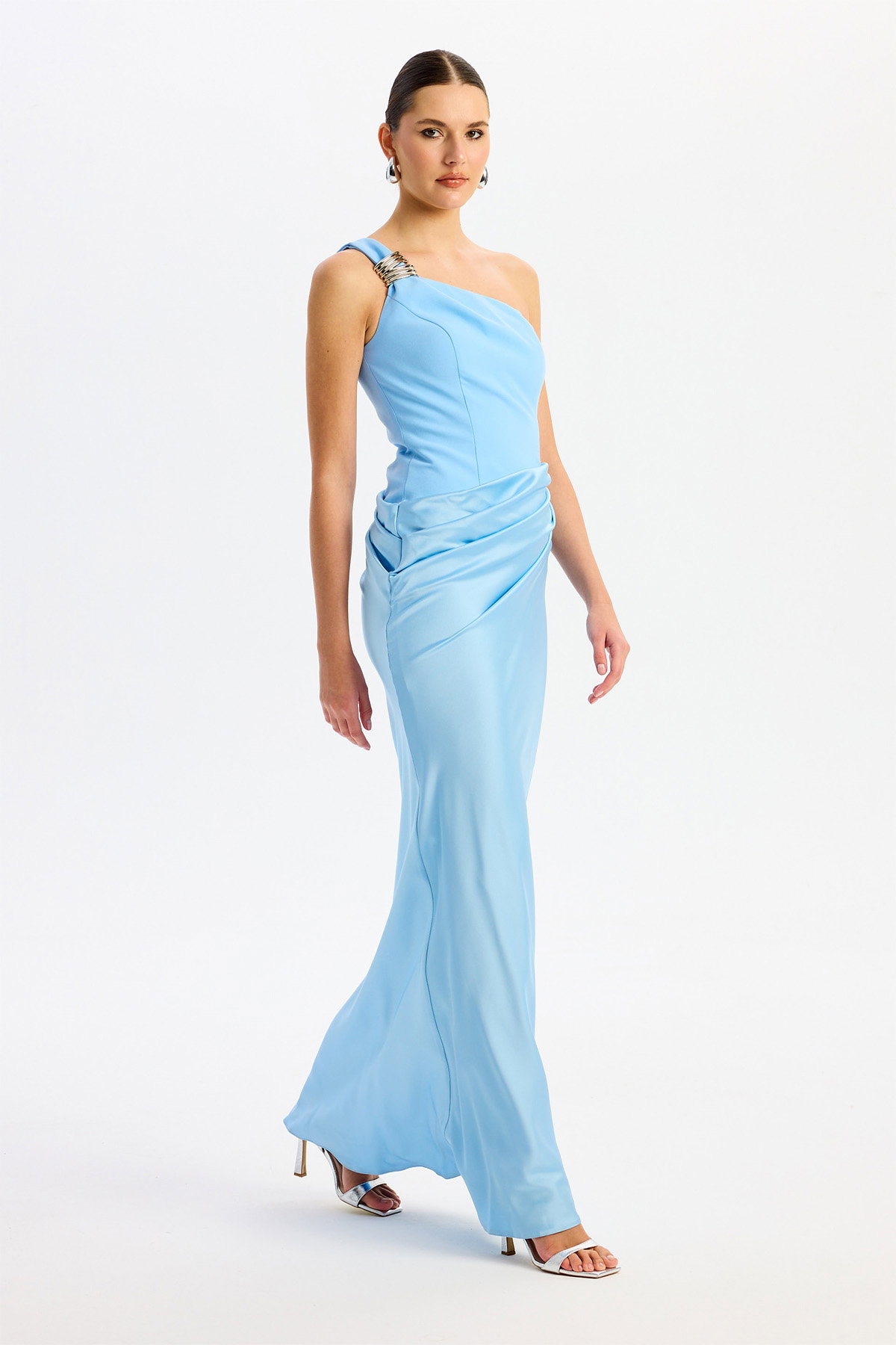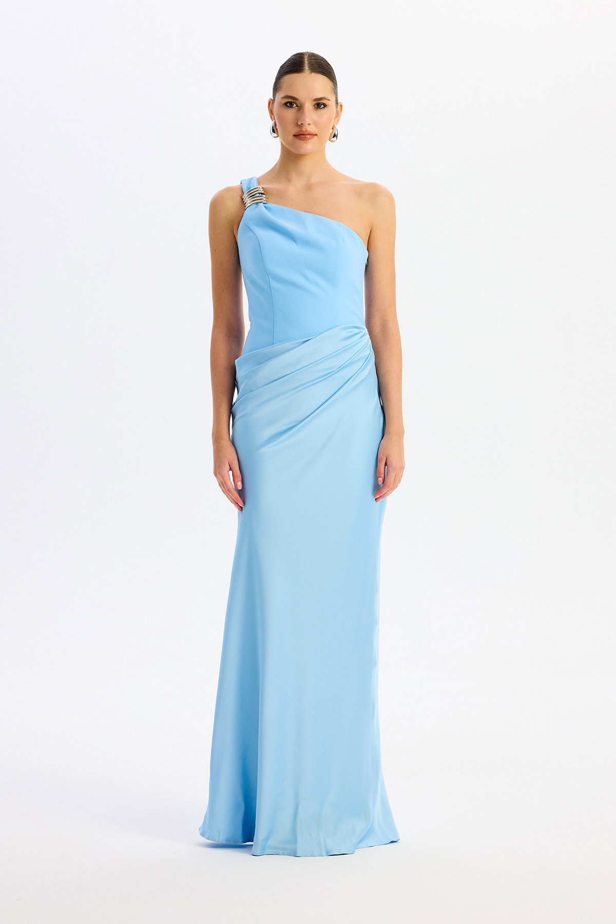 Detay: Astarlı (açık renklerde çift kat astar) ve maxi boy tasarımıyla öne çıkan bu abiye elbise, kolsuz ve tek kol detayıyla modern bir şıklık sunar. Krep ve saten kumaşın zarif birleşimi, asimetrik yaka ve omuzdaki toka detayıyla göz alıcı bir görünüm sağlar. Dekoltesiz, cepsiz ve fermuarlı yapısıyla konforu ön planda tutan bu özel abiye, davetlerde stil sahibi kadınların tercihi olur.;