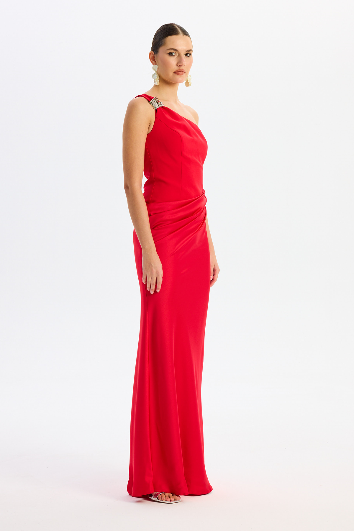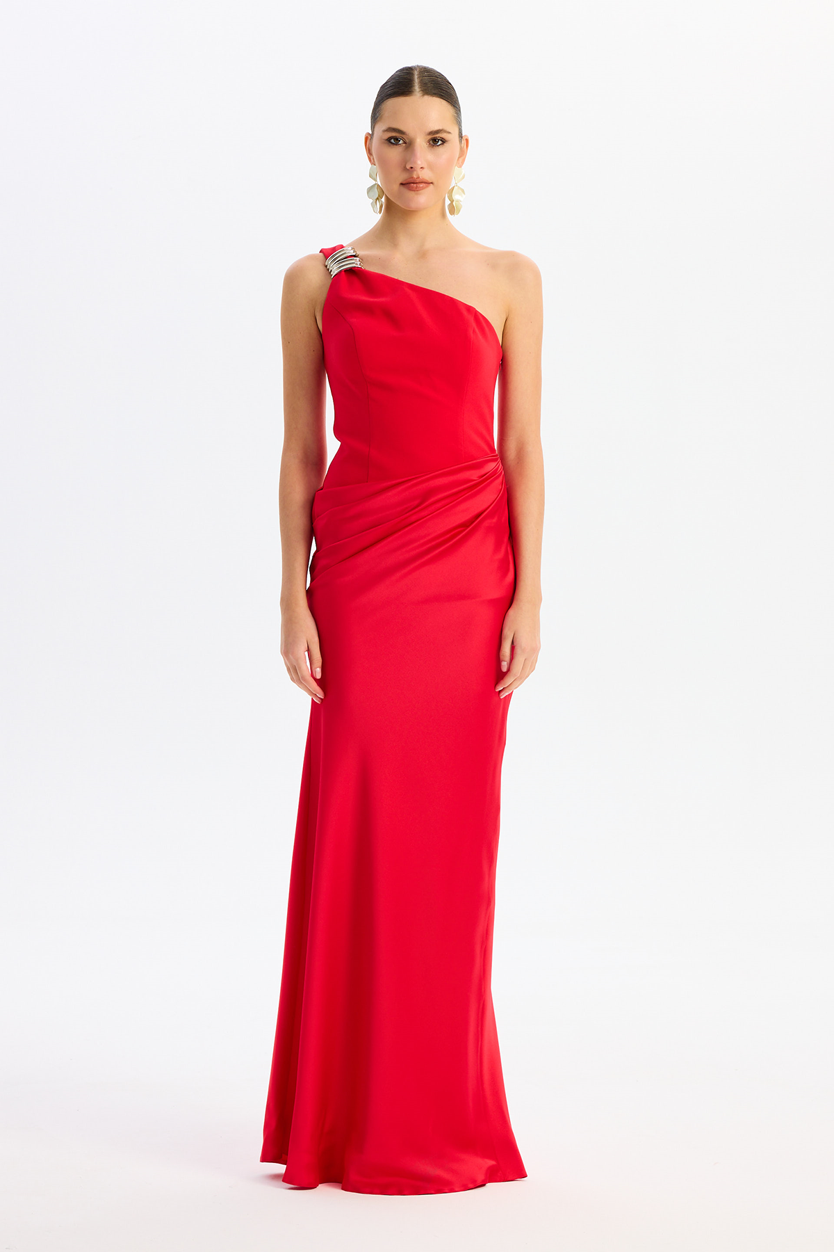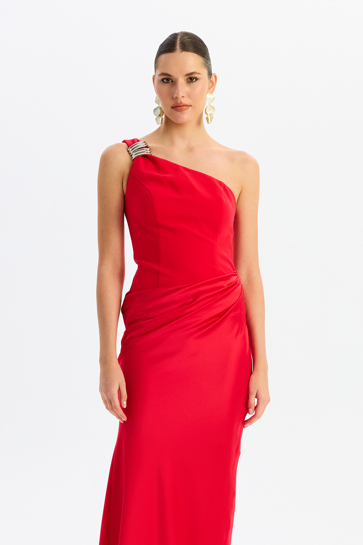 Detay: Astarlı (açık renklerde çift kat astar) ve maxi boy tasarımıyla öne çıkan bu abiye elbise, kolsuz ve tek kol detayıyla modern bir şıklık sunar. Krep ve saten kumaşın zarif birleşimi, asimetrik yaka ve omuzdaki toka detayıyla göz alıcı bir görünüm sağlar. Dekoltesiz, cepsiz ve fermuarlı yapısıyla konforu ön planda tutan bu özel abiye, davetlerde stil sahibi kadınların tercihi olur.;