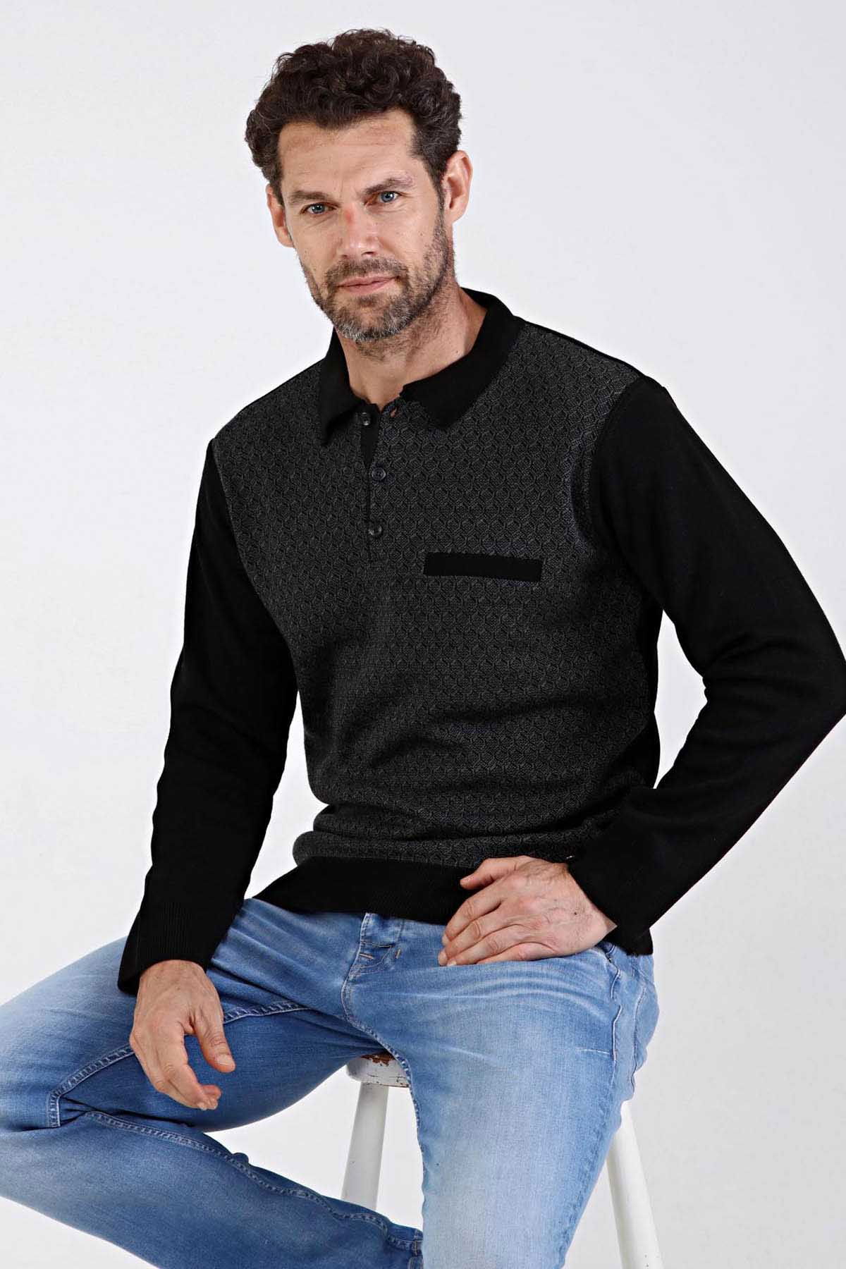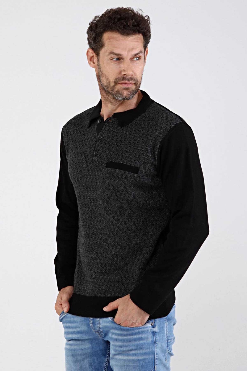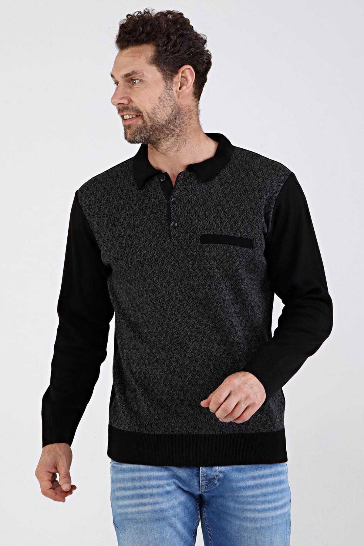 Çizgi Triko Erkek Polo Yaka Çelik Örgü Triko Kazak 4610F Siyah