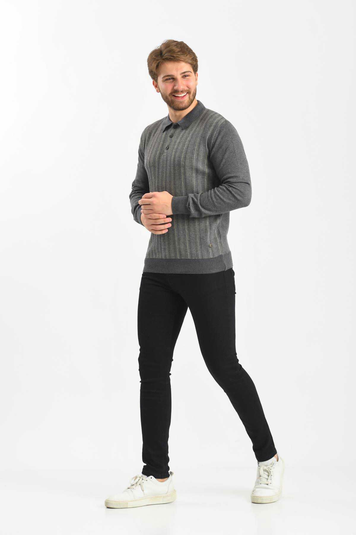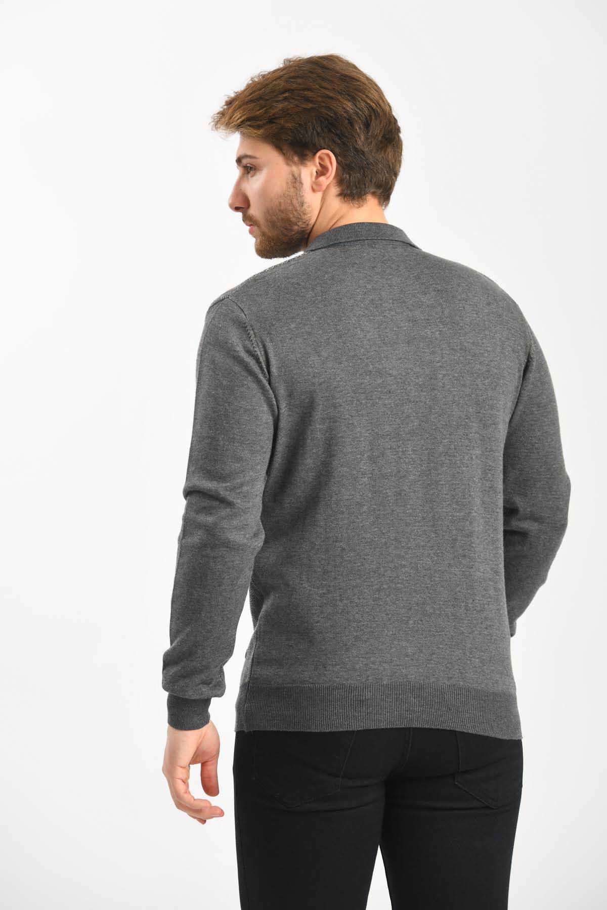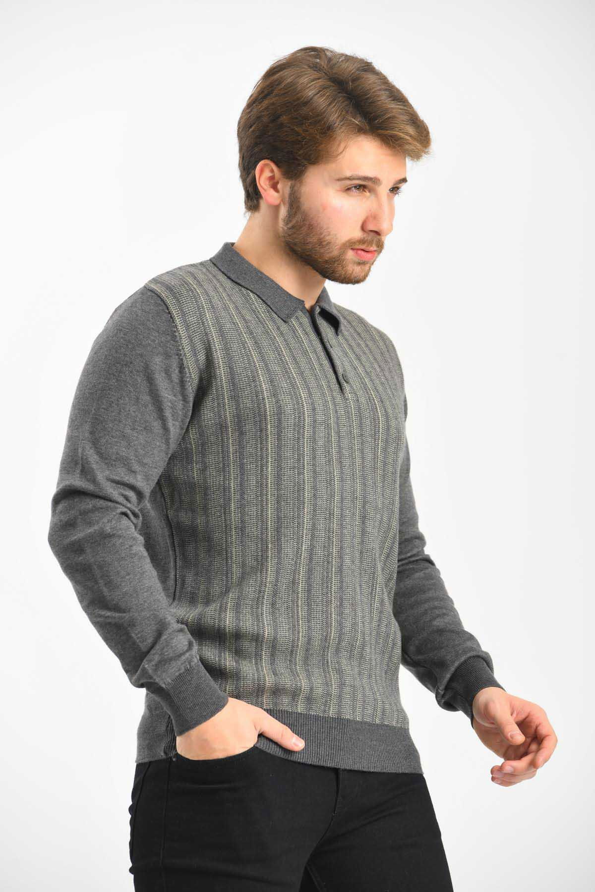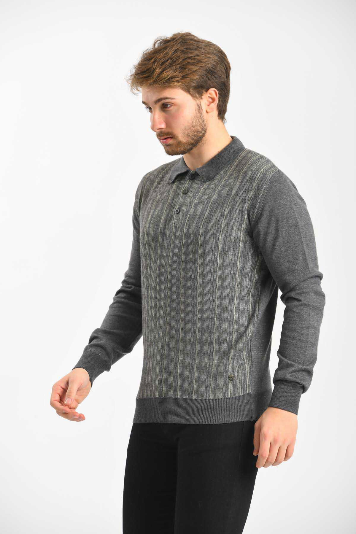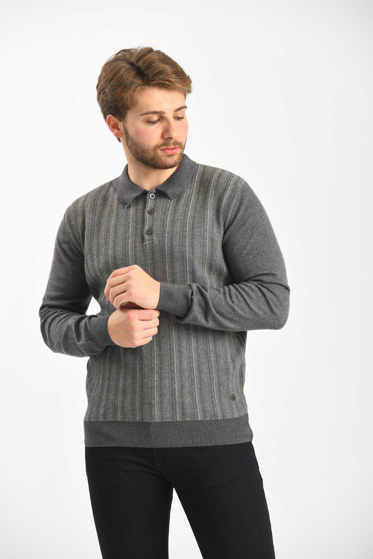 Çizgi Triko Erkek Polo Yaka Pamuklu Triko Kazak 4451F Koyu Gri