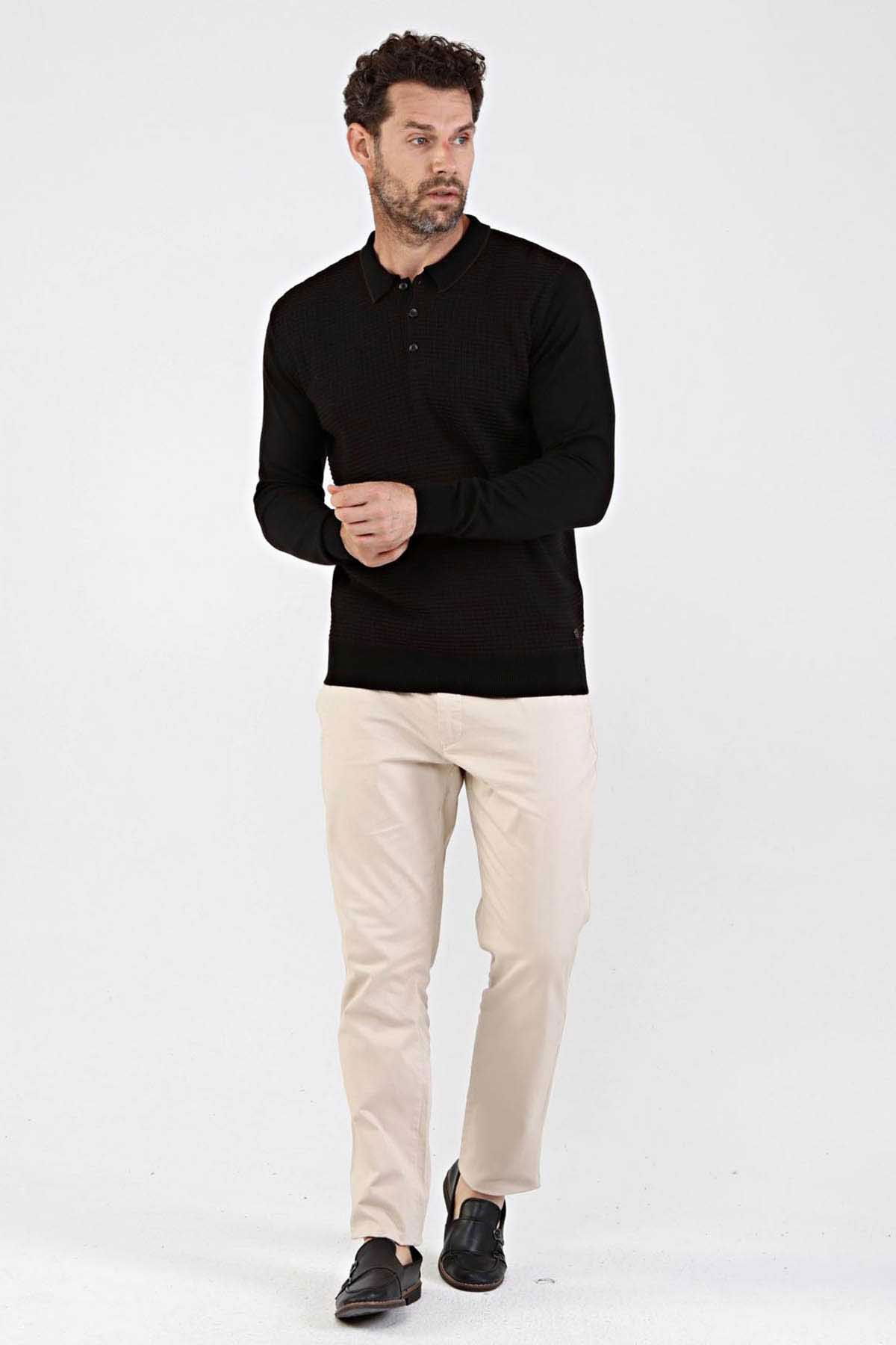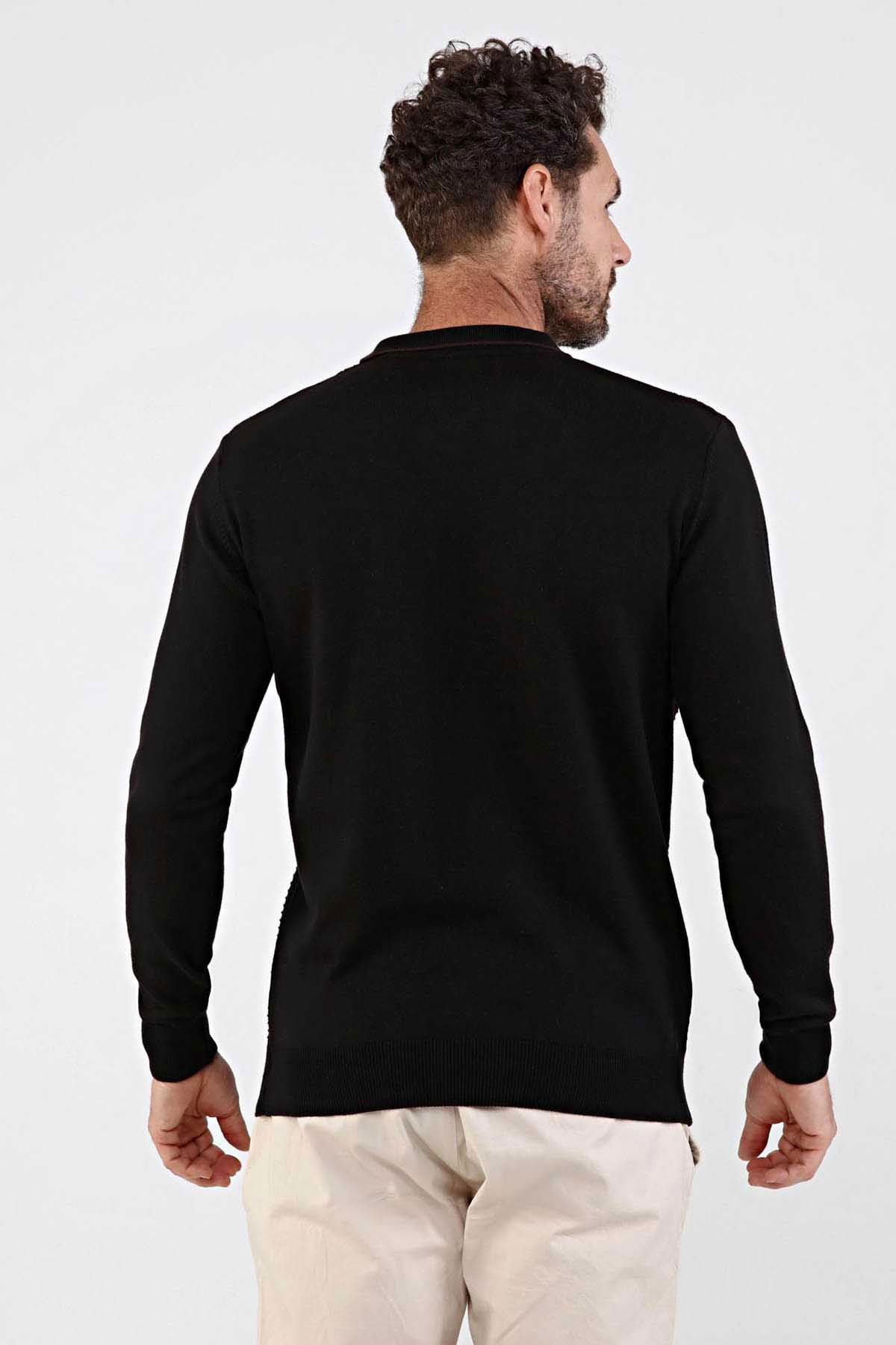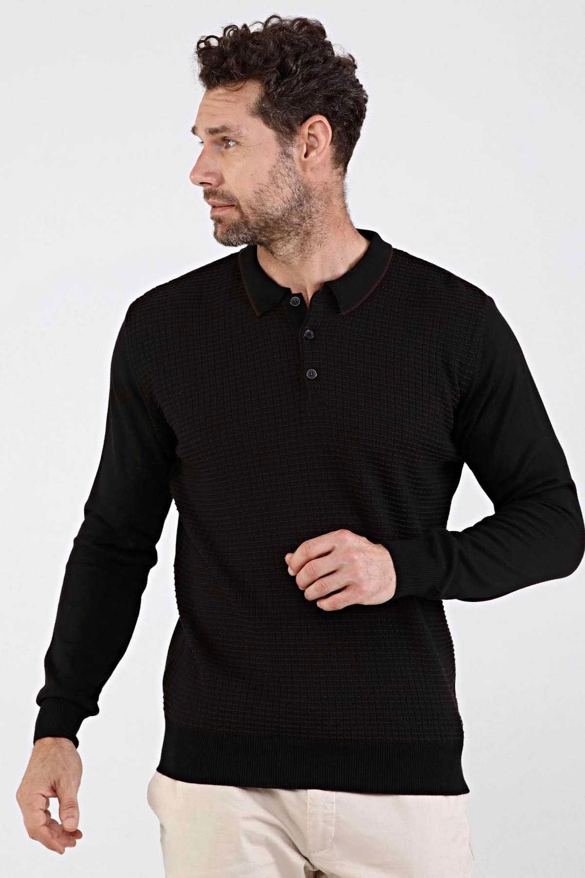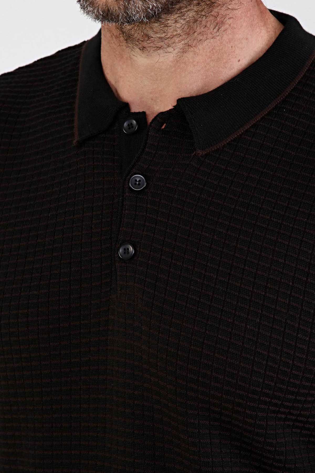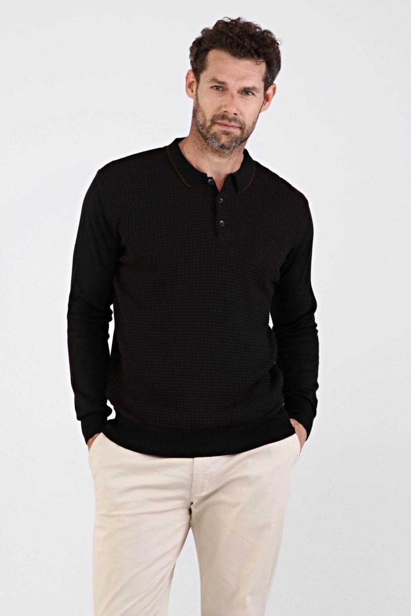 Detay: Desenli, kol ve bel lastikli dokuma, polo yaka kazak;