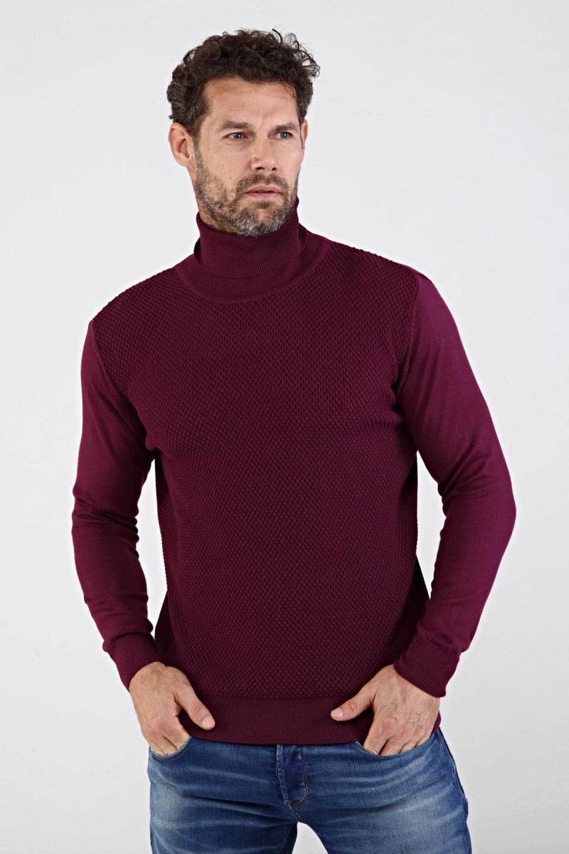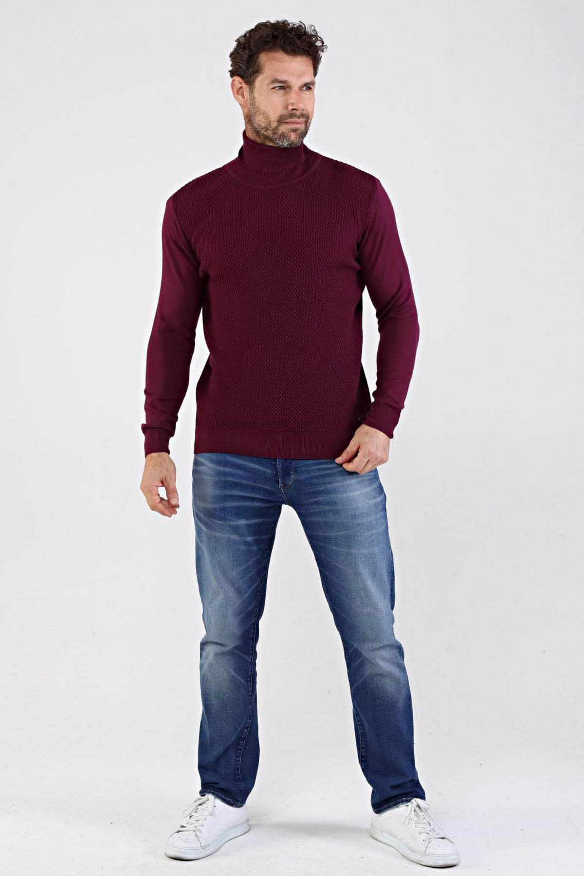 Çizgi Triko Erkek Tam Balıkçı Yaka Pamuklu Triko Kazak 4669E Mürdüm