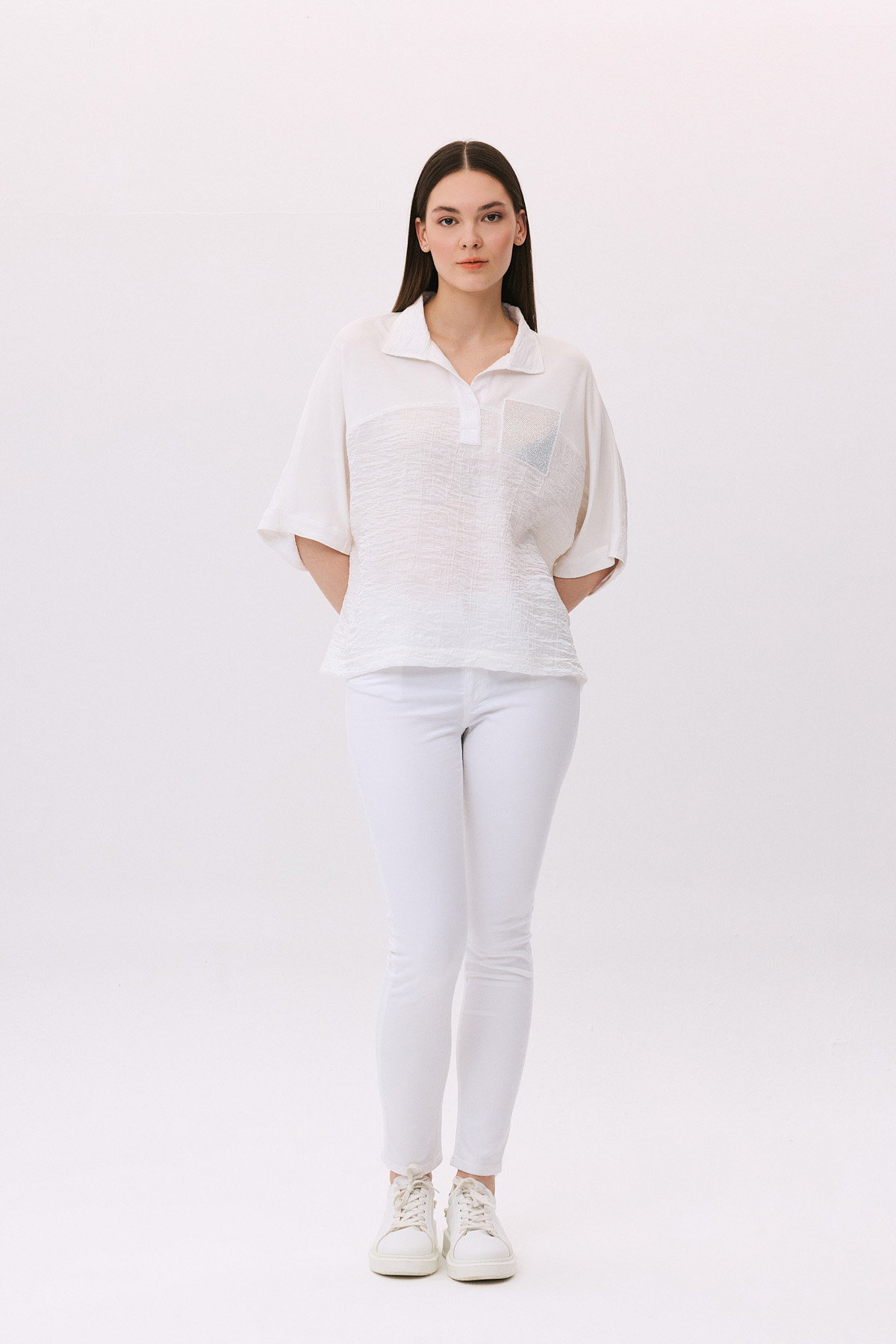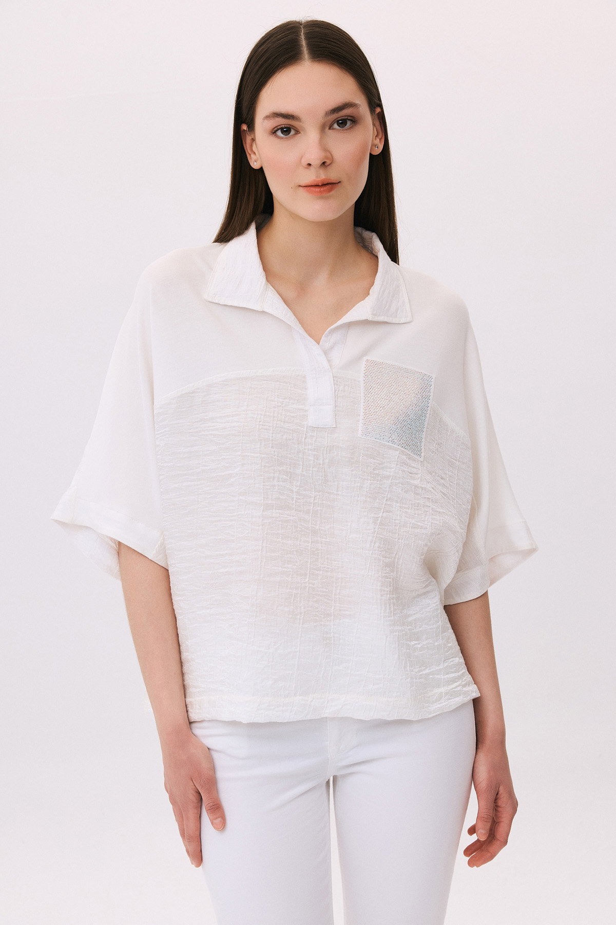 Detay: Polo yaka, kısa kollu, düşük kollu, kendinden desenli, süs cepli ve cebi taş işlemeli bu model bluz rahat bir kullanım sunar. Modern tasarımıyla günlük kombinlerde şıklığı öne çıkarırken penye dokusu sayesinde gün boyu konfor sağlar. Taş işlemeli cep ve desenli yapısı ise zarif bir dokunuş katarak kullanışlı bir tercih haline gelir;