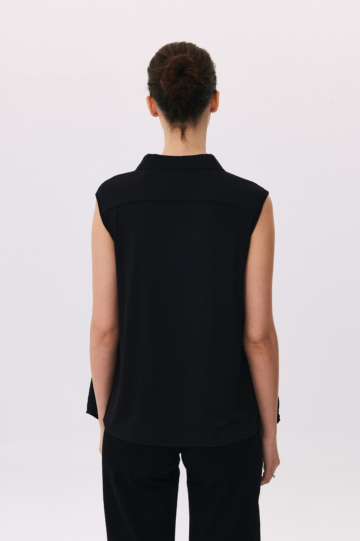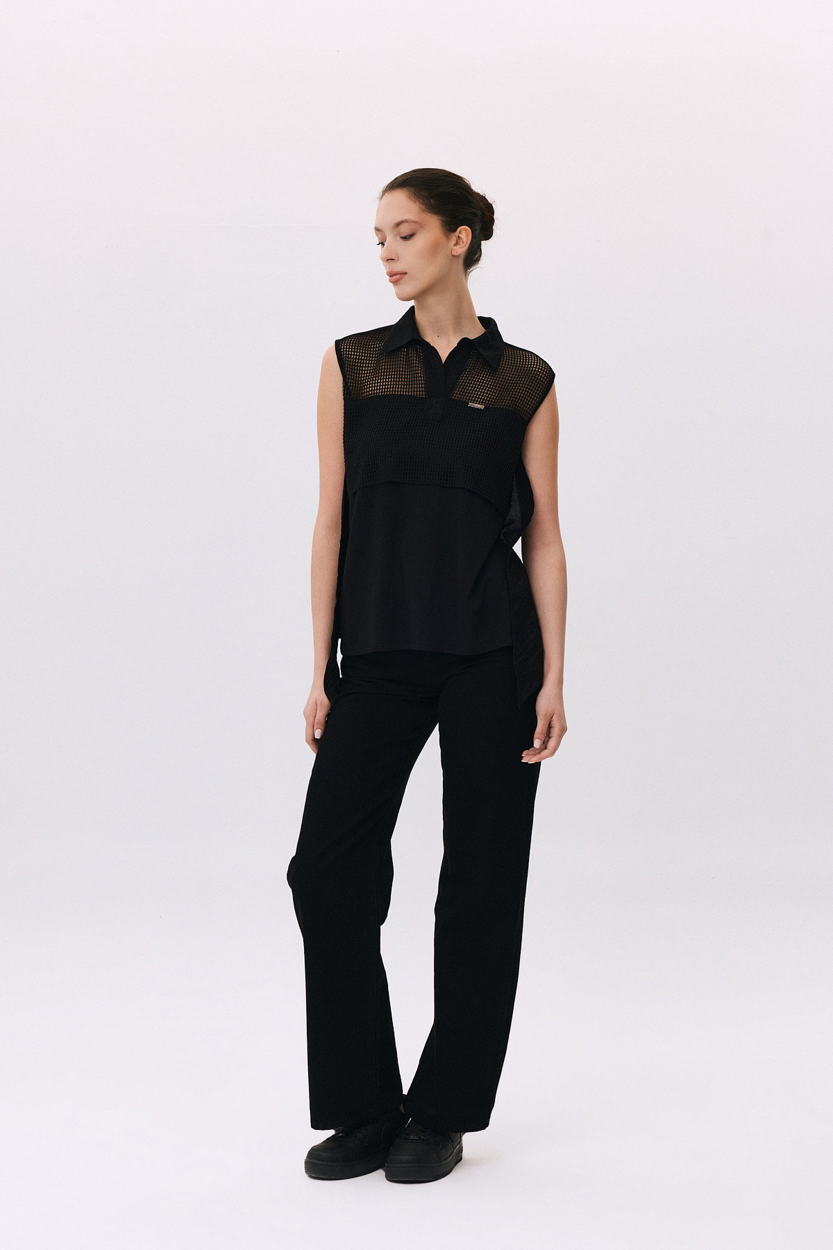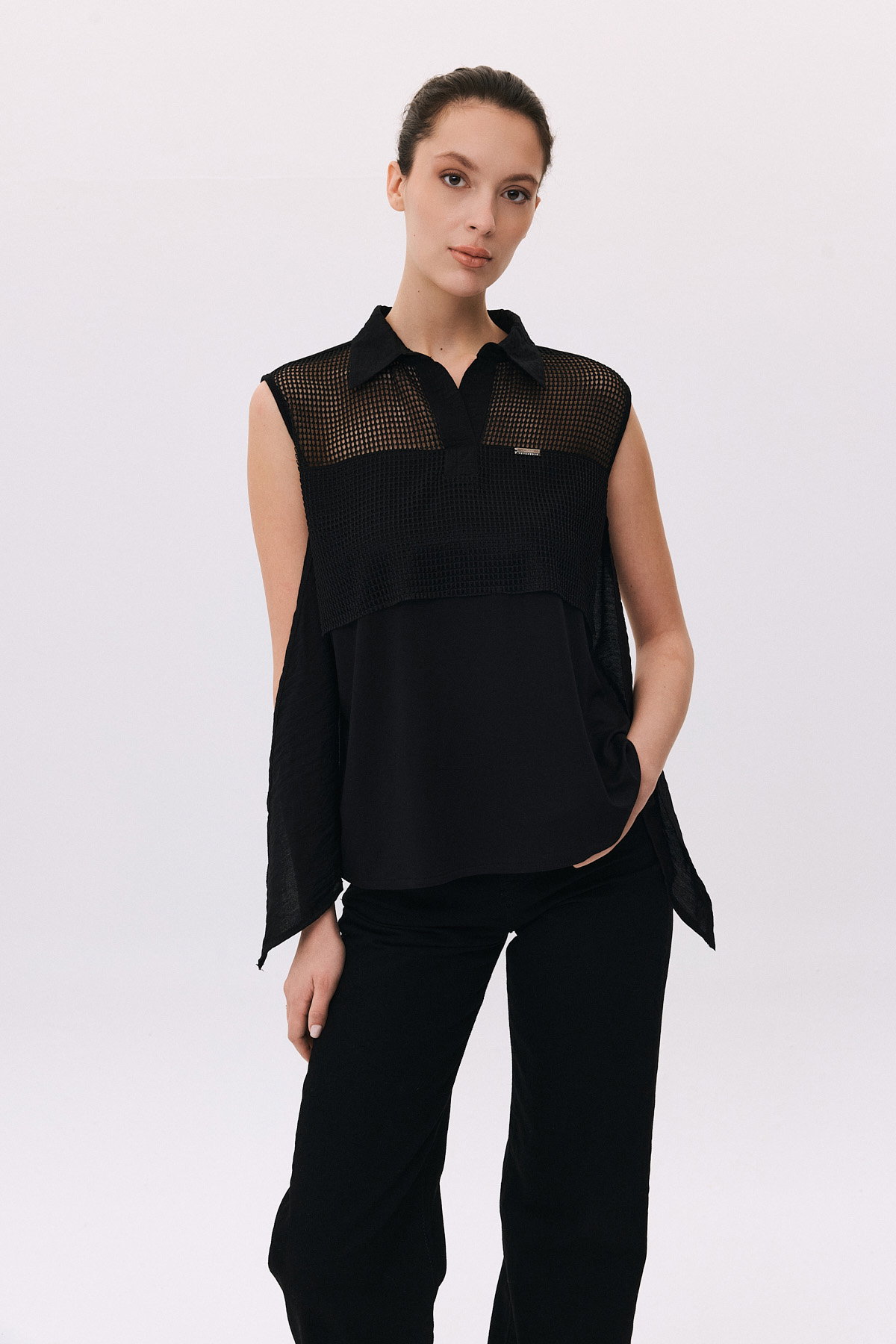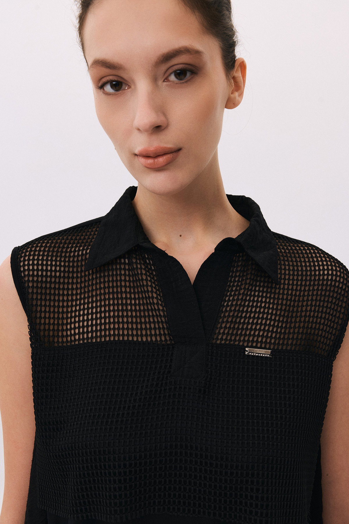 Detay: Kolsuz, polo yaka bu penye bluz ön kısmının yarısı fileli tasarımıyla modern bir görünüm sunar. İki yan tarafındaki penyeden ek-kapak detayları modele özgün bir dokunuş katarken, penye kumaş rahatlığı günlük kullanım için idealdir. Bu özel bluz, hem spor hem de şık kombinlerde tarz sahibi bir seçenek olarak öne çıkar;