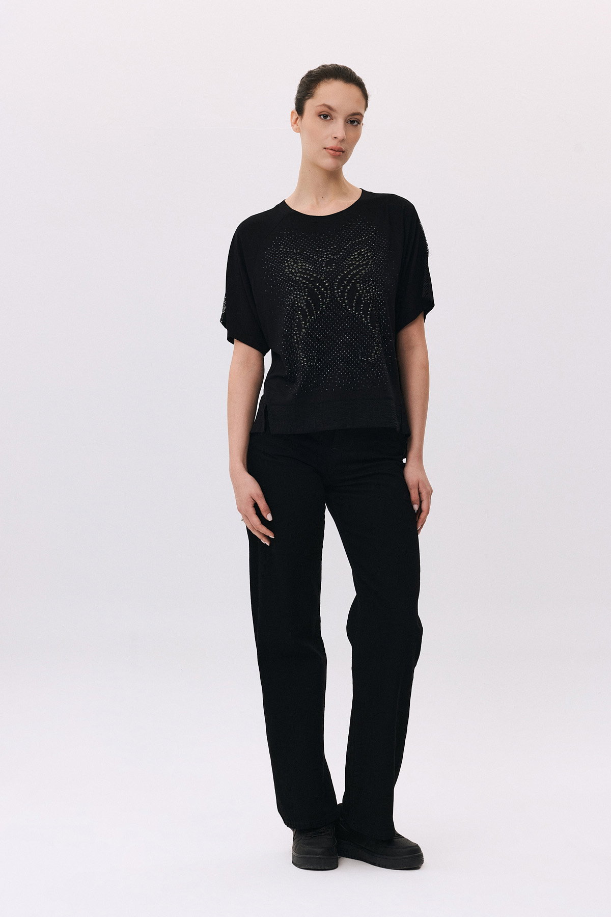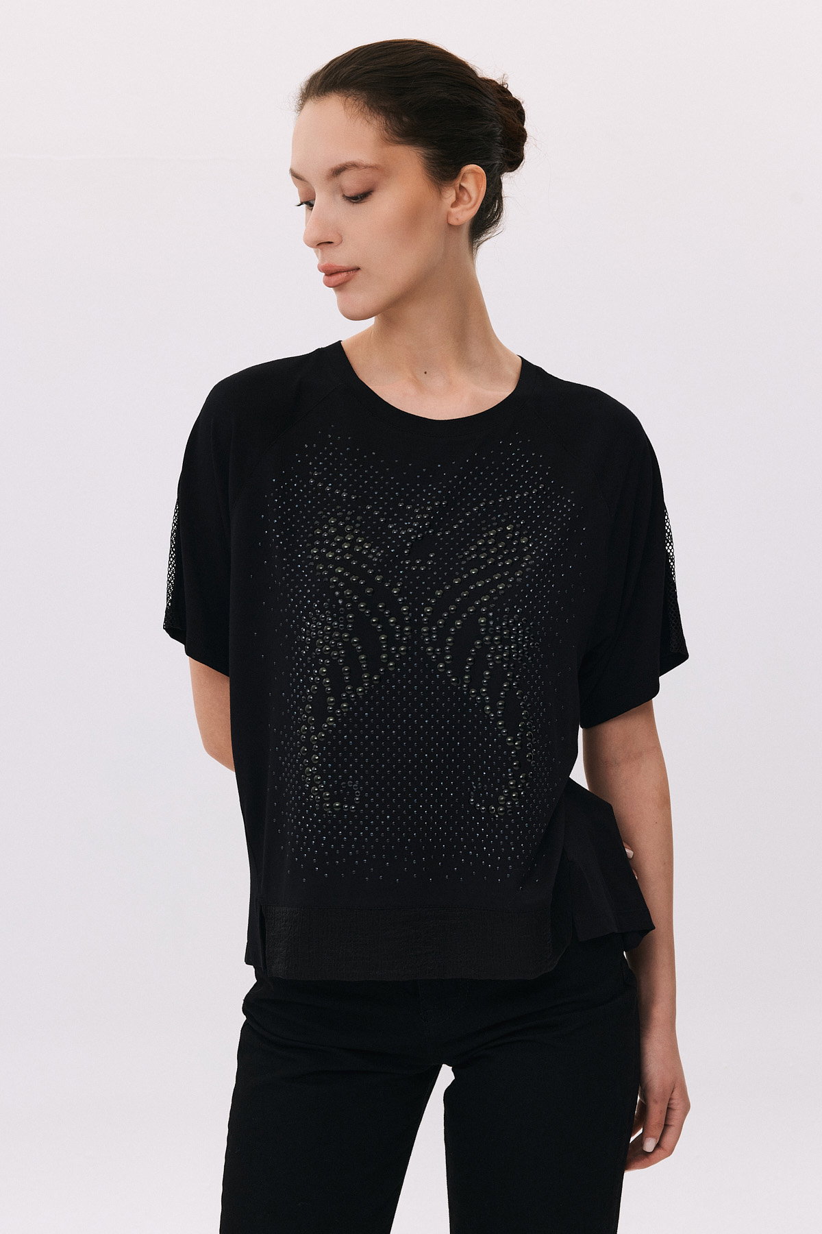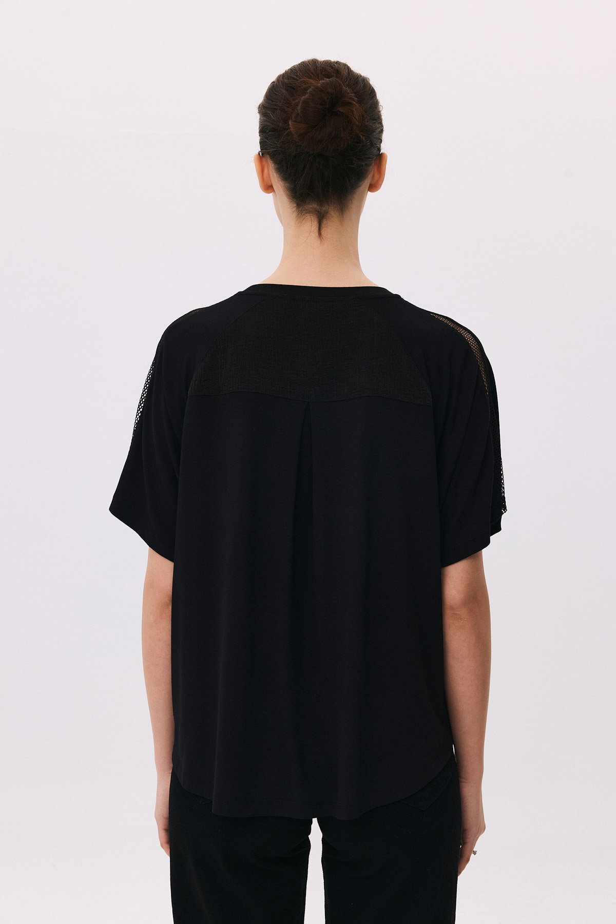 Detay: Yuvarlak yaka ve kısa kollu tasarımıyla modern bir görünüm sunan bluz, omuzlardaki file detaylarıyla zarif bir şıklık katar. Arka kısmındaki pens formu daha düzgün hale getirirken, ön kısmın kısa ve arka kısmın uzun kesimi dinamik bir stil oluşturur. Yanlardaki yırtmaçlar ise hem rahat hareket imkânı sağlar hem de tasarıma özgün bir dokunuş ekler;
