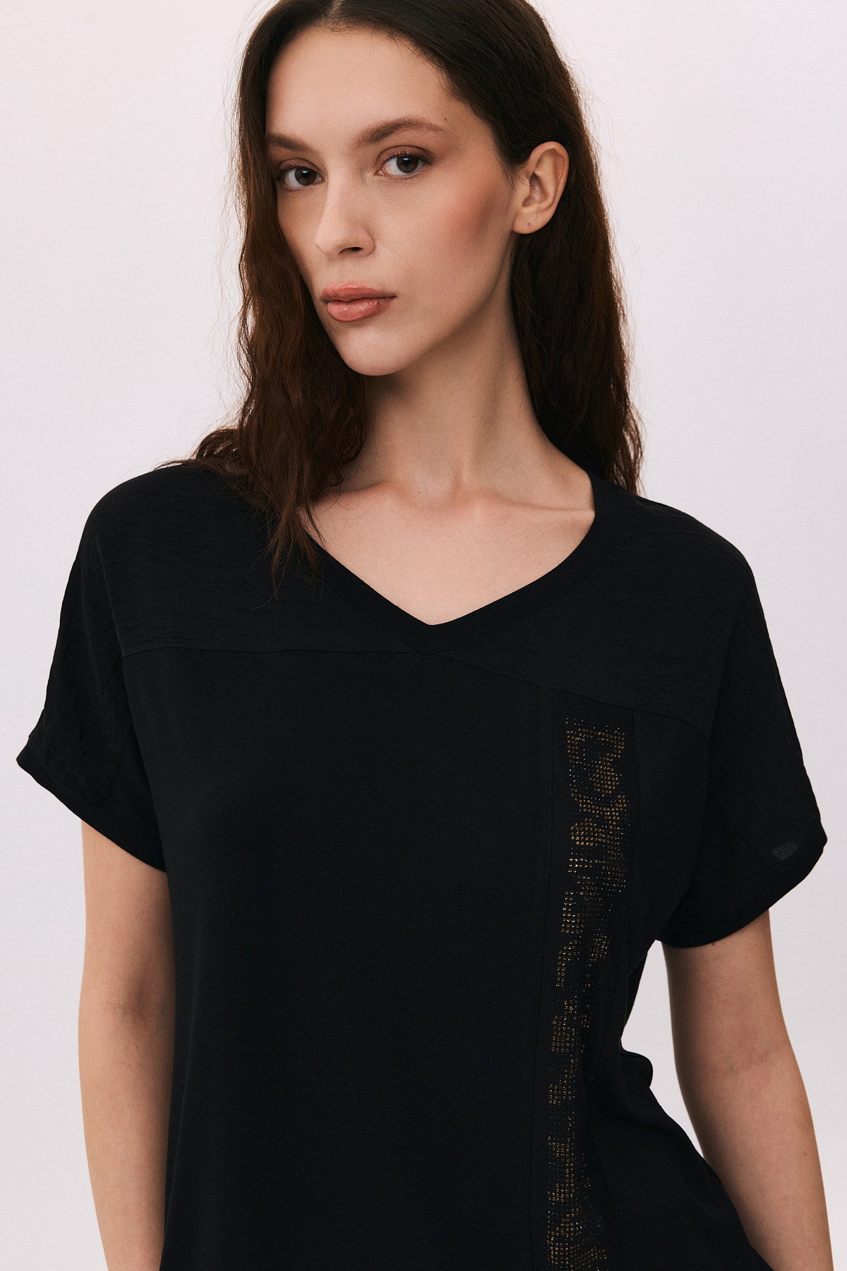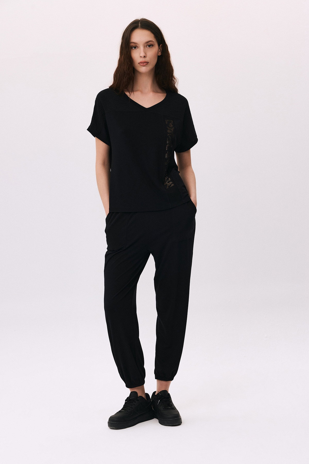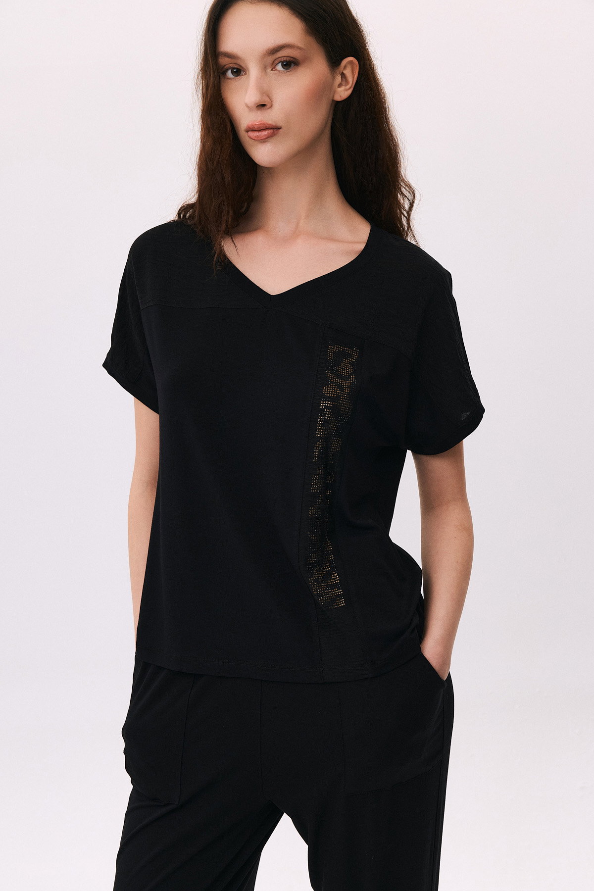Detay: V yaka, kısa ve düşük kollu tasarımıyla modern bir görünüm sunan penye bluz, taş detaylarıyla zarif bir ışıltı katar. Üst kısmındaki file altına işlenen taş işlemeler, şıklığı ön plana çıkarırken aynı zamanda feminen bir dokunuş sağlar. Rahat penye kumaşı sayesinde günlük kullanımda konforu ve şıklığı bir arada yaşatır;