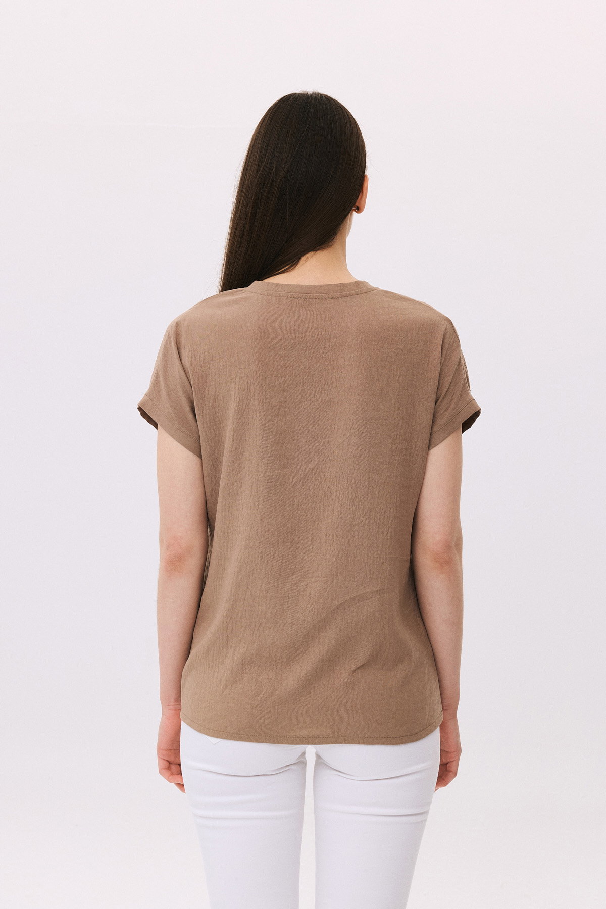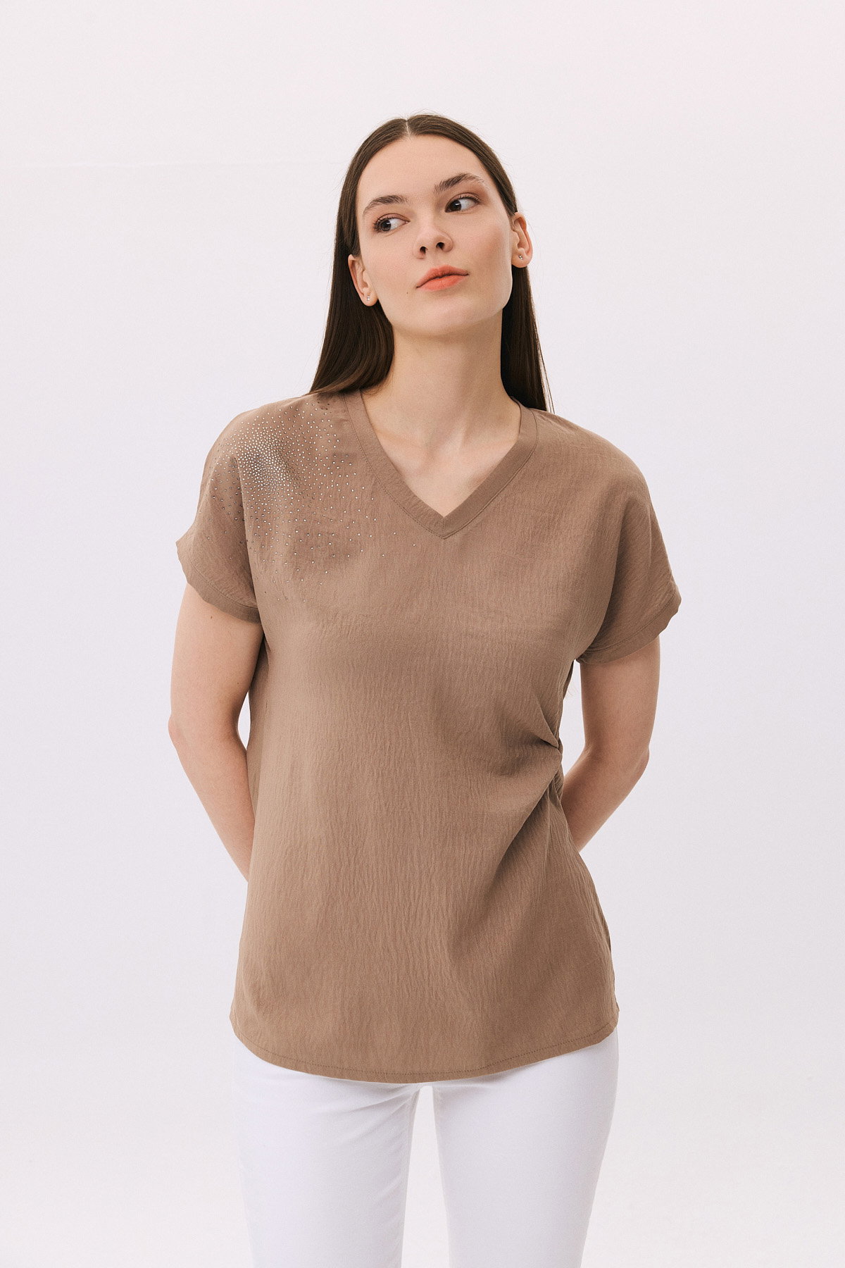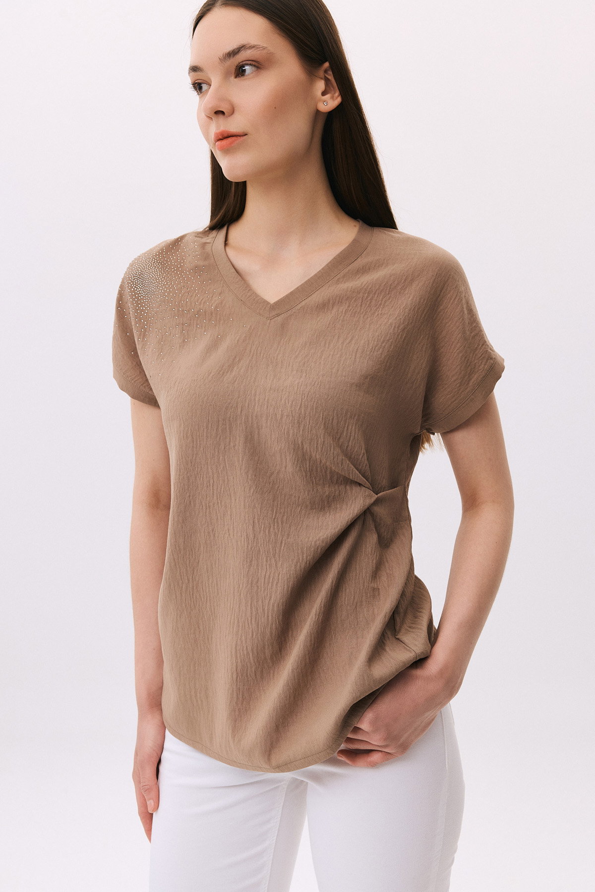 Daido Kadın V Yaka Taş Detaylı Kısa Kollu Bluz 6259 Vizon