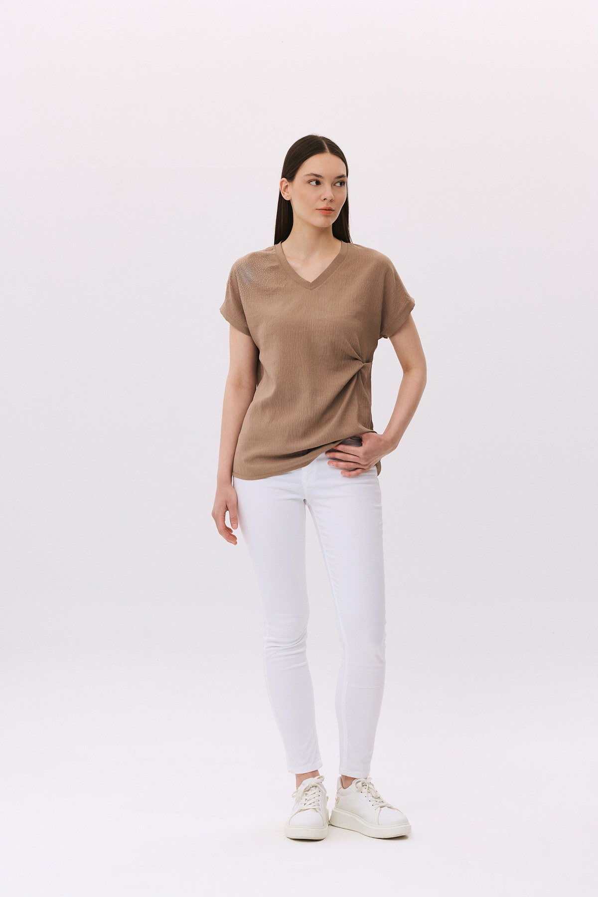 Detay: V yaka, düşük ve kısa kollu bluz modeli bel kısmındaki büzgü detayıyla zarif bir siluet oluşturur. Tek omuz kısmındaki taş işlemeler şıklığı ön plana çıkarırken, rahat kesimi günlük kullanıma uygun hale getirir. Bu özel tasarım, hem modern hem de feminen bir tarz arayanlar için ideal bir seçimdir;