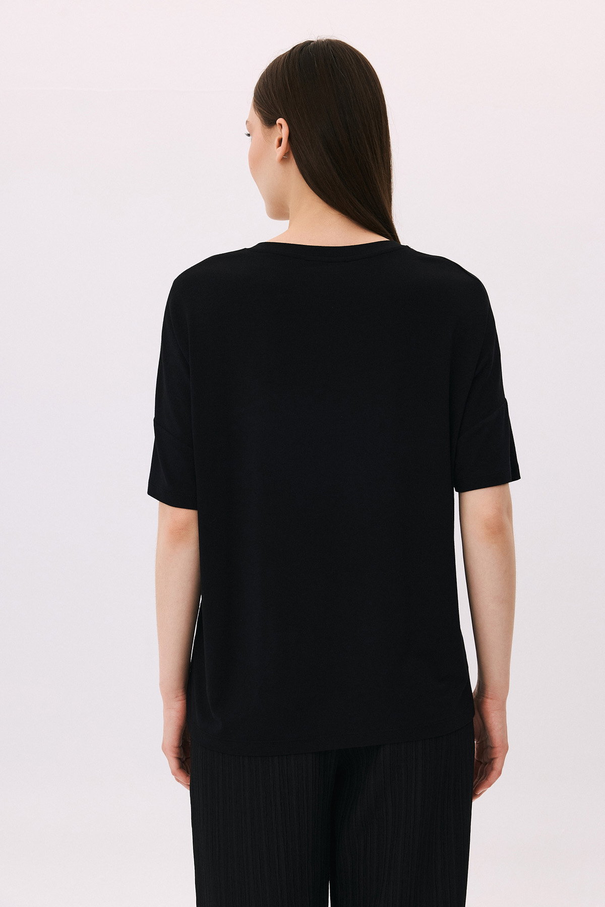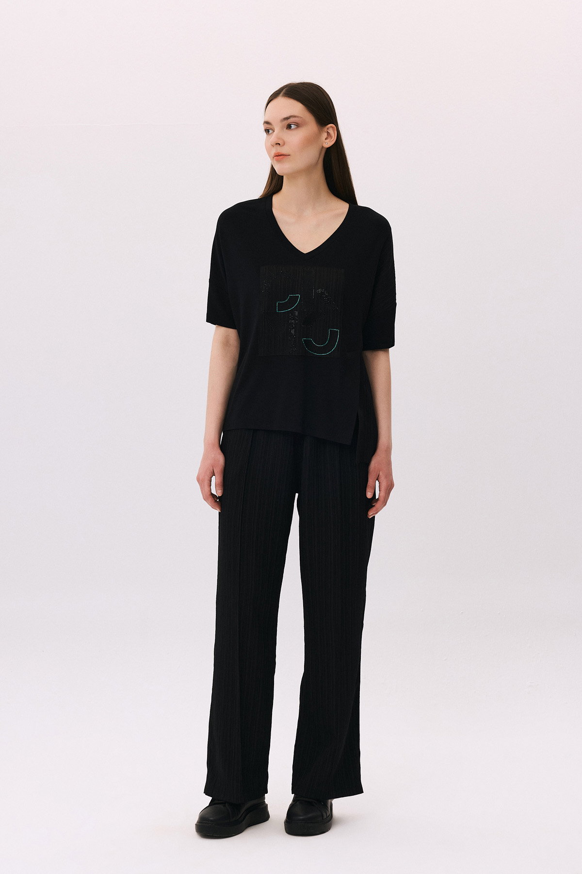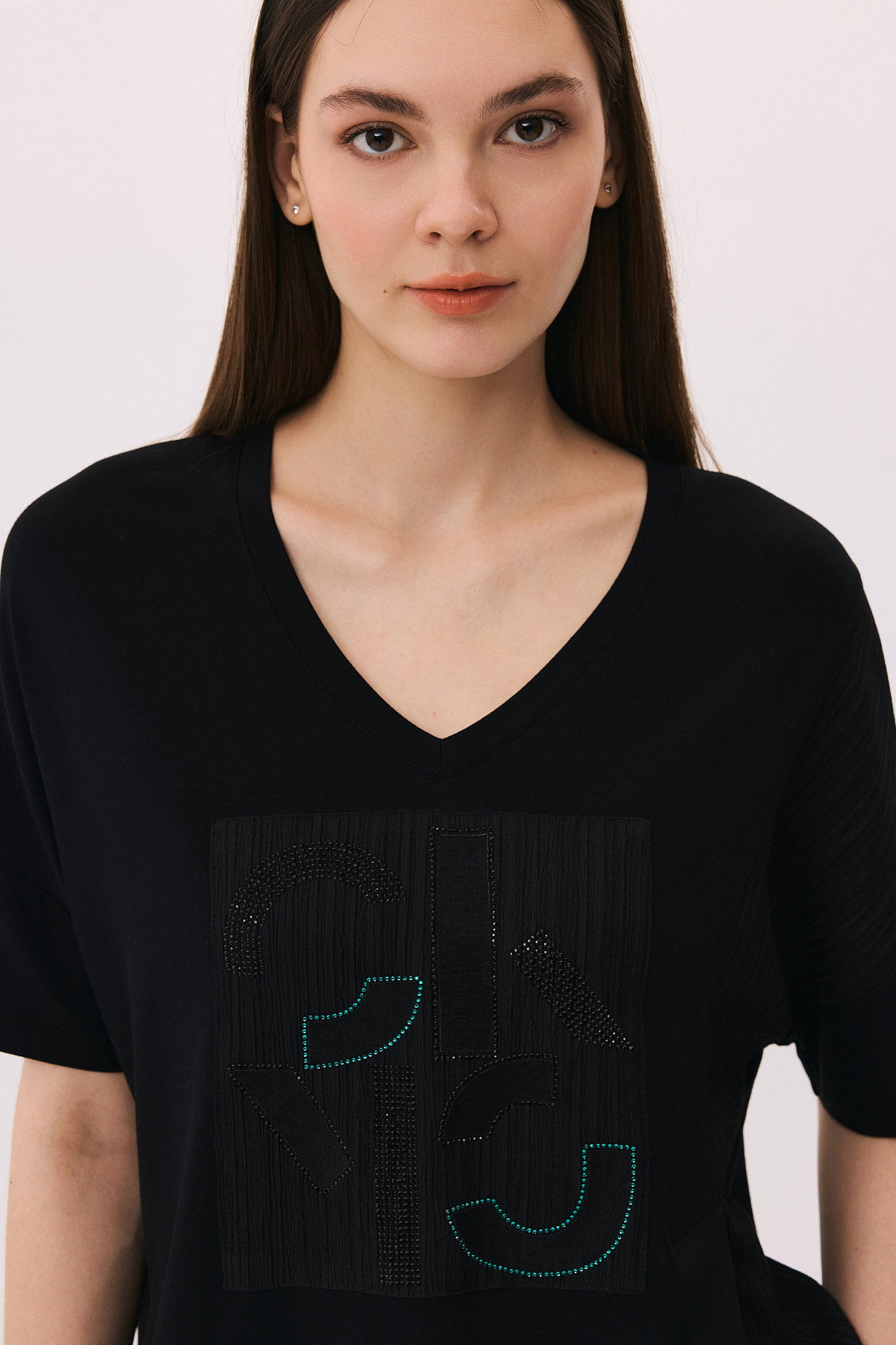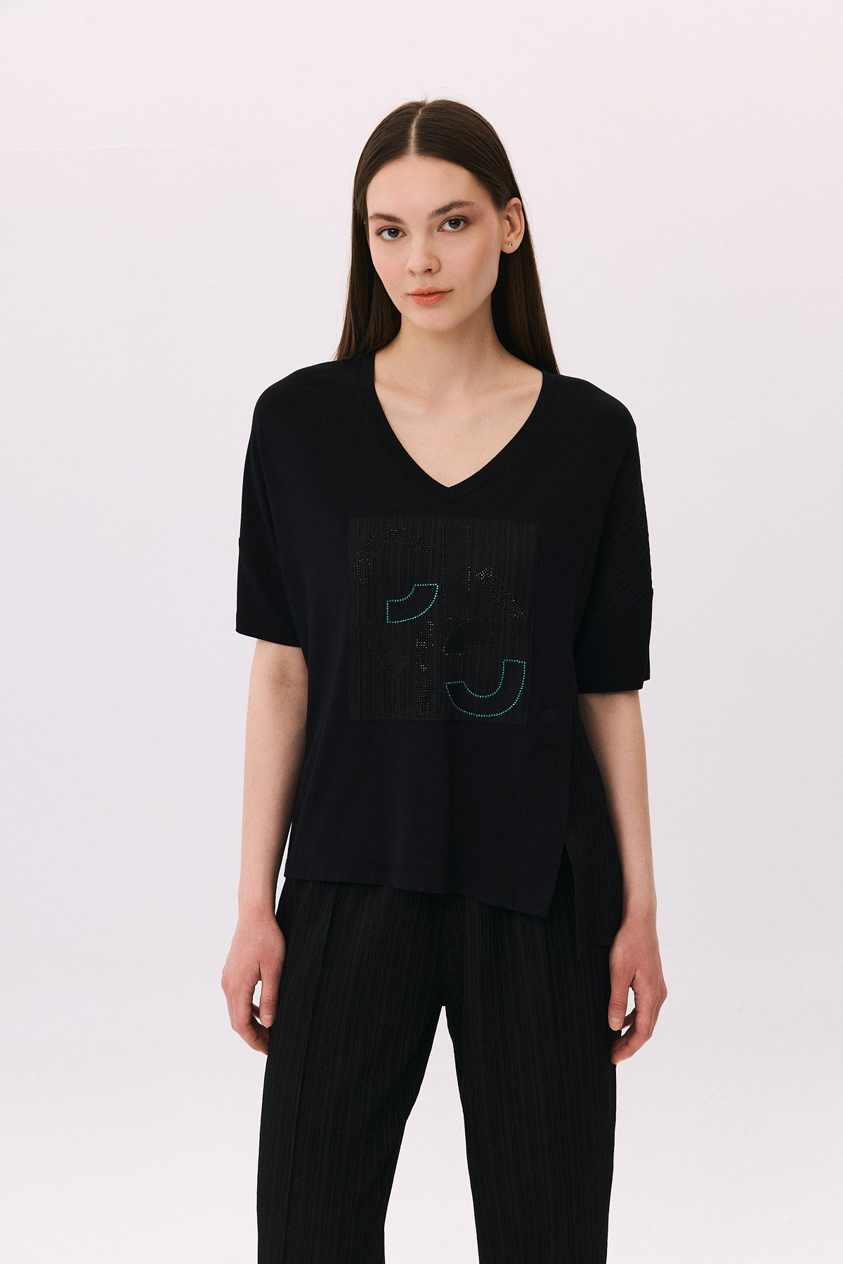 Detay: V yaka ve kısa kollu tasarımıyla modern bir görünüm sunan penye bluz, ön kısmındaki renkli taş süslemeleriyle göz alıcı bir detay kazanır. Tek yan taraftaki yırtmaç, tasarıma özgün bir hareketlilik katarken aynı zamanda rahat kullanım sağlar. Şıklığı ve zarafeti bir arada sunan bu bluz, günlük kombinlere sofistike bir dokunuş ekler;