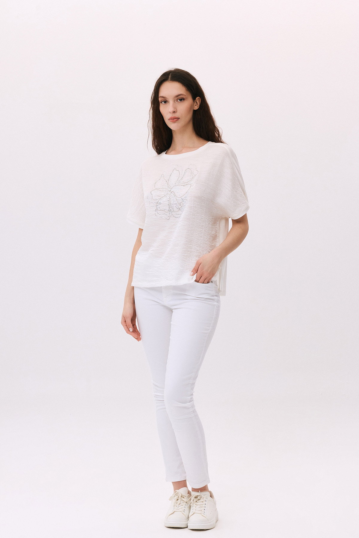 Detay: Kısa ve düşük kollu, desenli bu T-Shirt modeli ön kısmındaki parlak kumaş ile dikkat çekerken, arka kısmındaki penye yapısı konfor sağlar. Yan kısmındaki yırtmaç detayı modern bir görünüm kazandırarak hareket özgürlüğü sunar. Bu özel tasarım, hem günlük kombinlerde hem de şık bir tarz yaratmak isteyenler için ideal bir seçenektir;