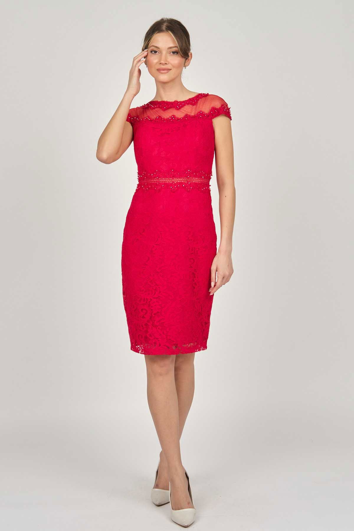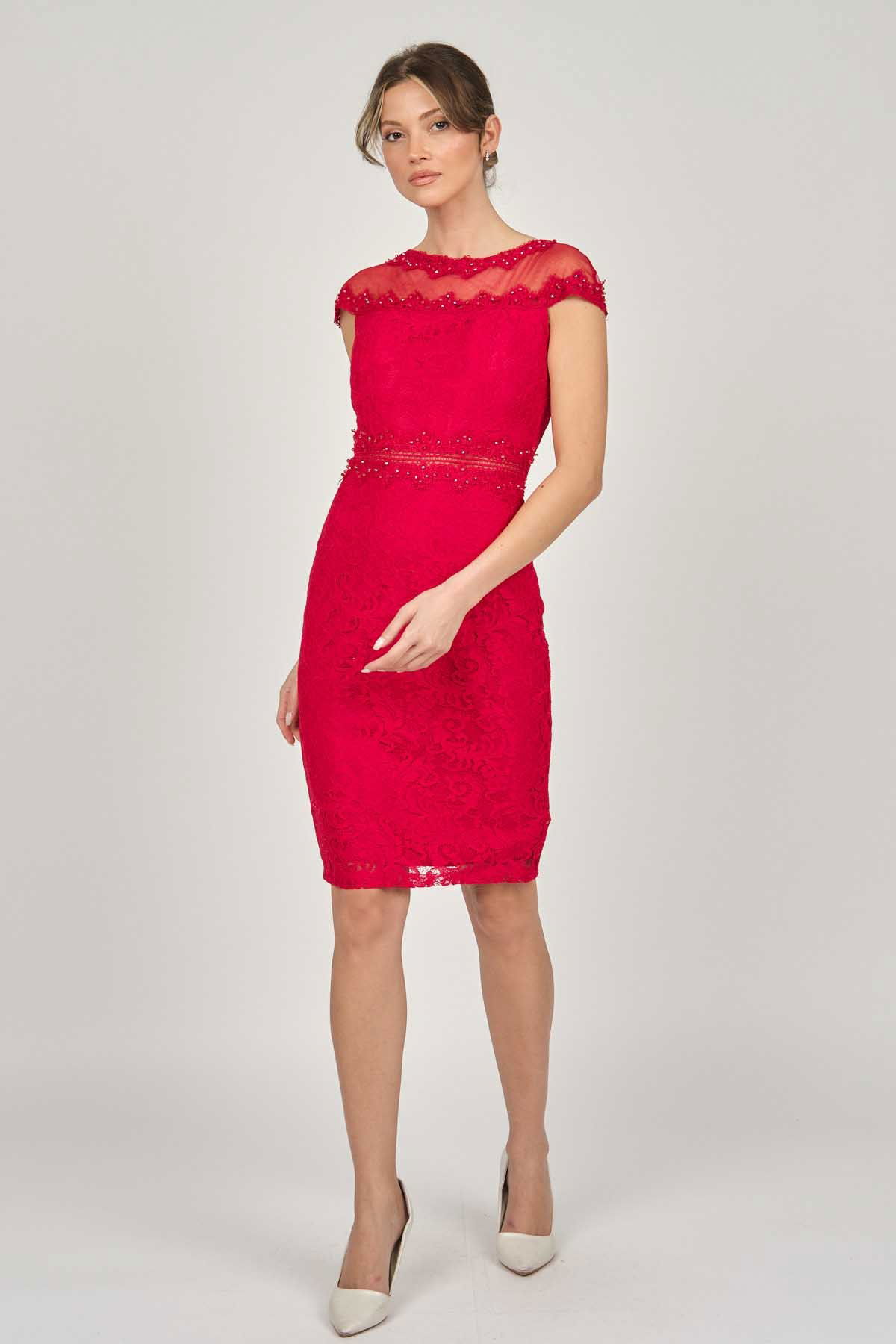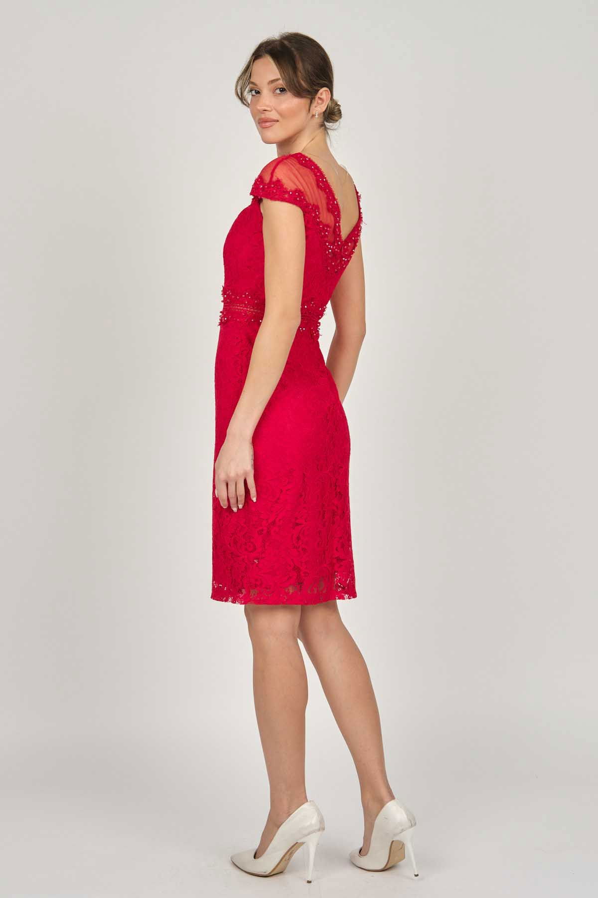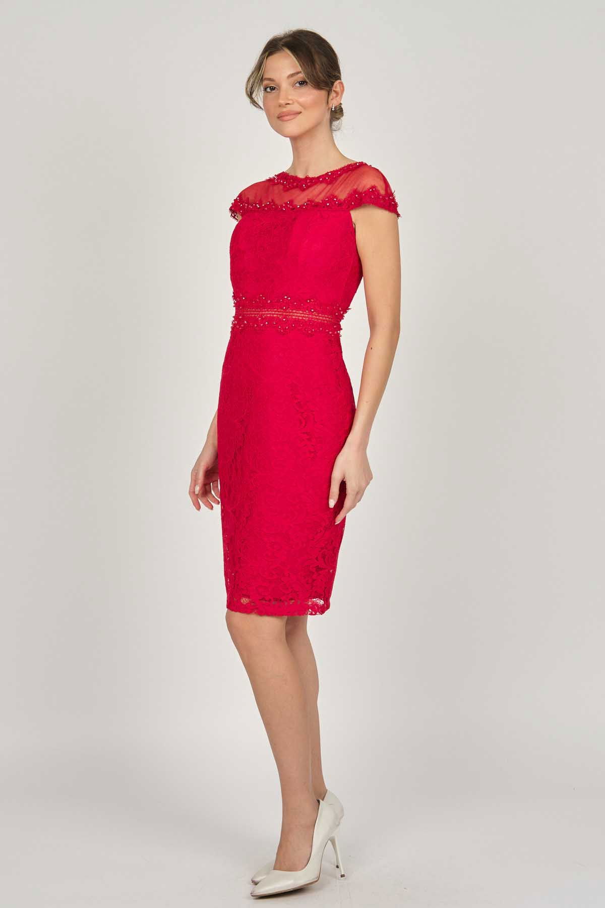 Detay: Yaka kısmı transparan, kısa, astarlı abiye elbise;
