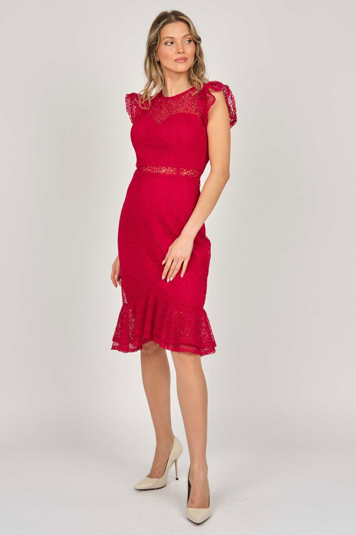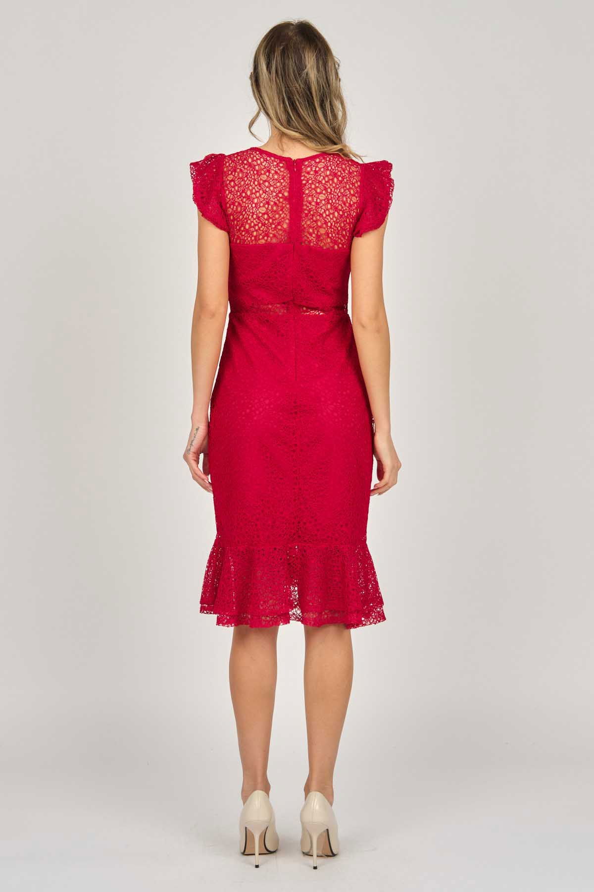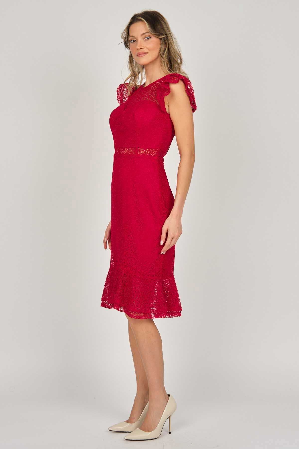Detay: Kollar ve etek ucu volanlı, astarlı abiye elbise;