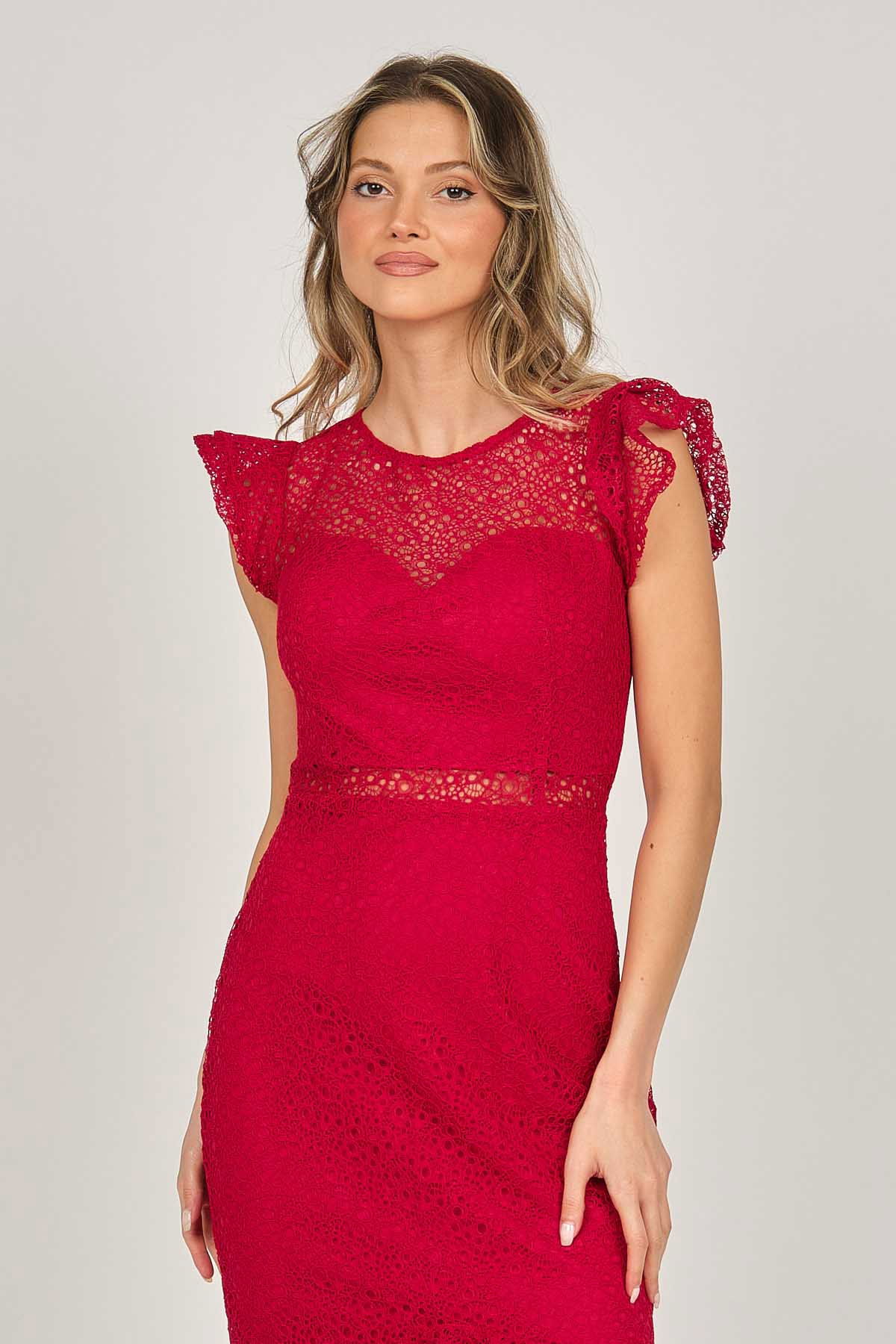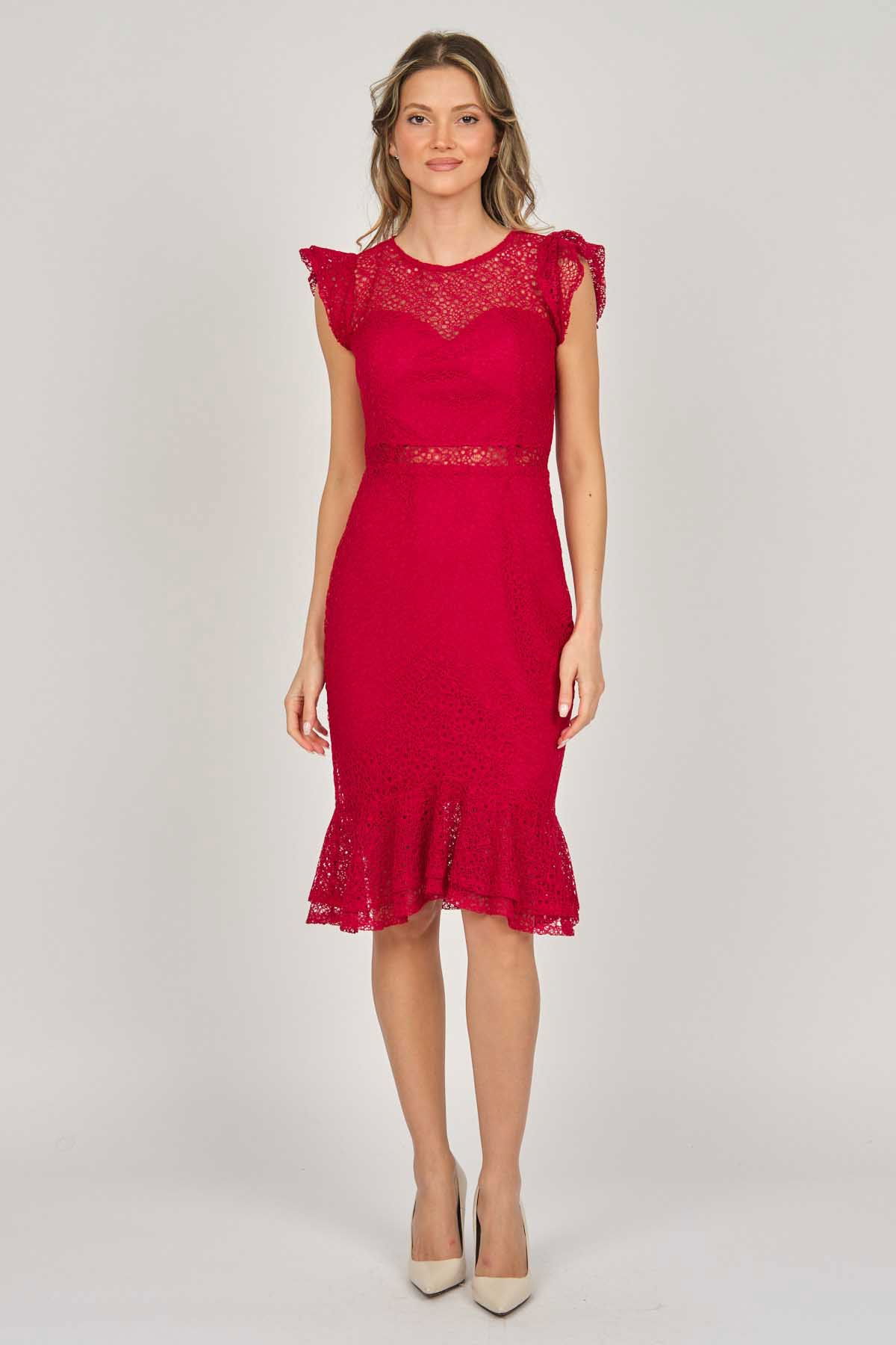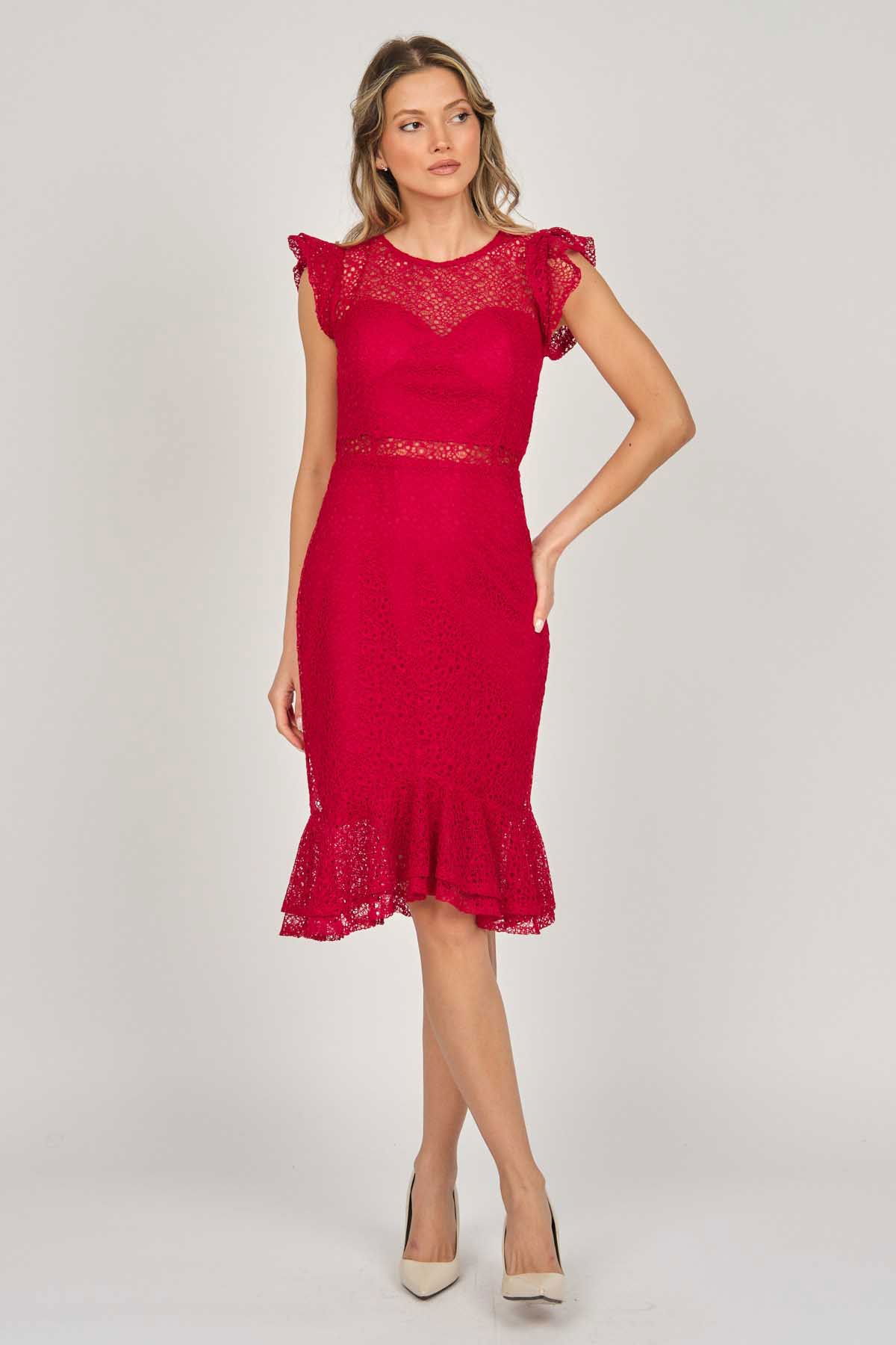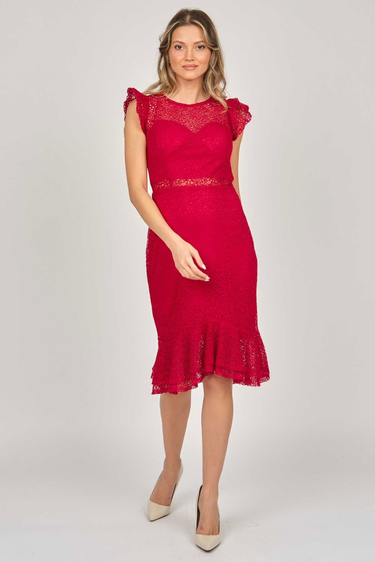 Detay: Kollar ve etek ucu volanlı, astarlı abiye elbise;