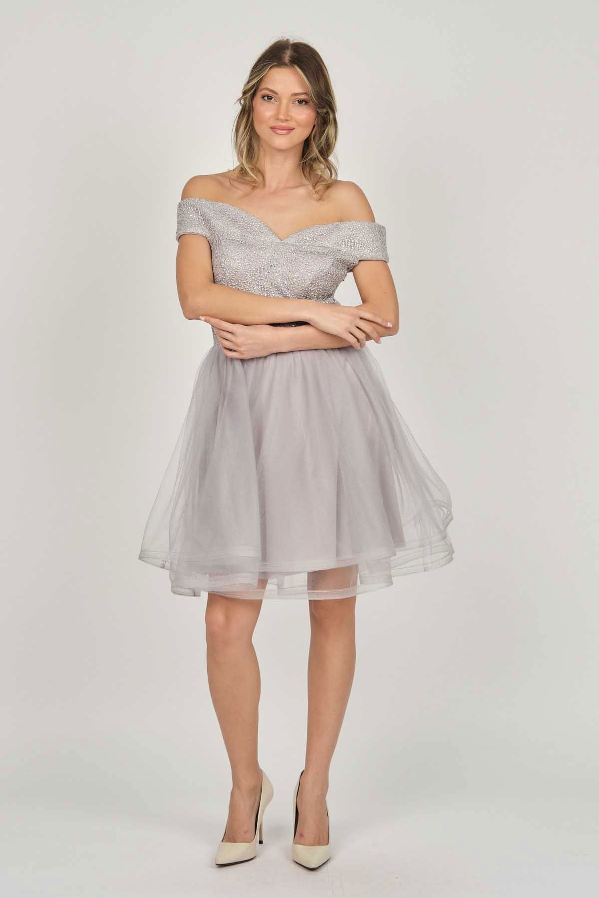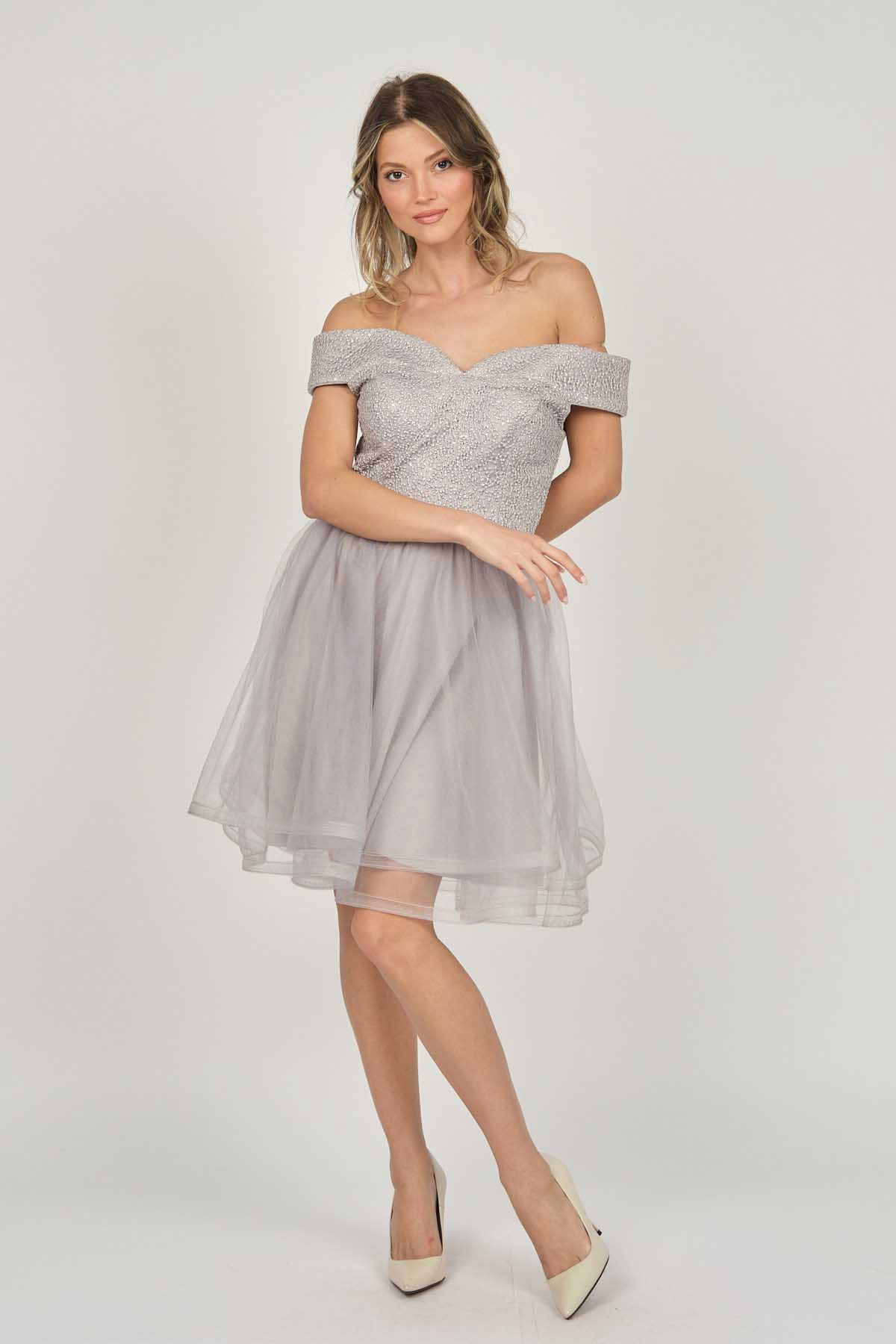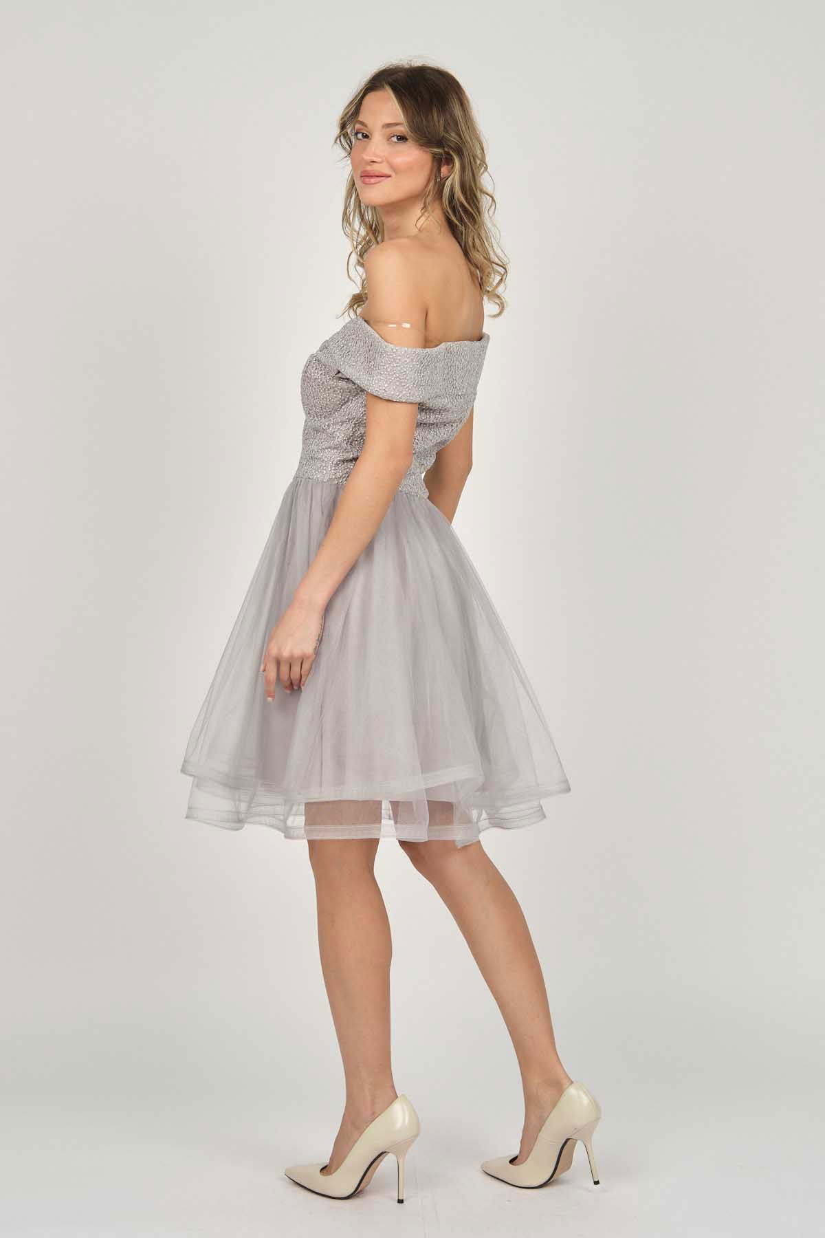 Detay: Yaka detaylı, kloş, astarlı abiye elbise;