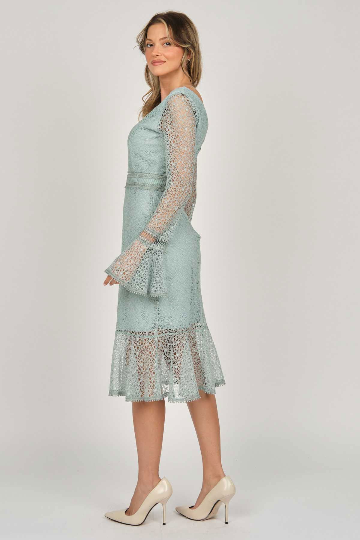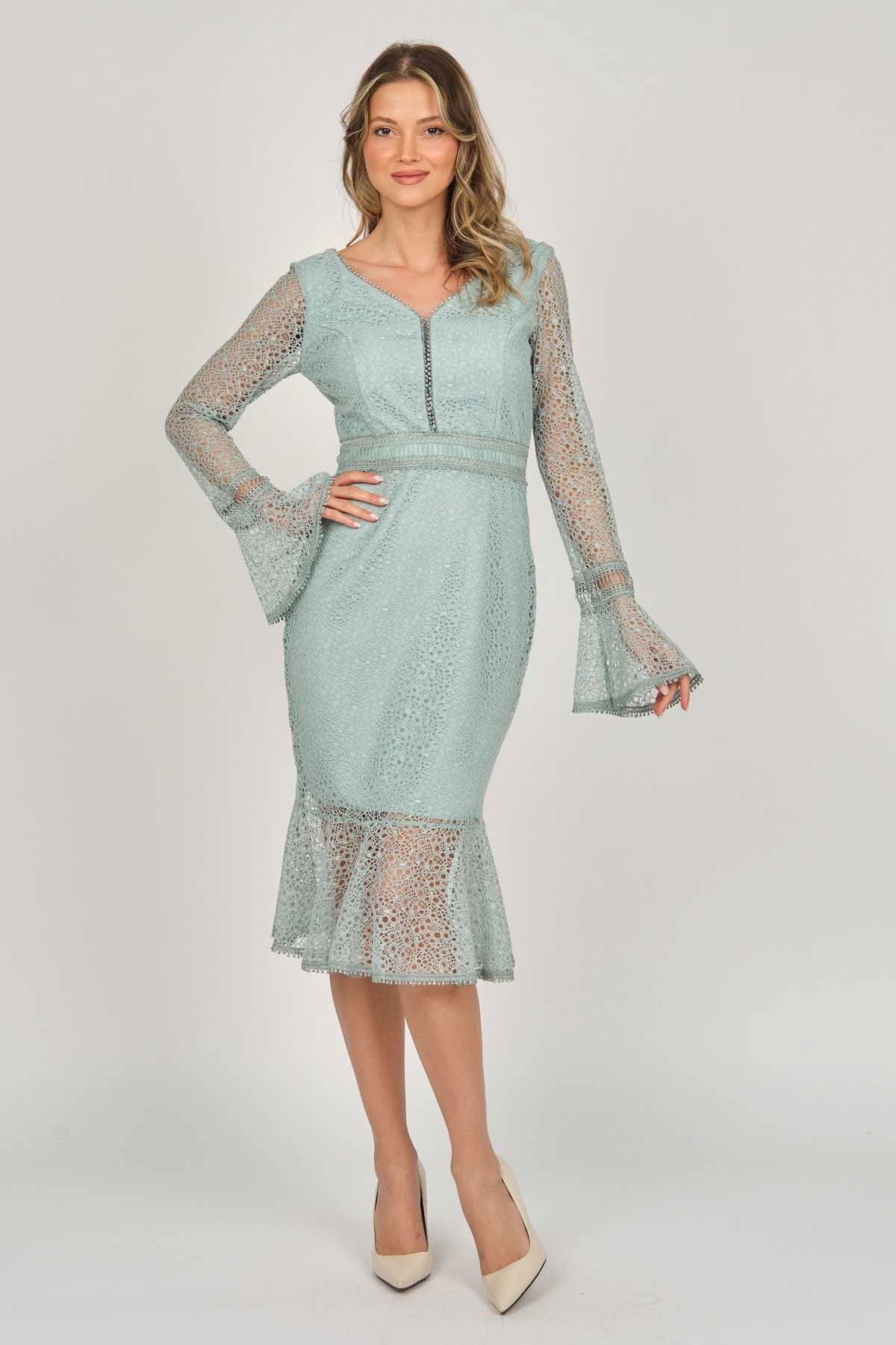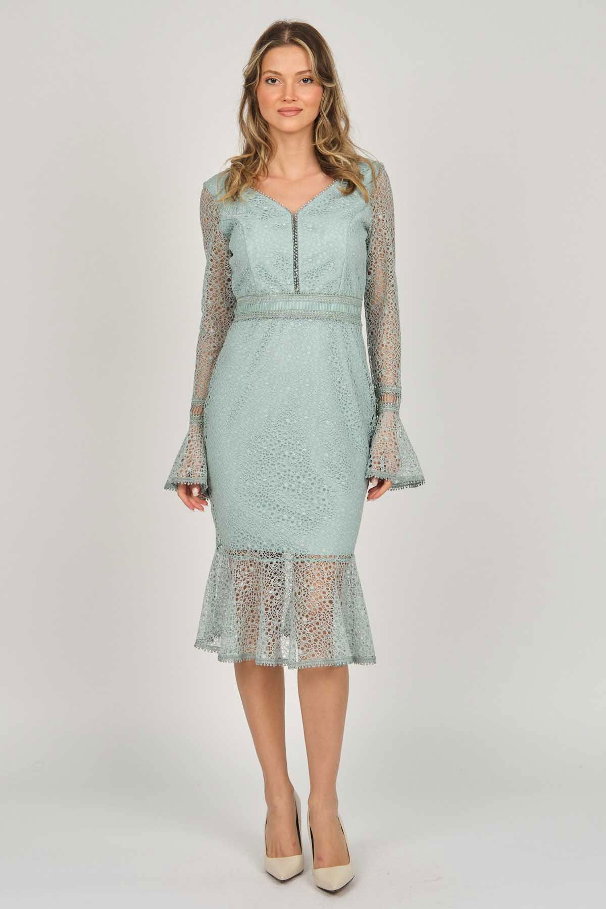 Detay: V yaka, güpürlü, astarlı, göğüs pedli midi abiye elbise;