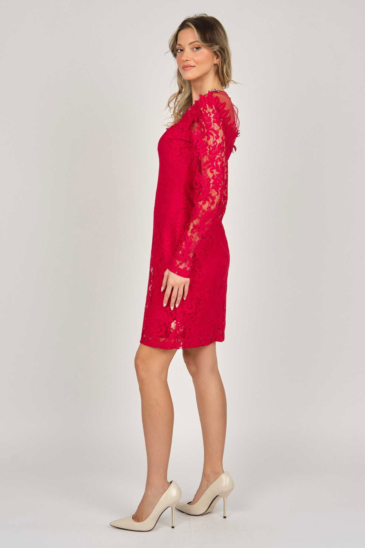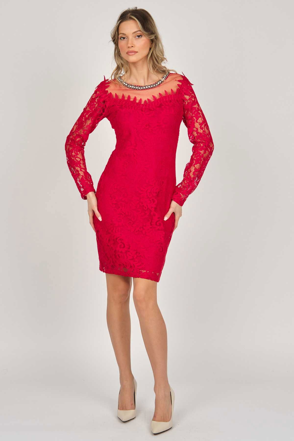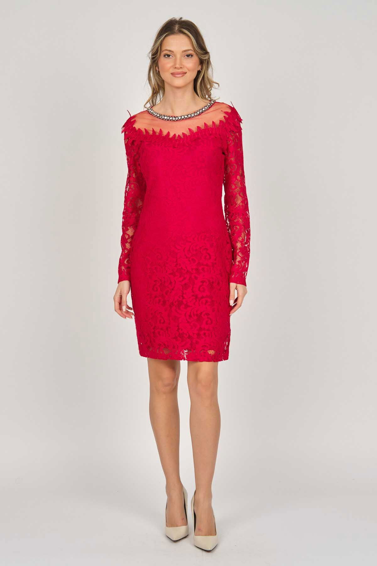 Detay: Yakası taşlı, kısa, astarlı abiye elbise;
