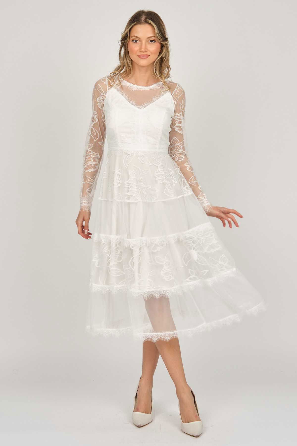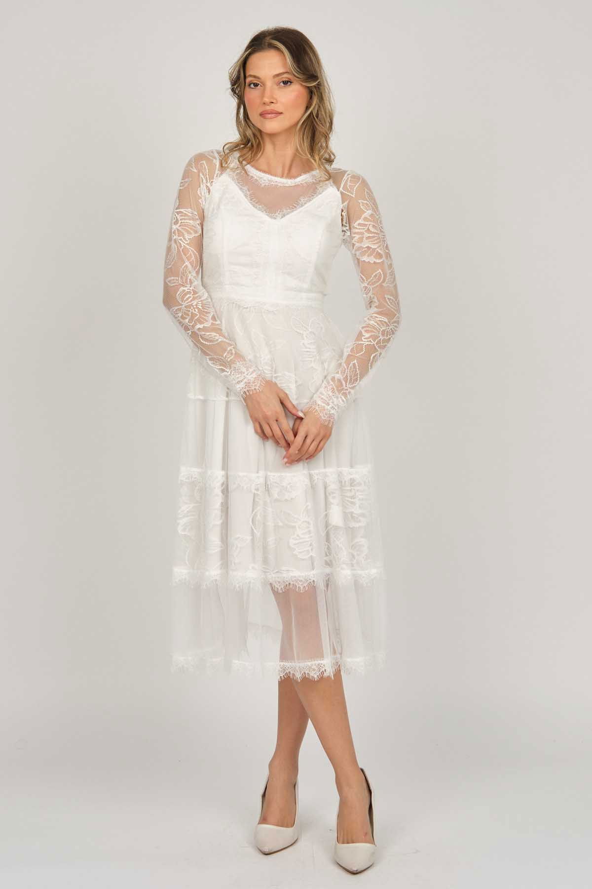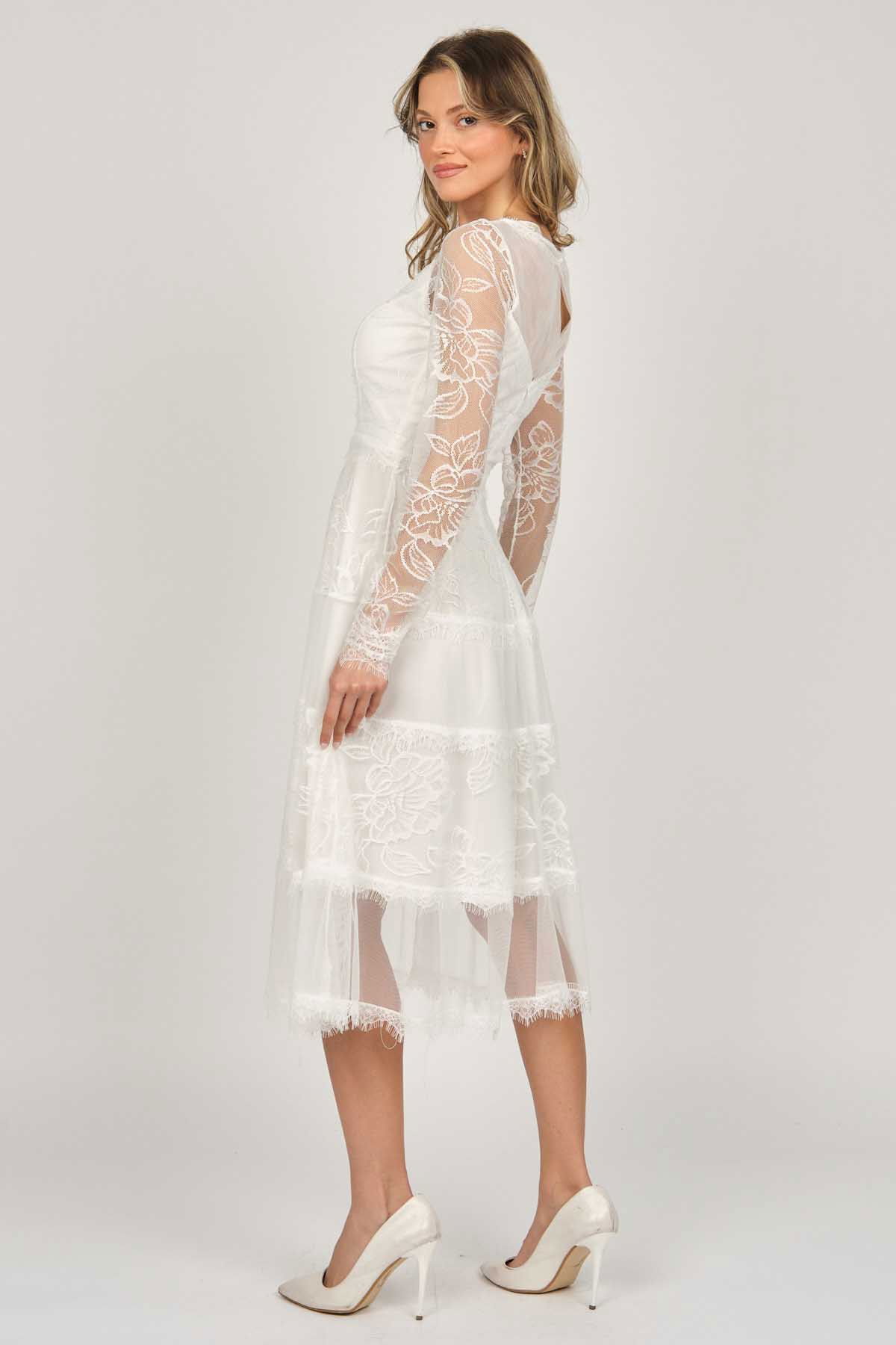 Detay: Uzun kol, tül ve dantel detaylı, astarlı abiye elbise;