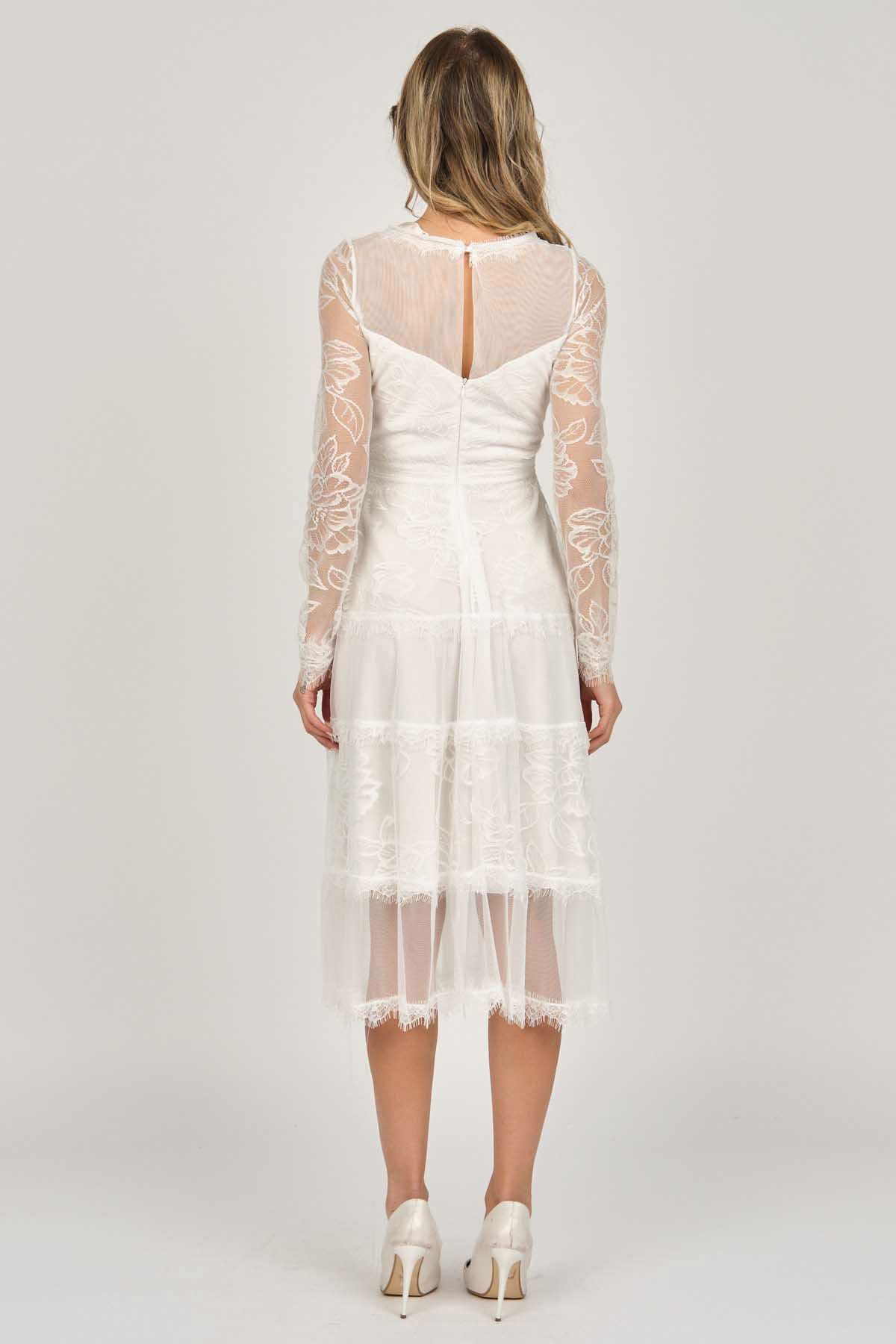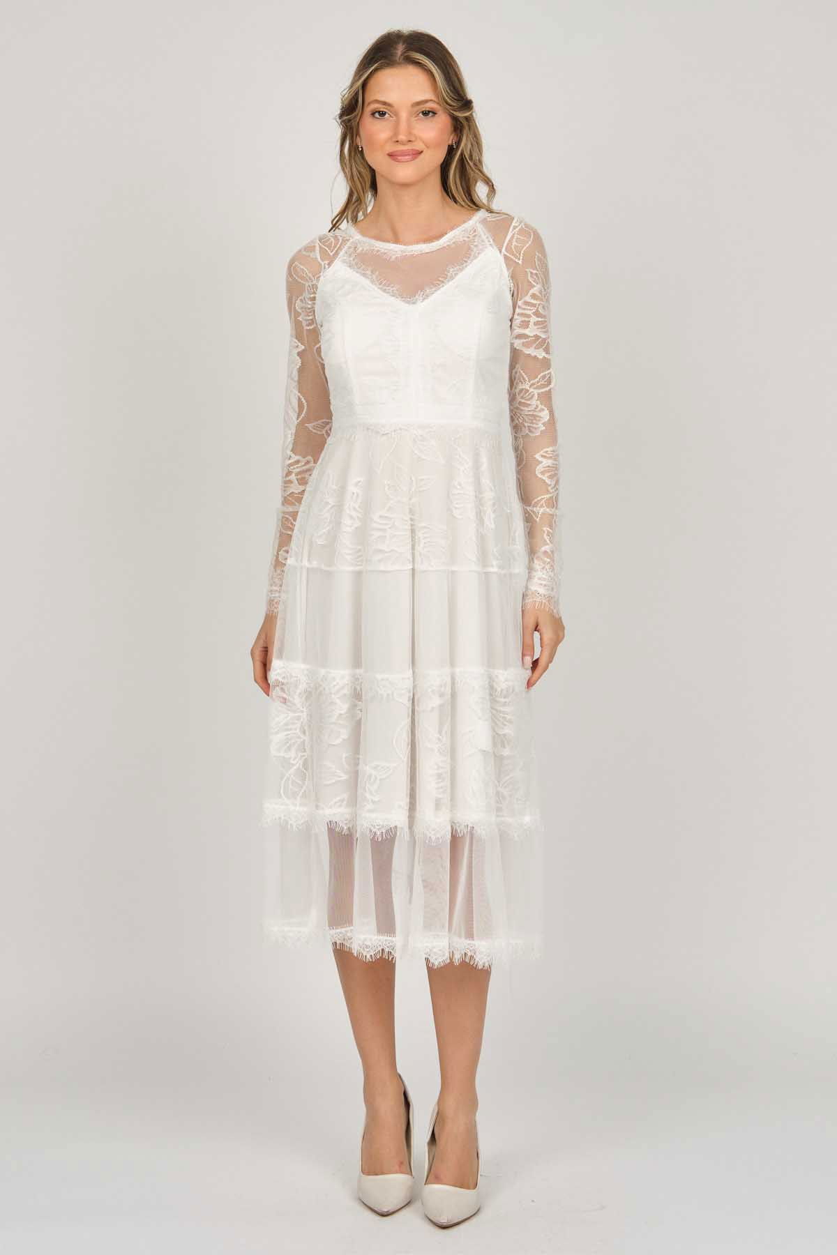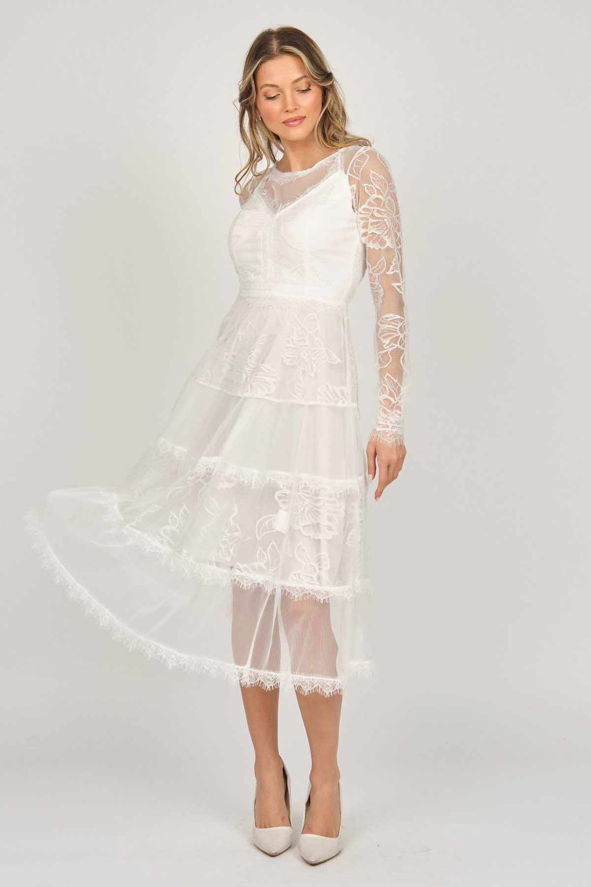 Detay: Uzun kol, tül ve dantel detaylı, astarlı abiye elbise;