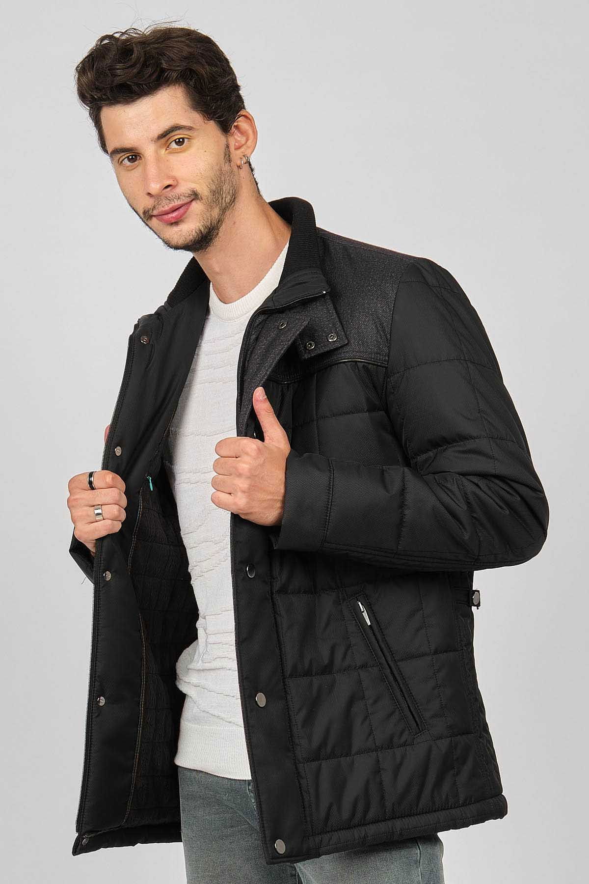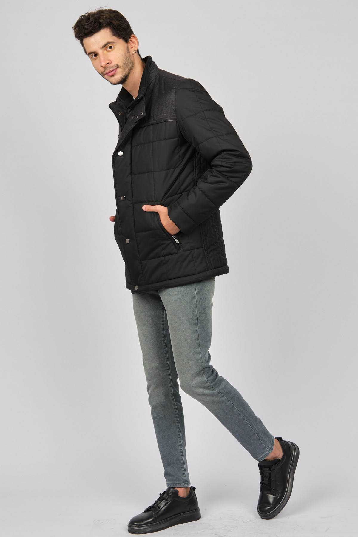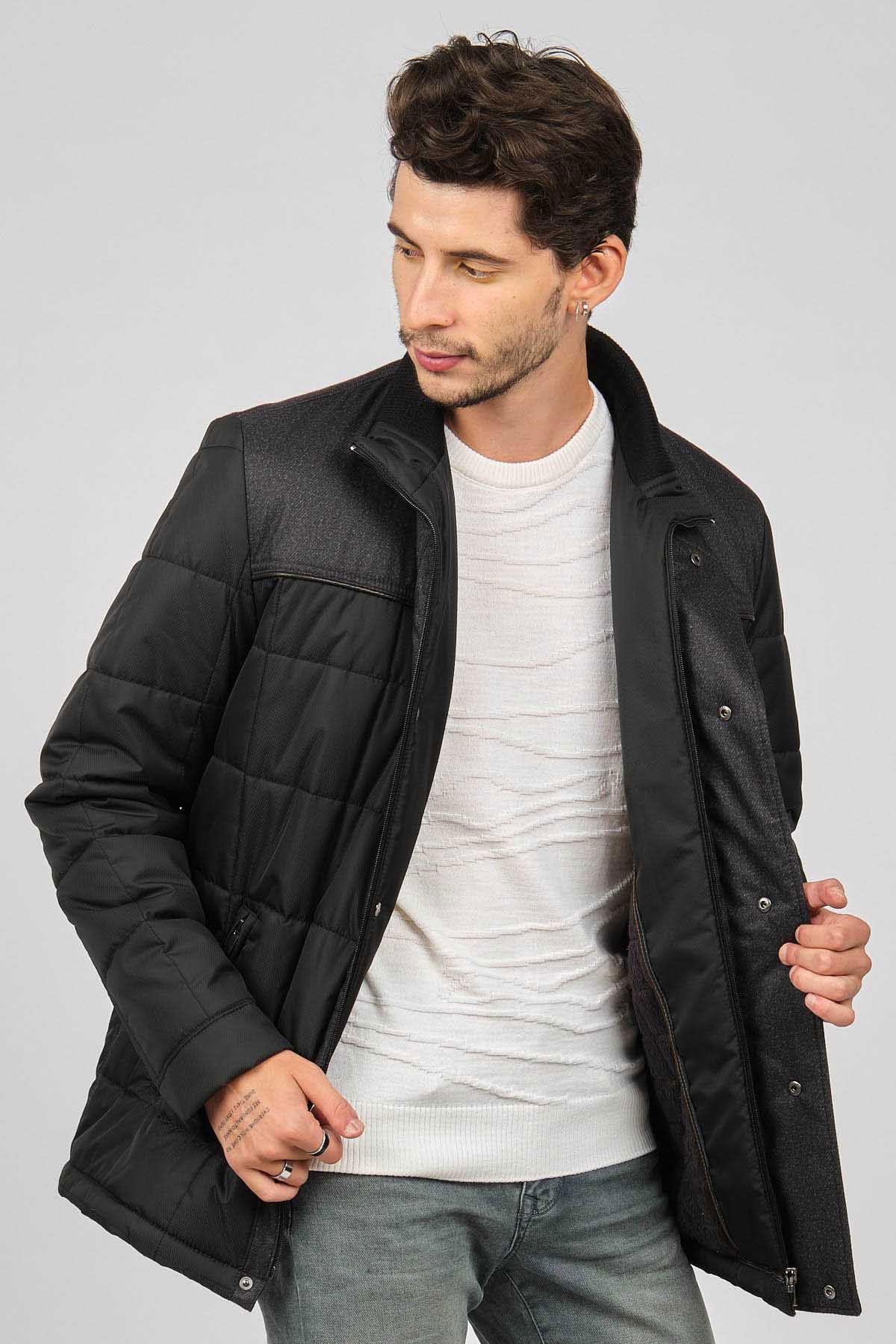 Detay: Dik yaka, İçi kürklü, Fermuarlı yan cepler, Fermuar ve çıtçıt kapamalı, Roba garnili kapitone kaban;