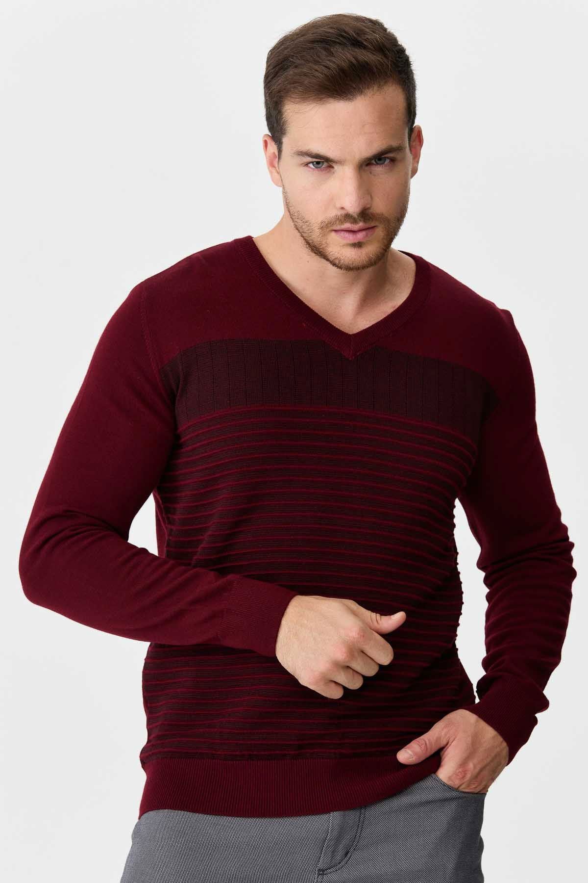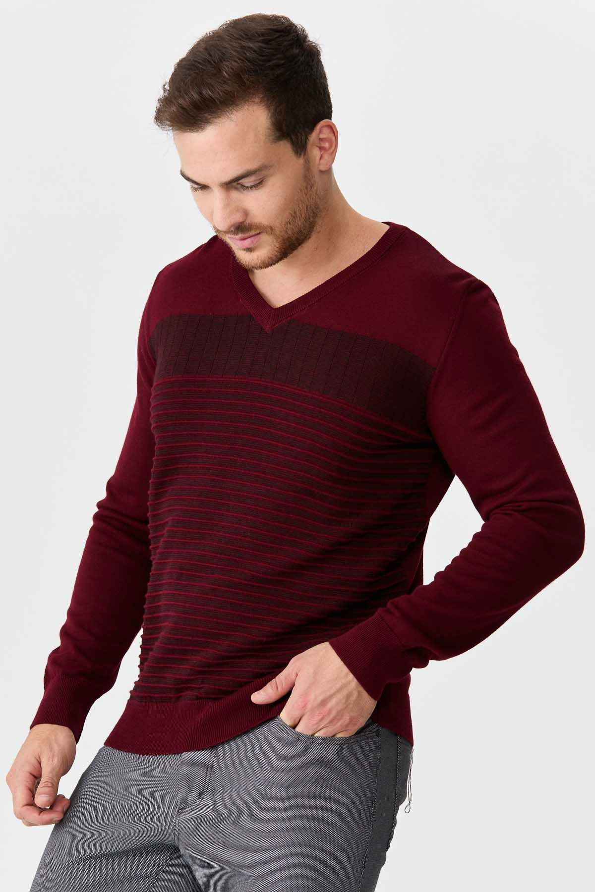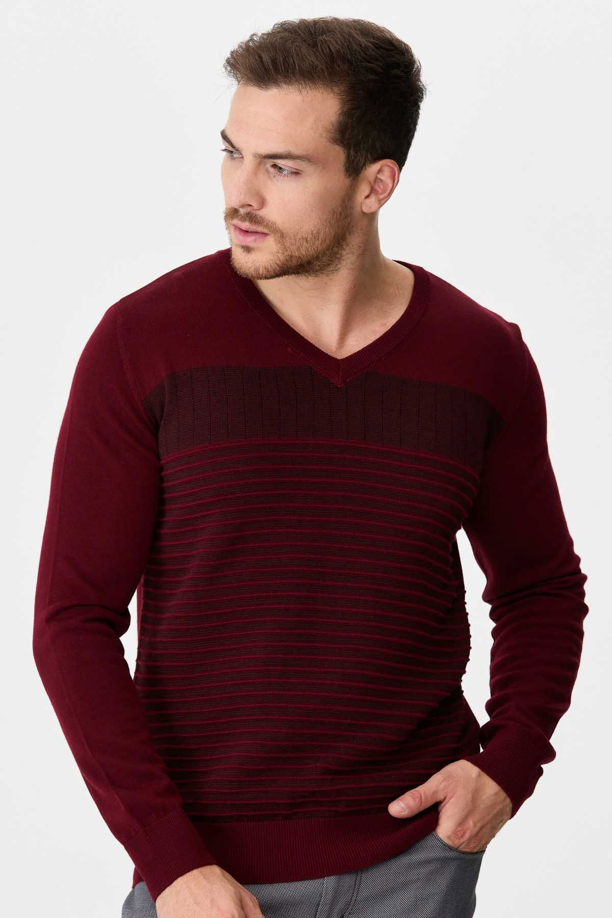 Detay: V yaka, desenli yün kazak;