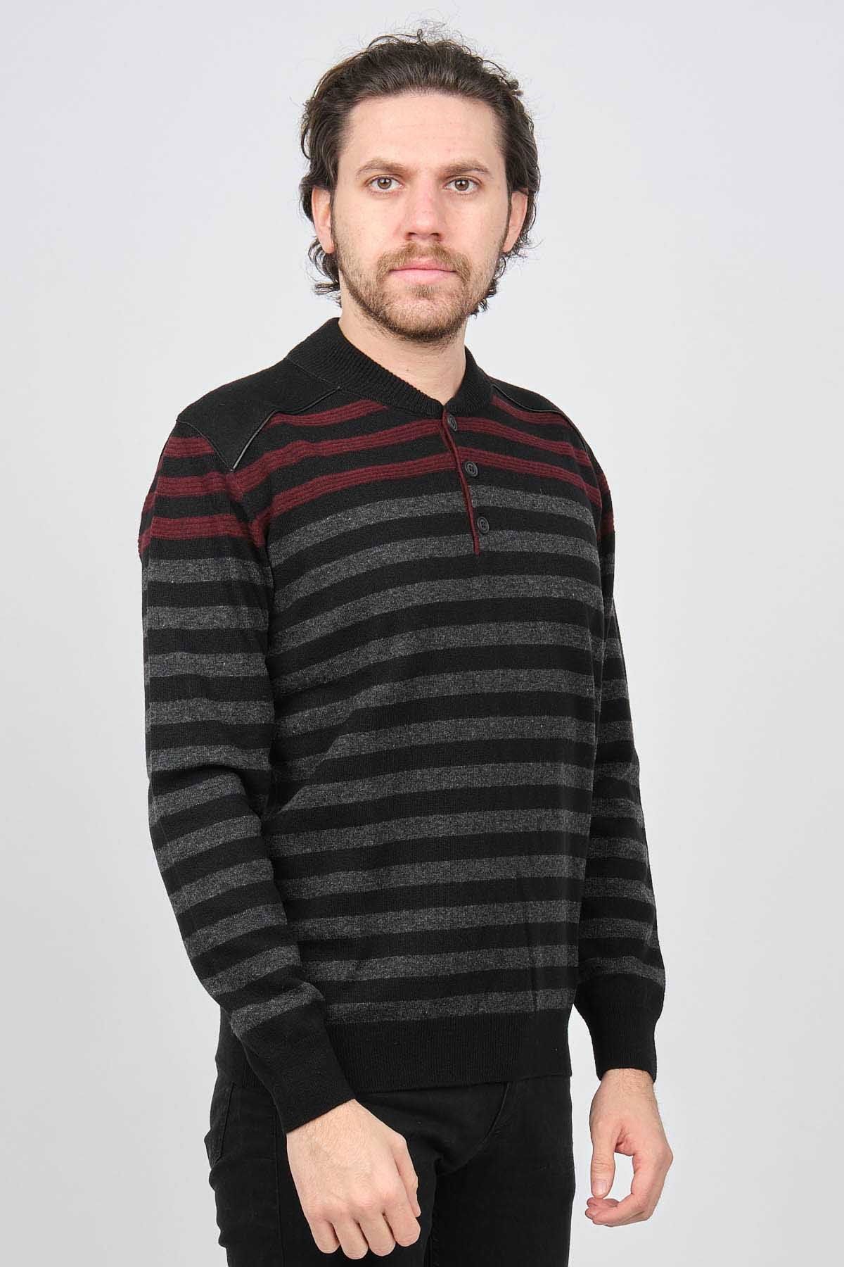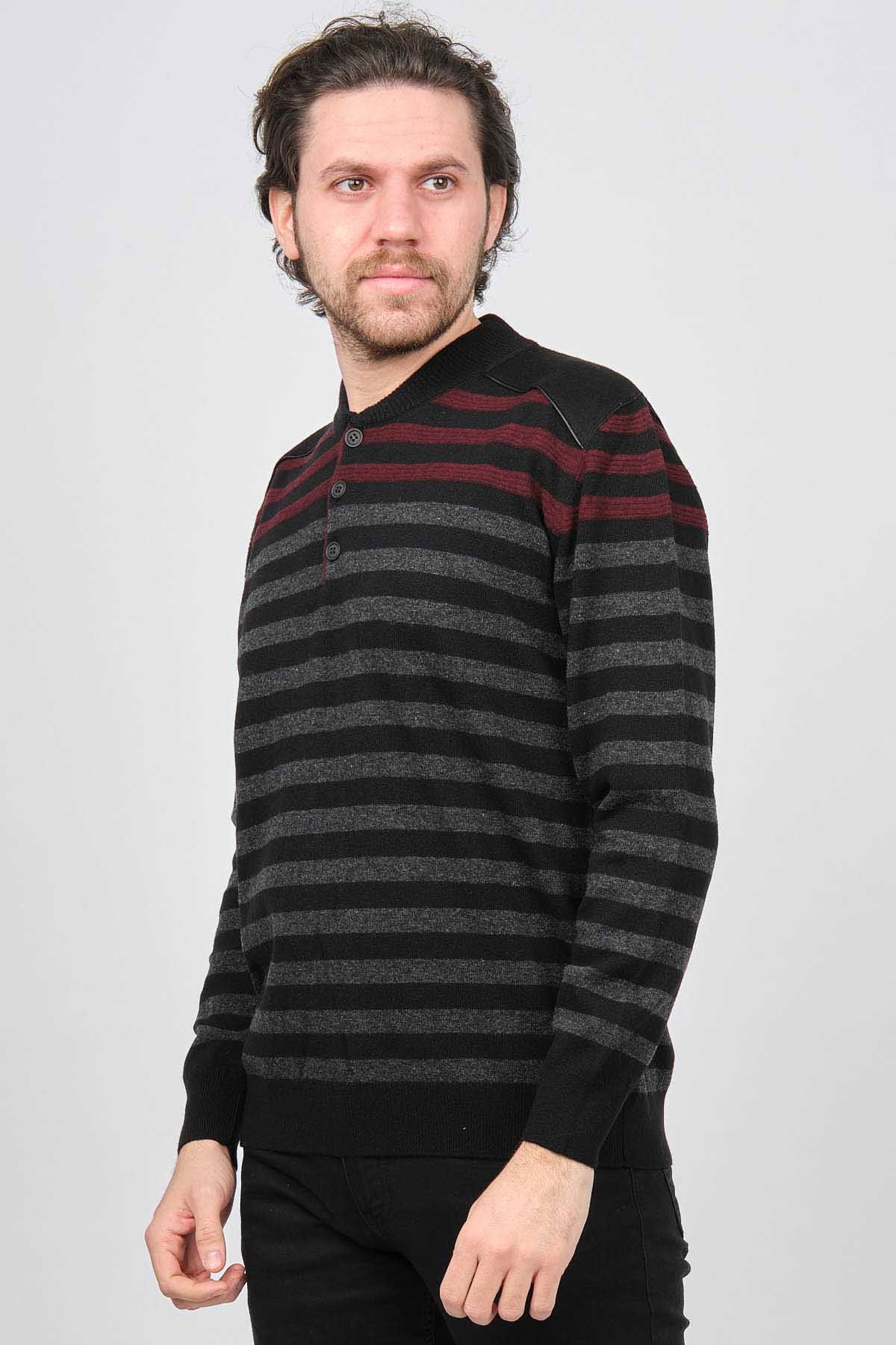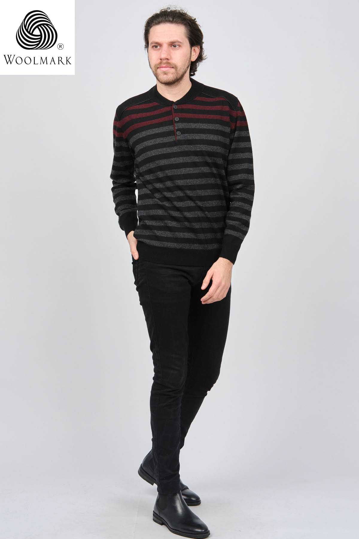 Desen Triko Erkek Düğmeli Yarım Balıkçı Desenli Saf Yün Kazak 0246547 Siyah
