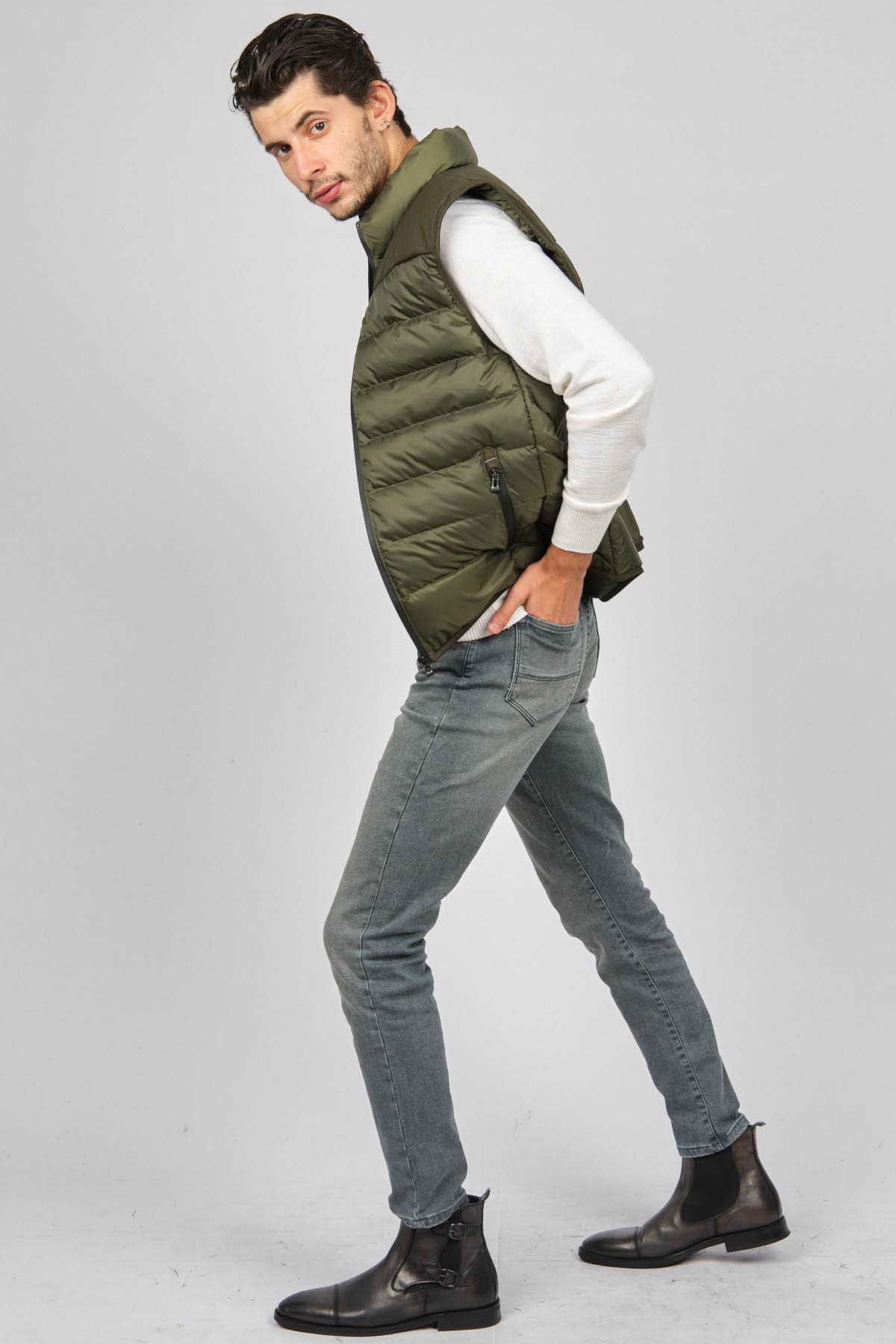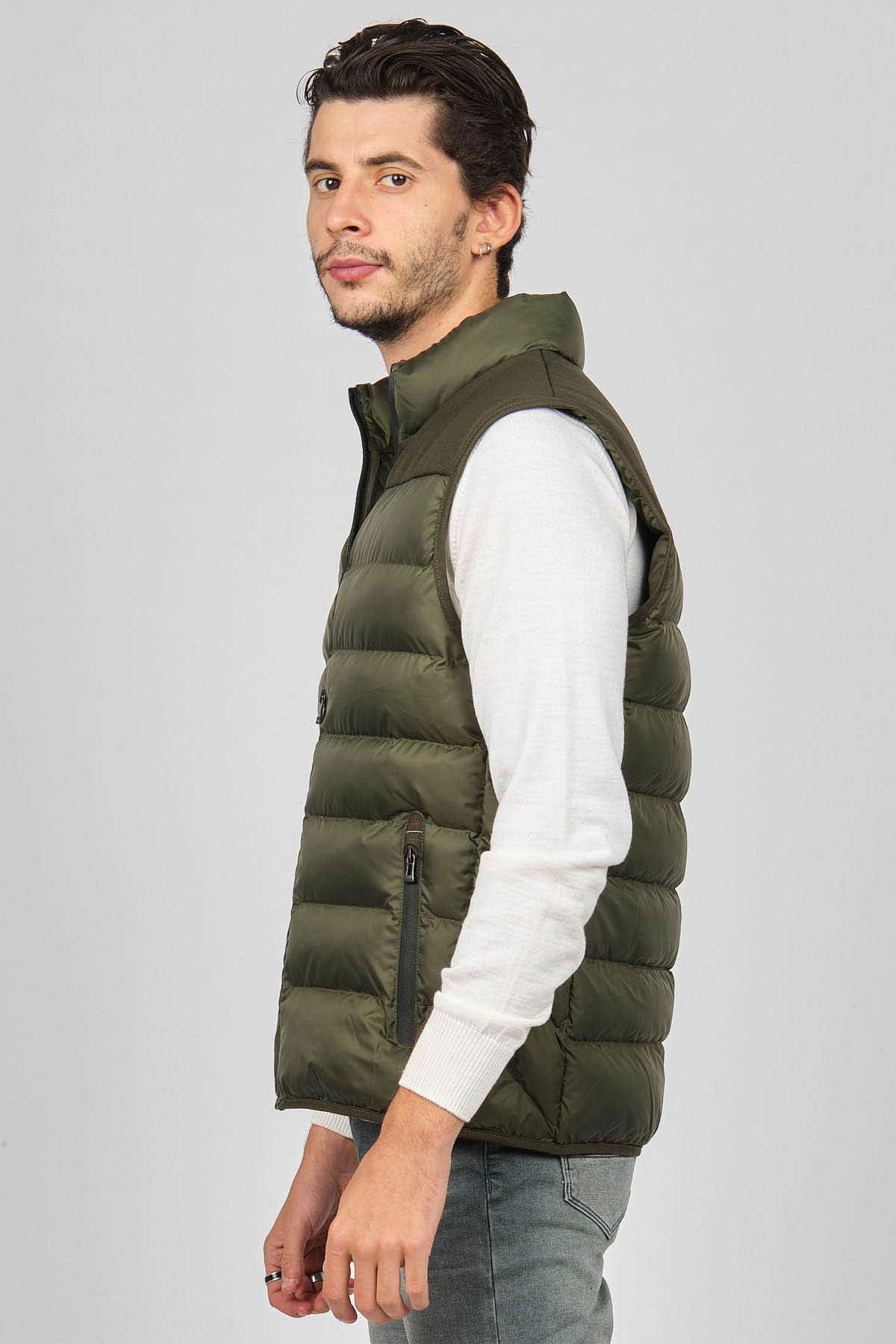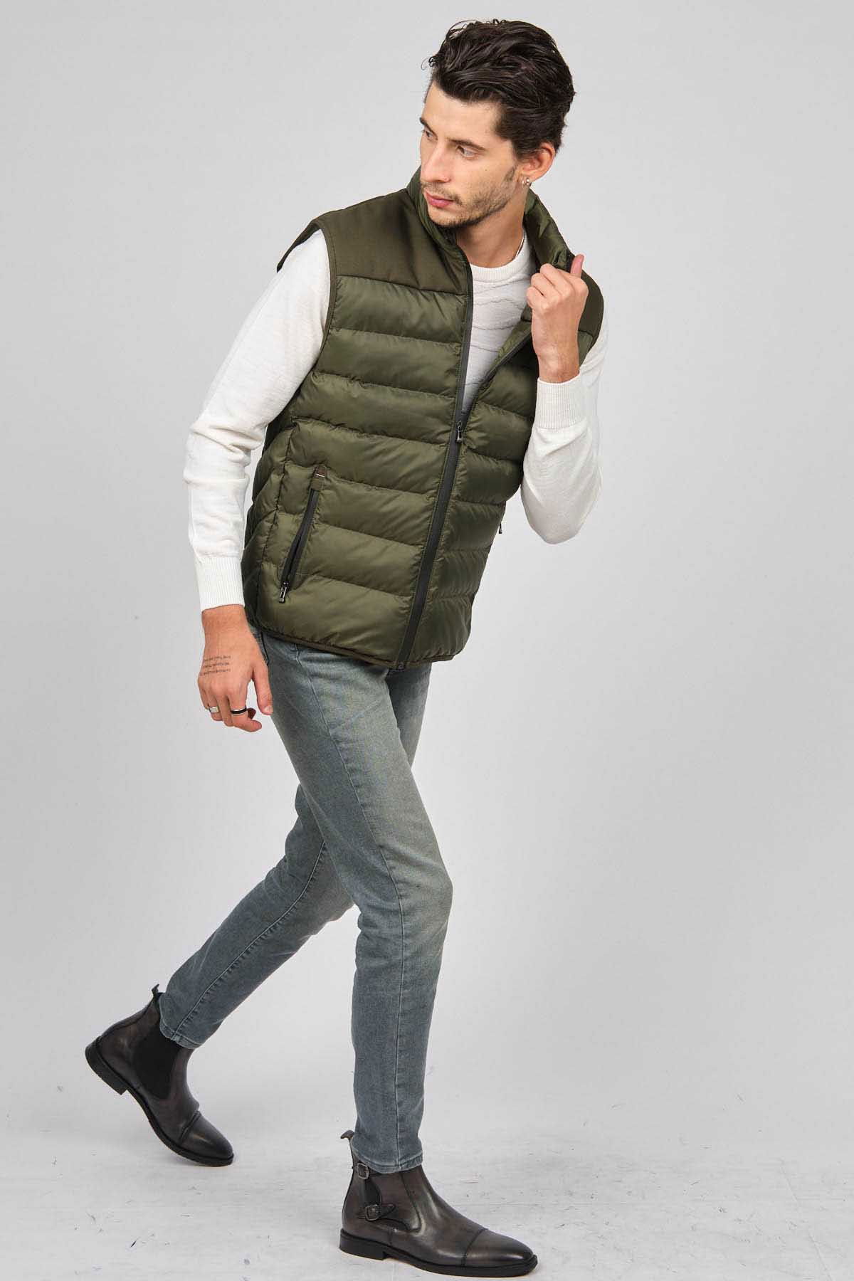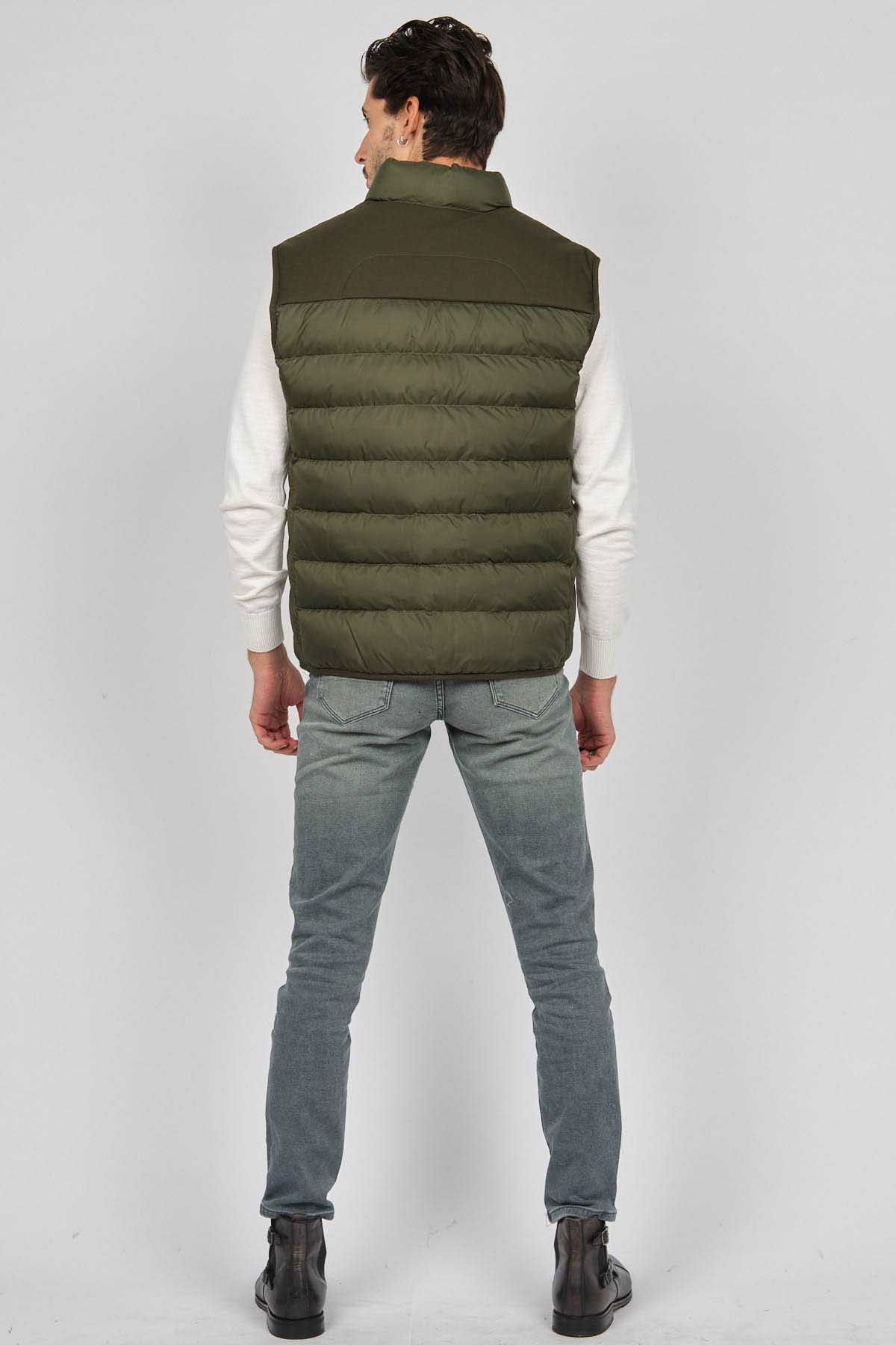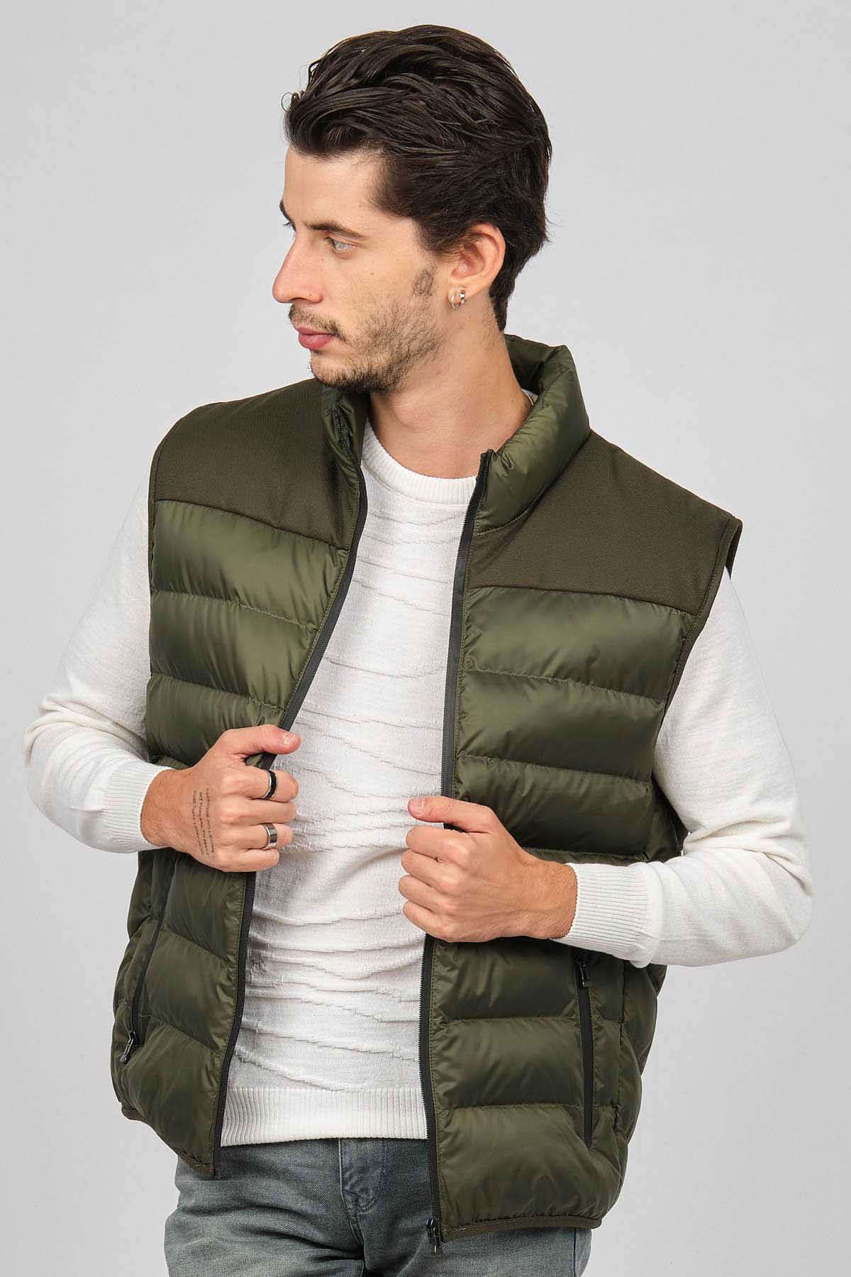 Detay: Dik yaka, fermuar cepli kapitone şişme yelek;