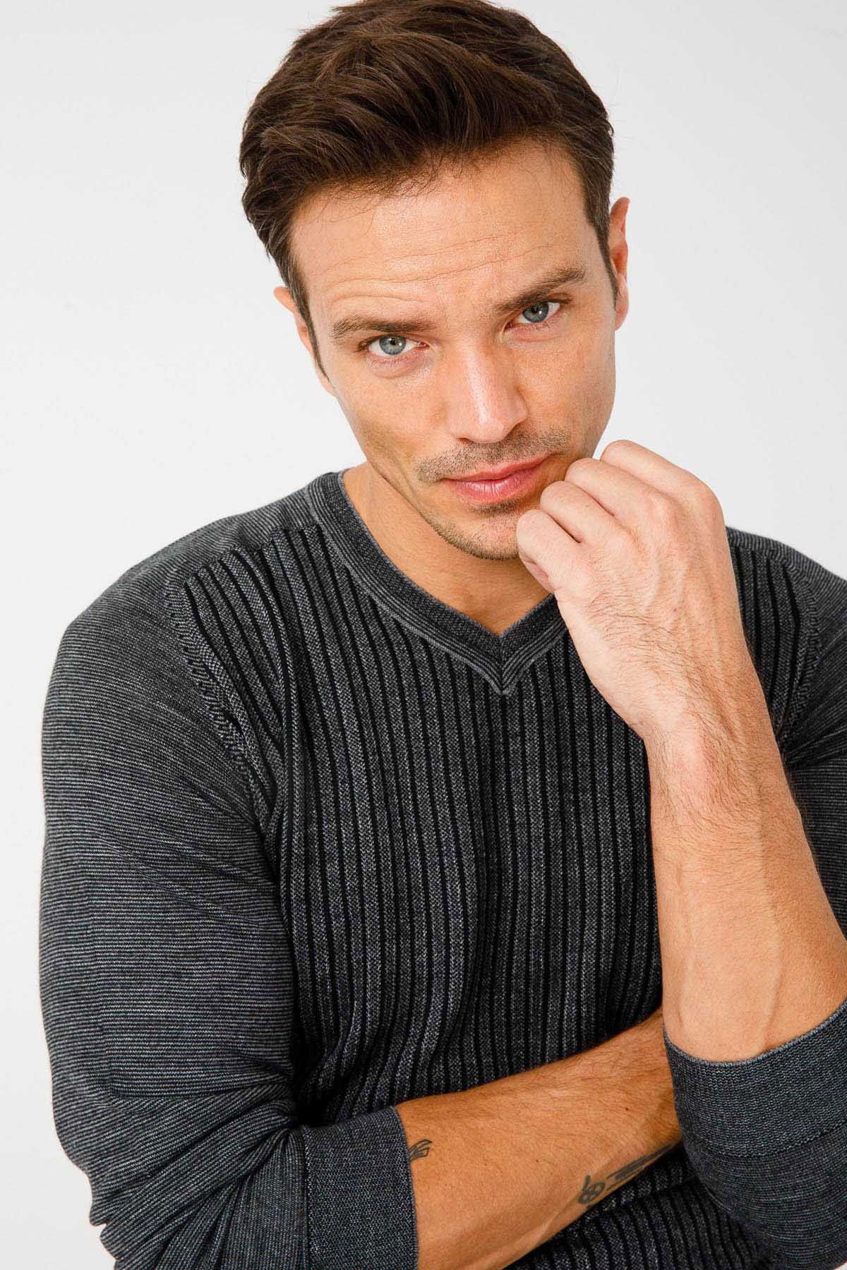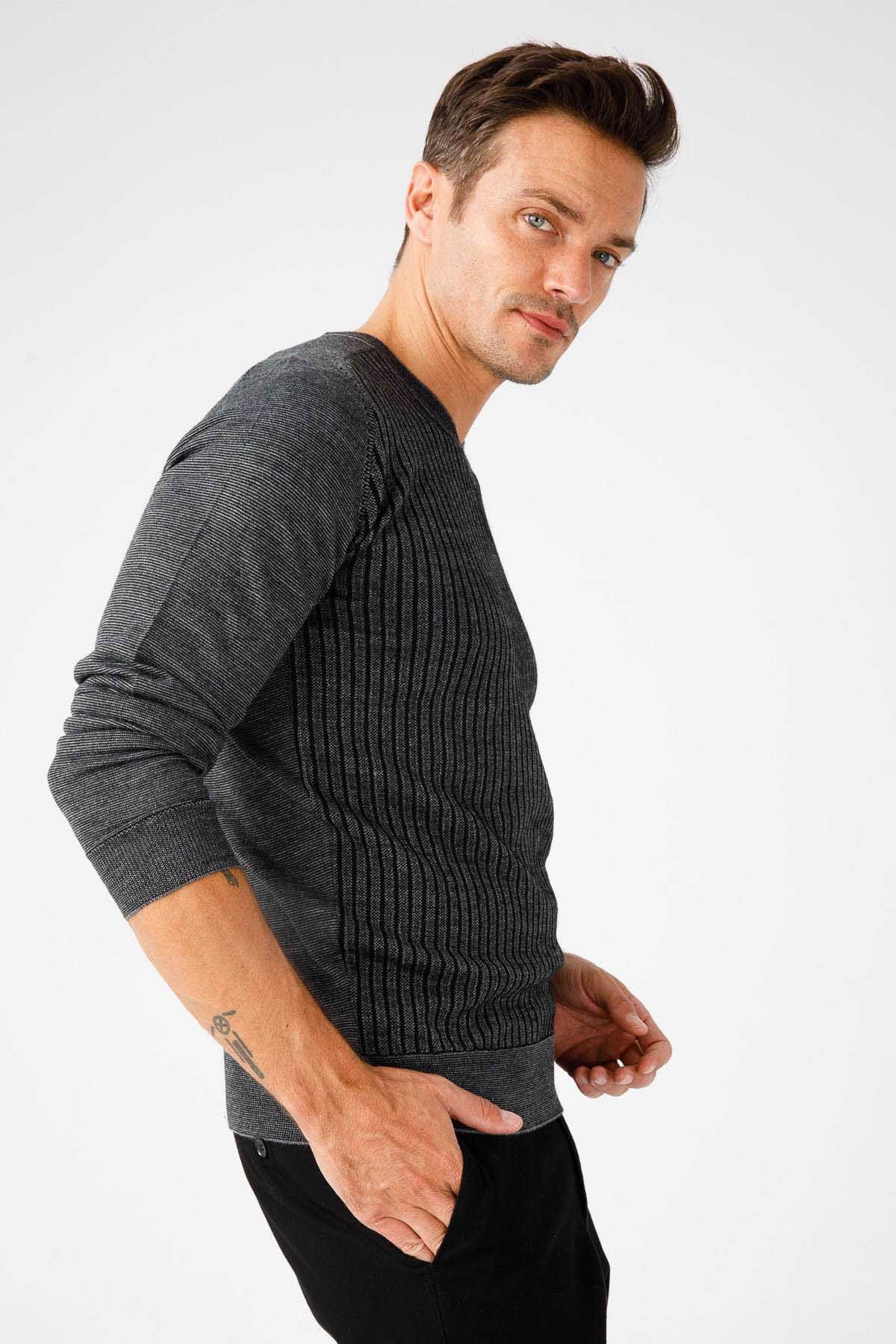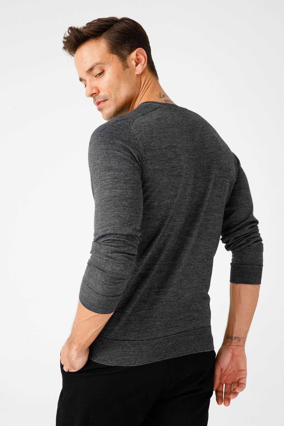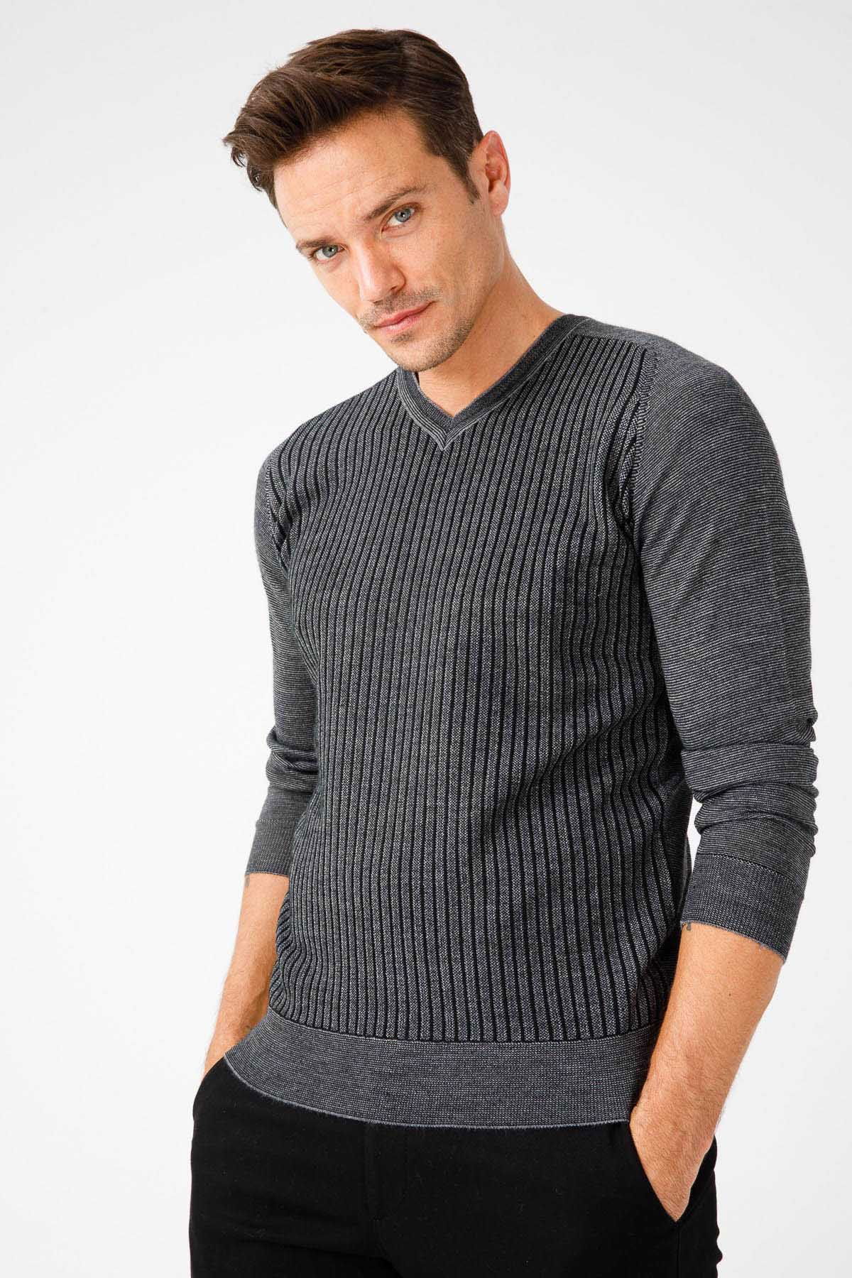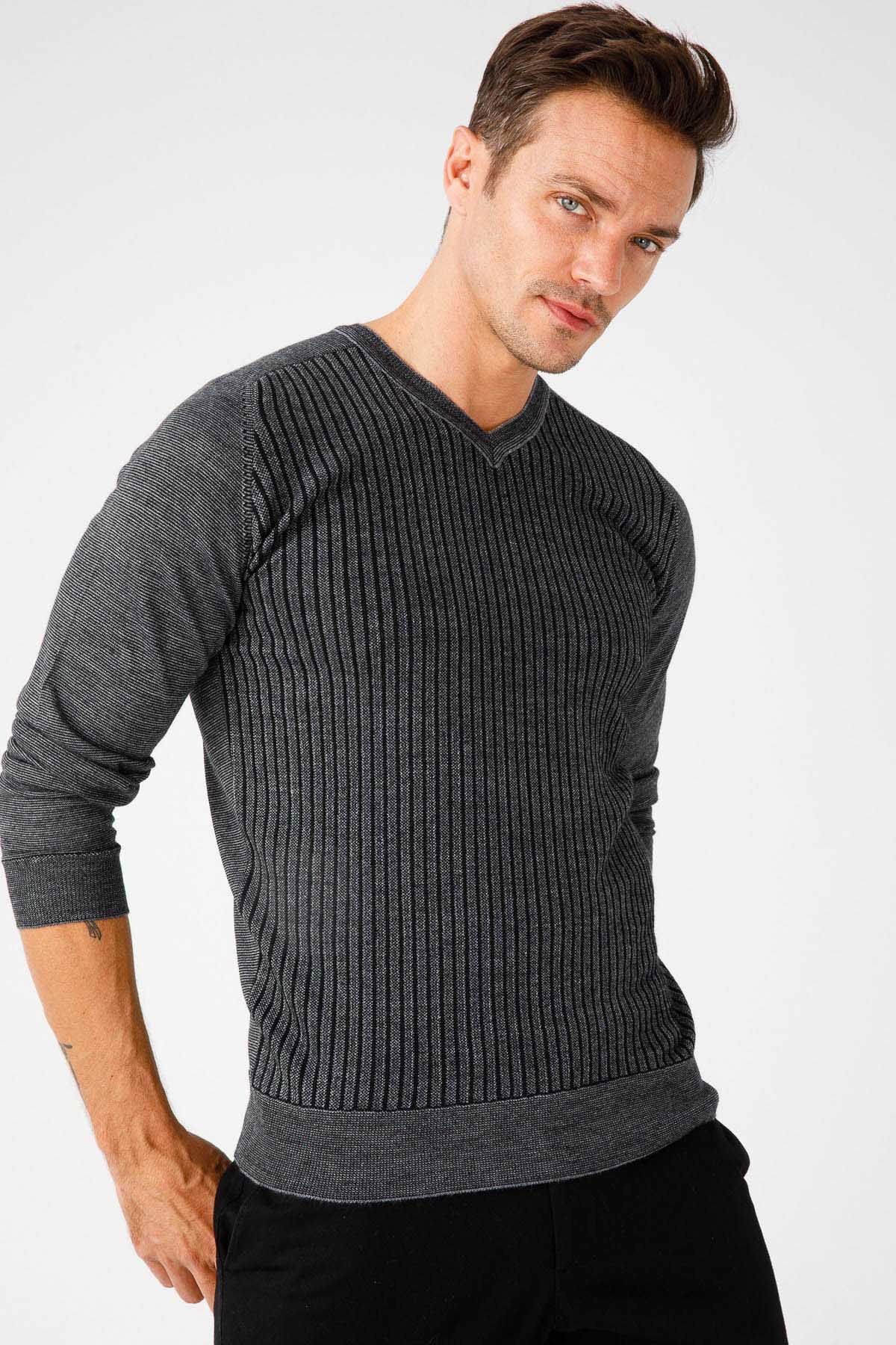 Desen Triko Erkek Önü Çizgili V Yaka Triko Kazak 02421501 Füme