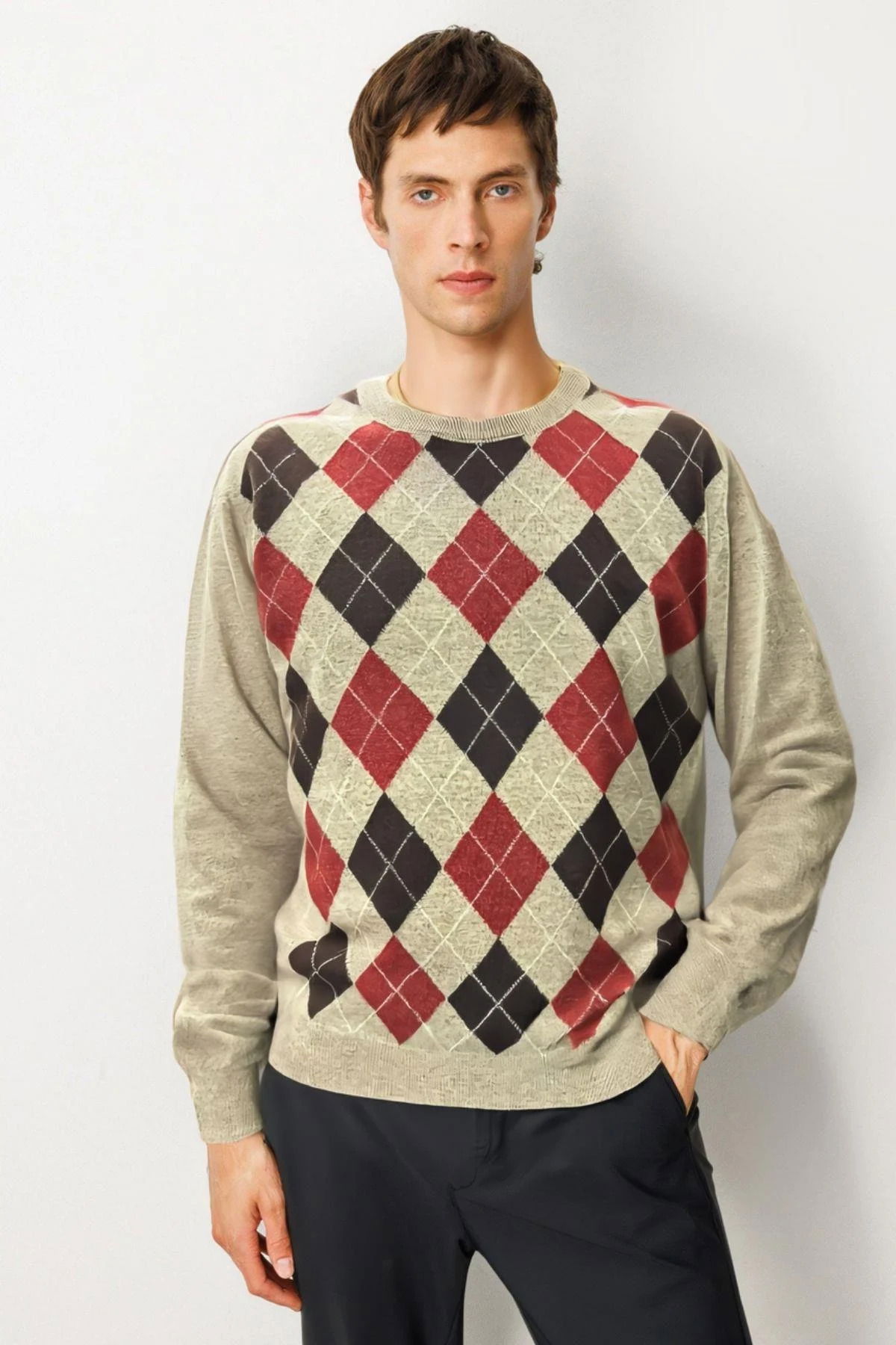 Desen Triko Erkek Sıfır Yaka Önü Baklava Desenli Kazak 24511 K. Bej