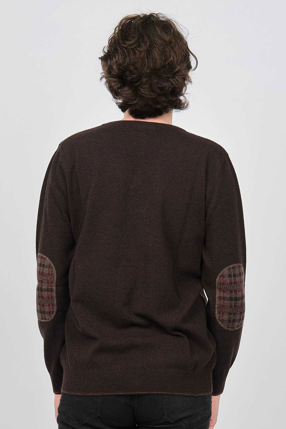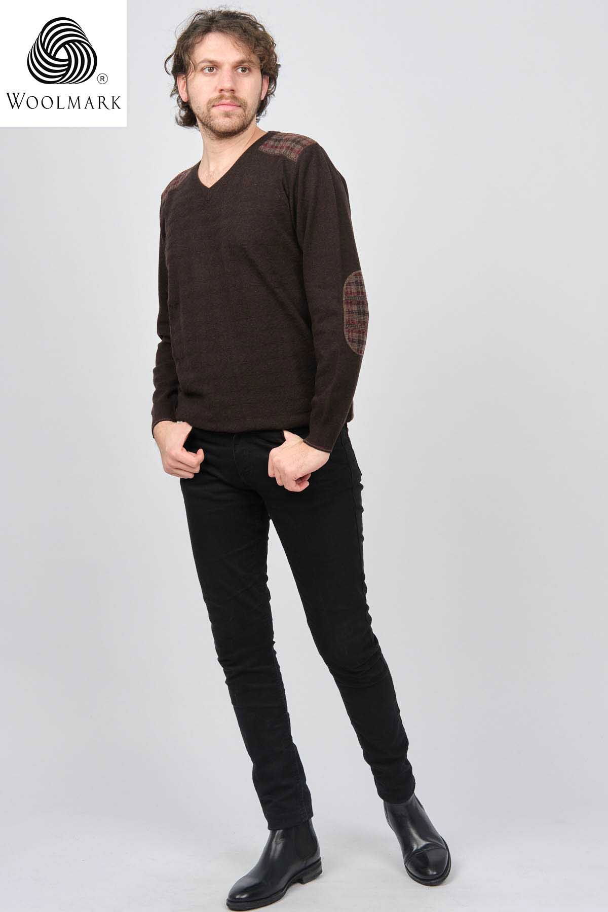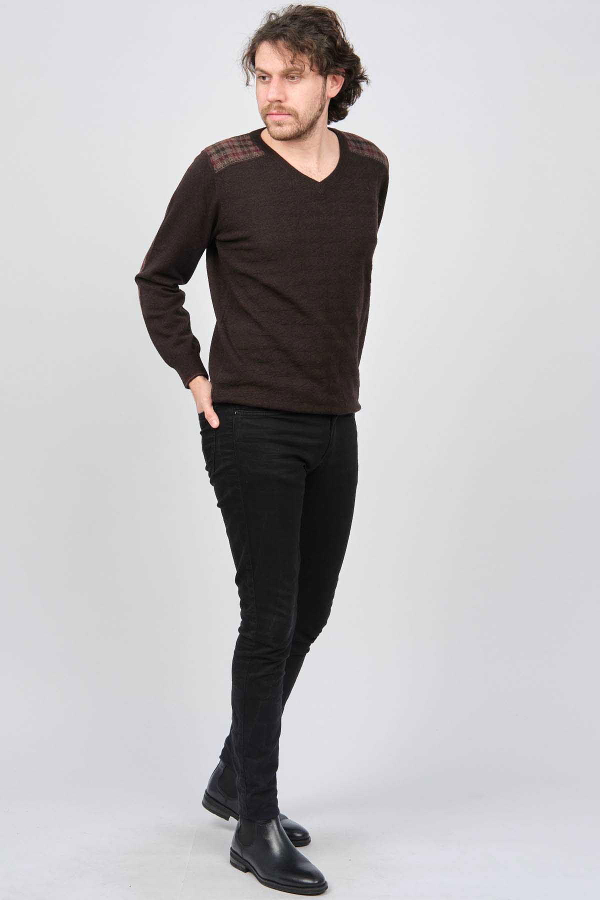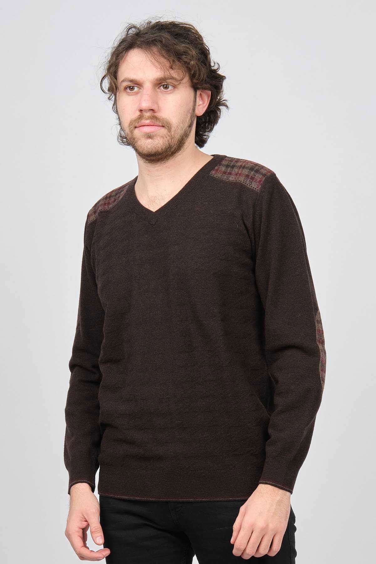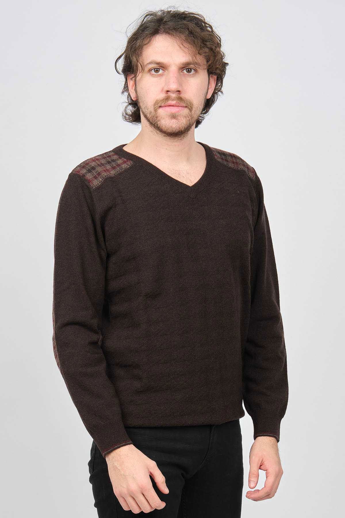 Detay: V yaka, Omzu ve kolları ekose detaylı, Uzun kollu, Saf yün kazak;