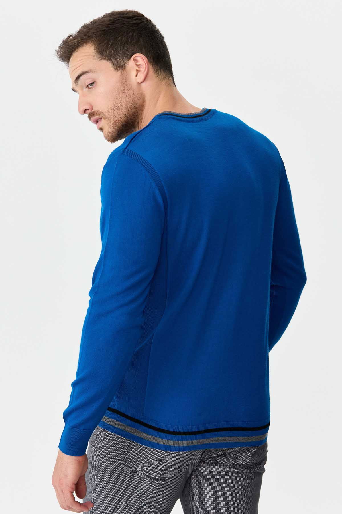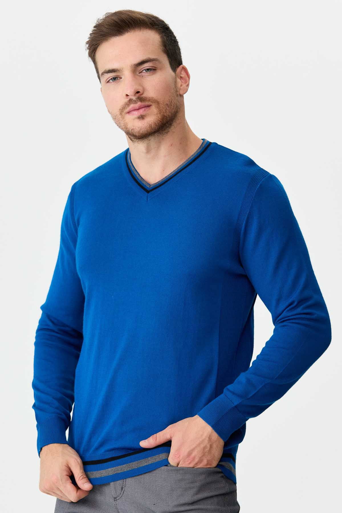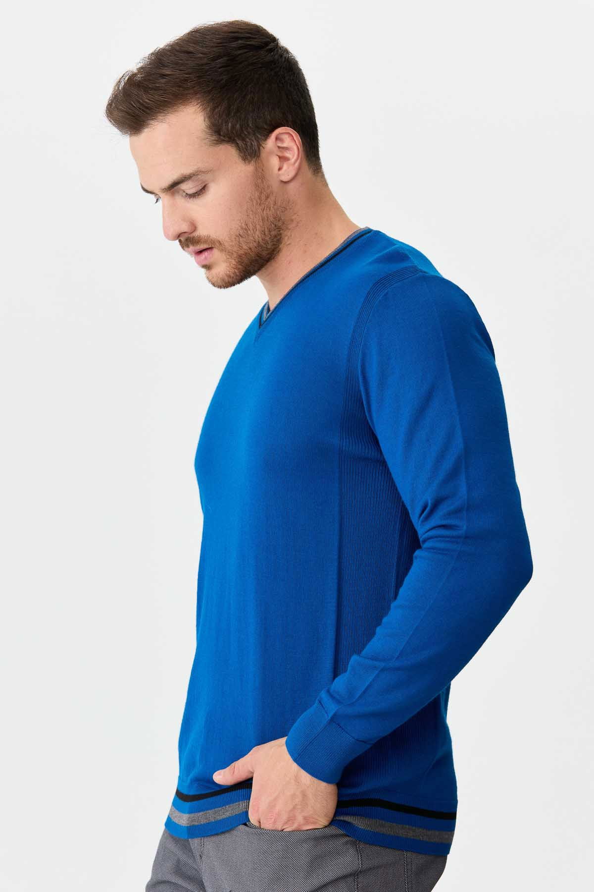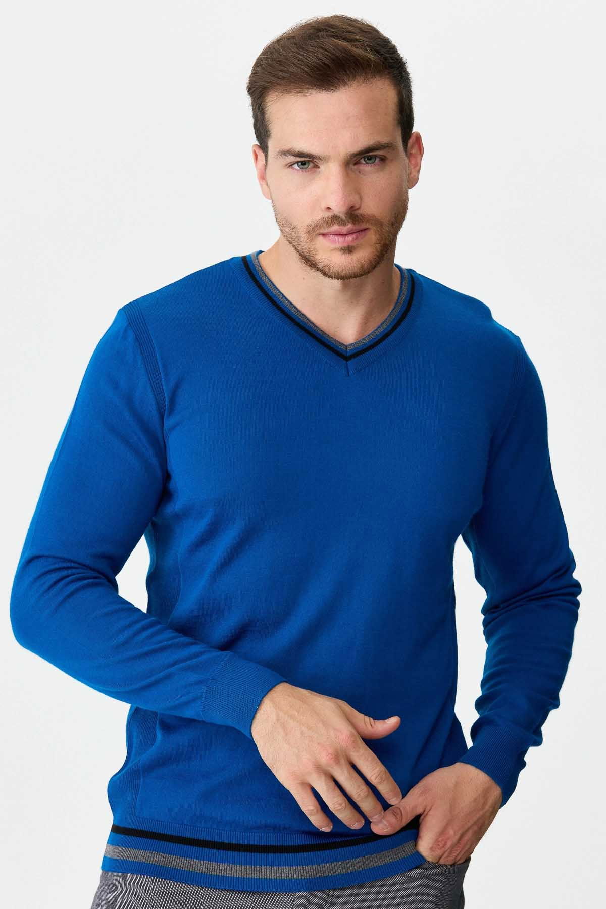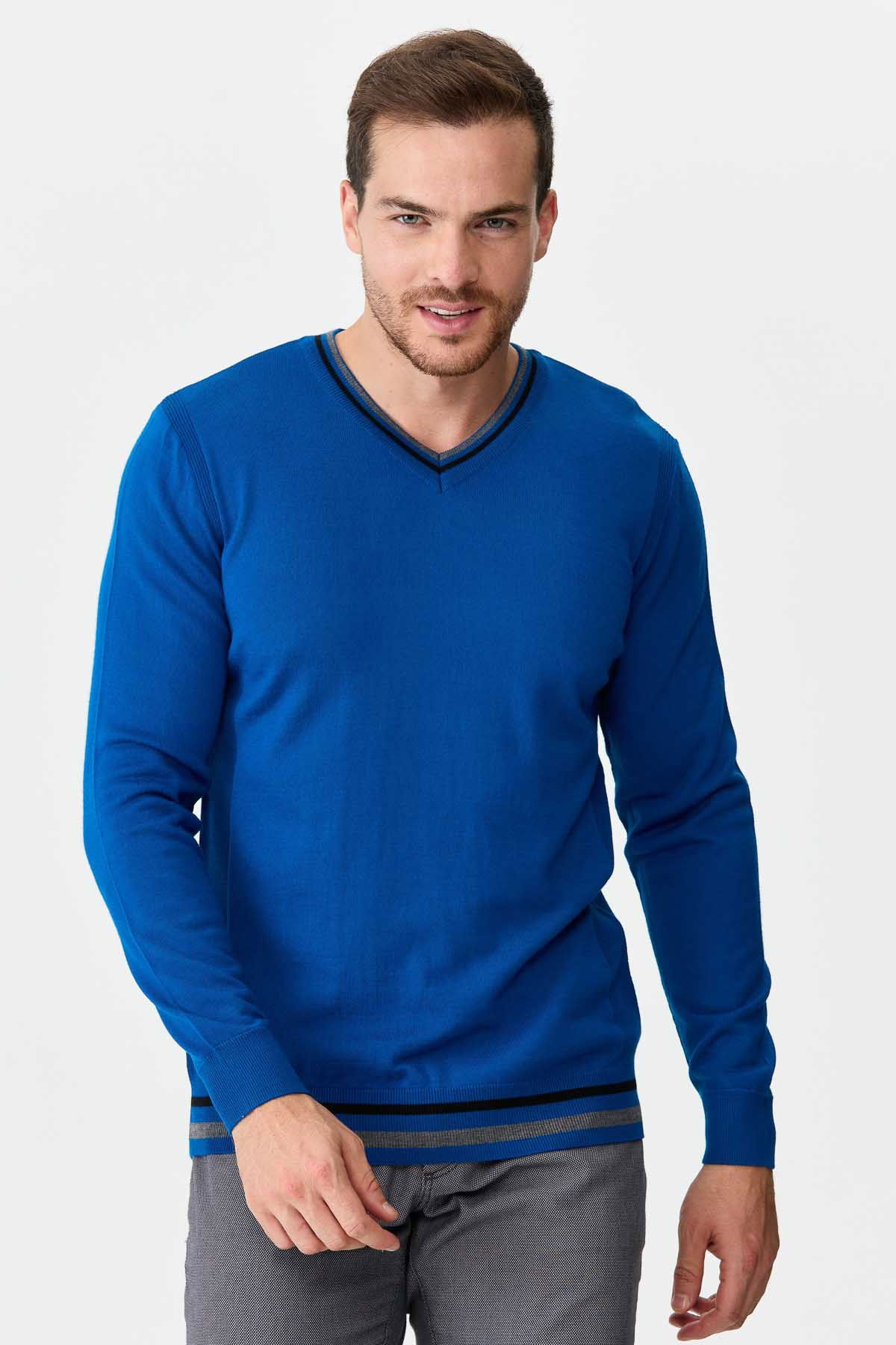 Detay: V yaka, yaka kenarı ve etek ucu çizgili, uzun kollu yün kazak;