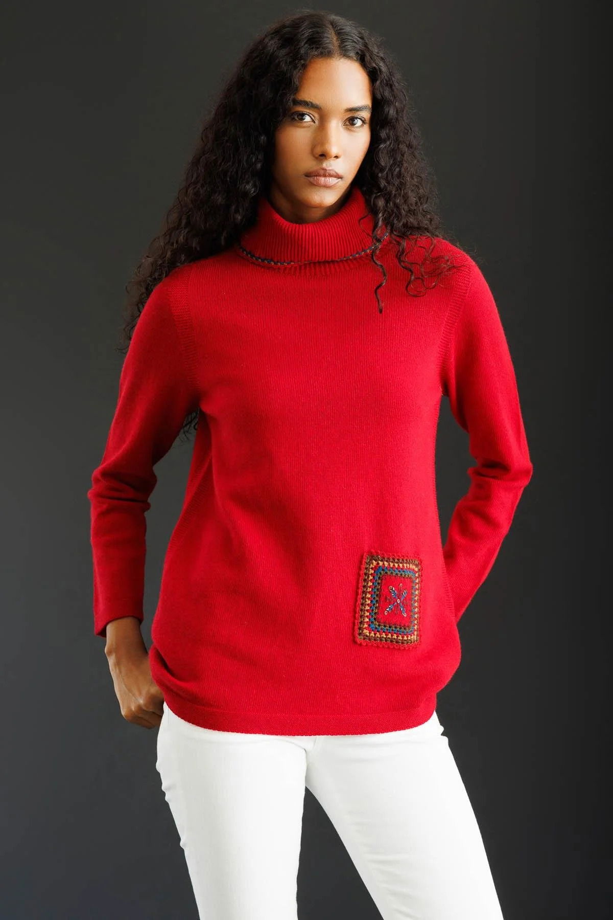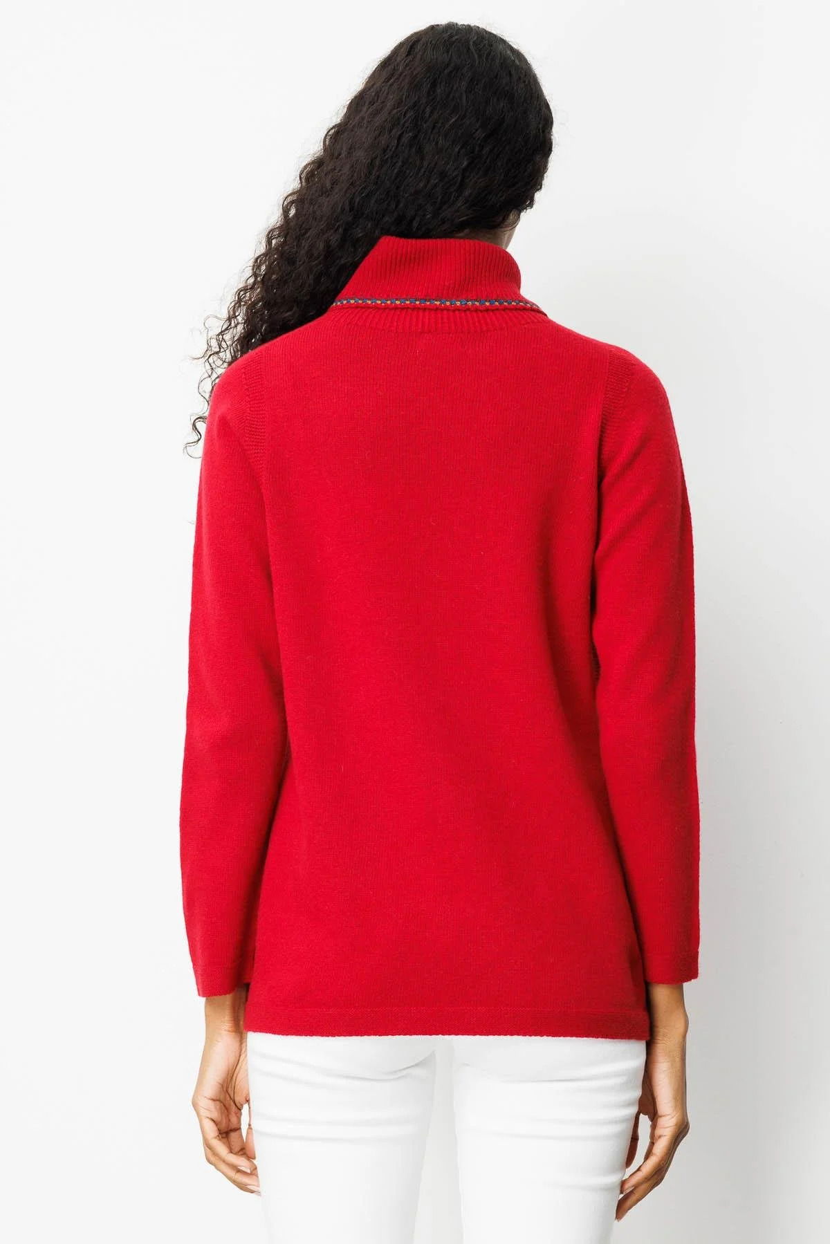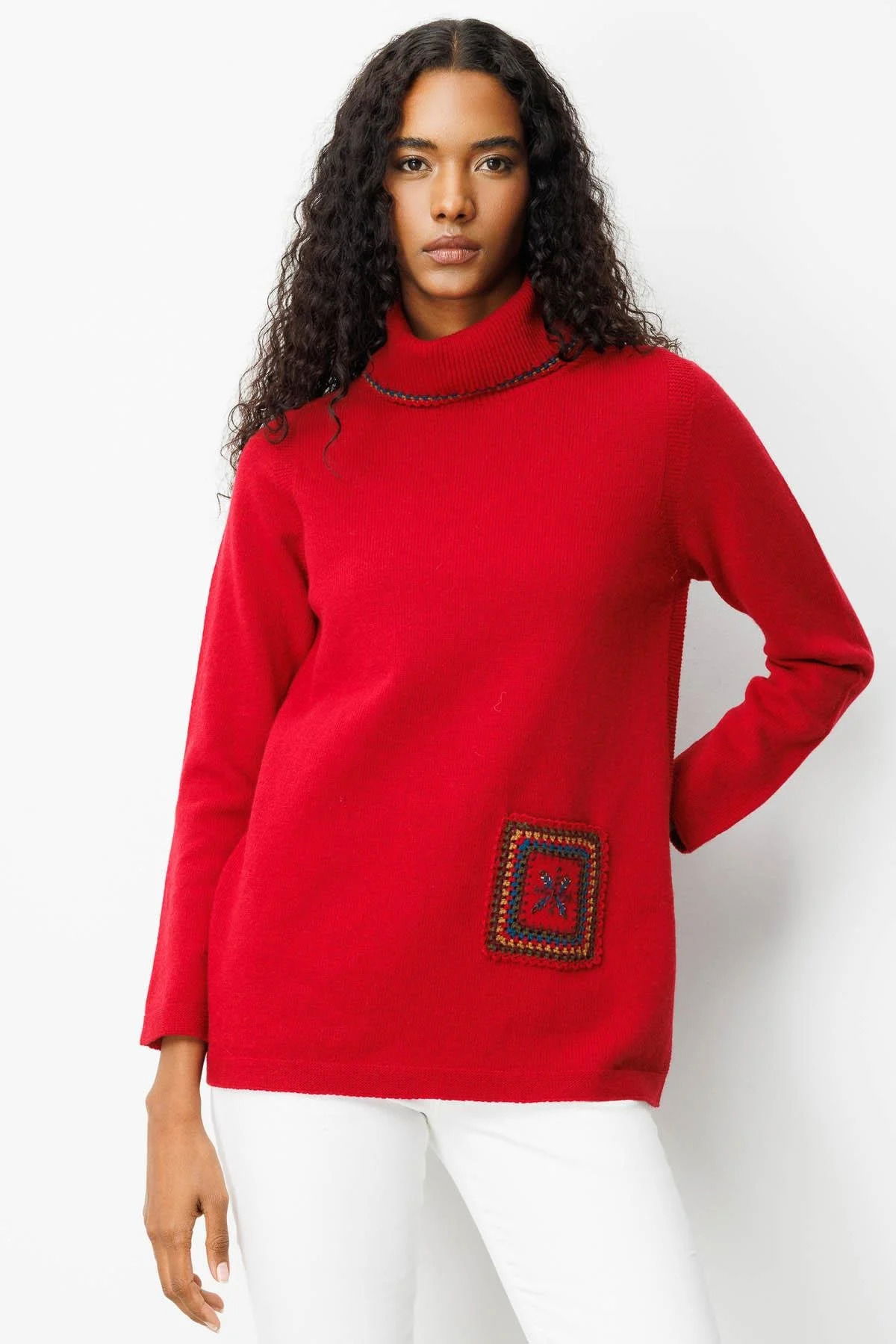 Desen Triko Kadın Degaje Yaka Cebi ve Yakası Tığlamalı Yün Kazak 25202 K.Kırmızı