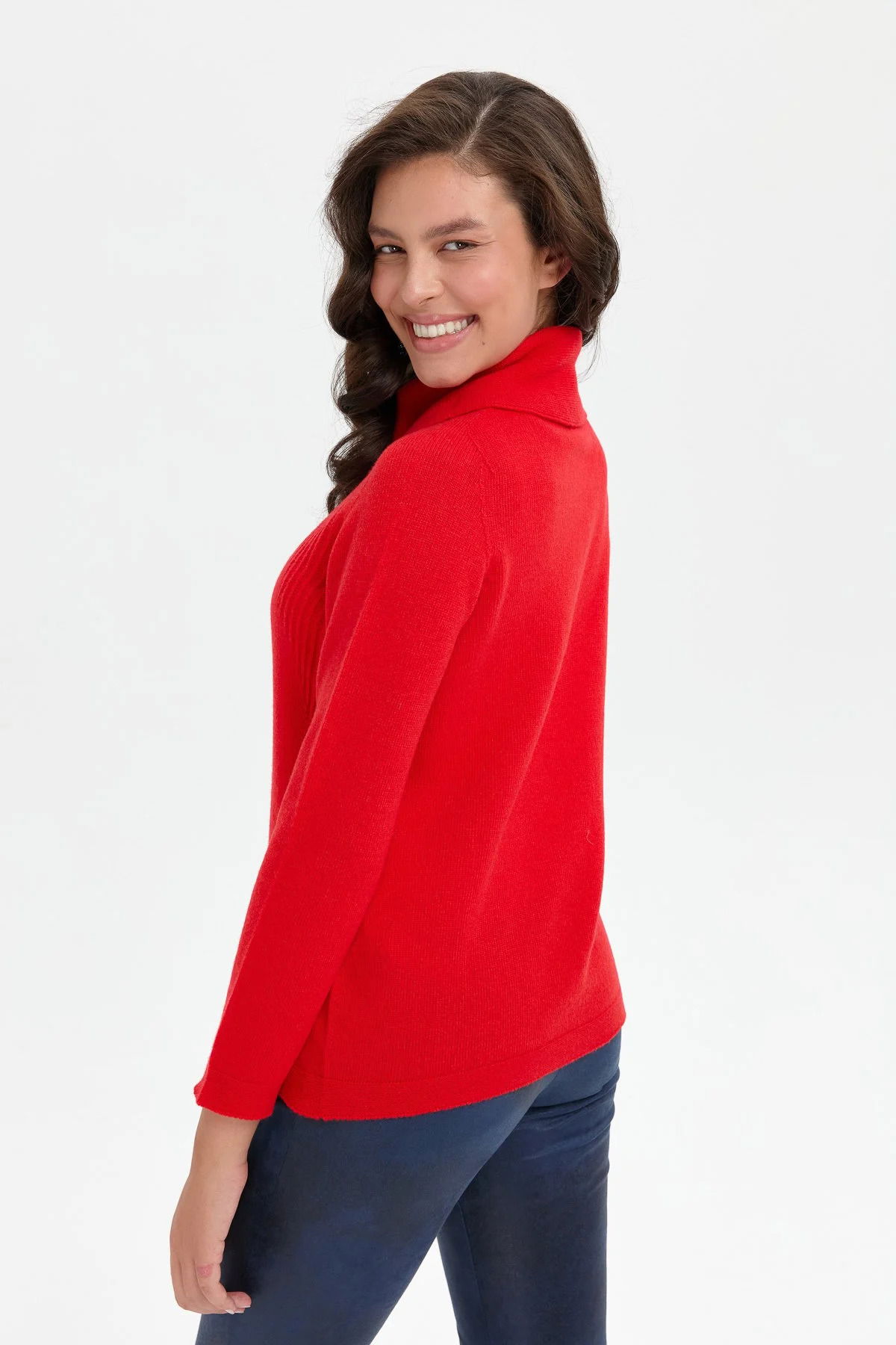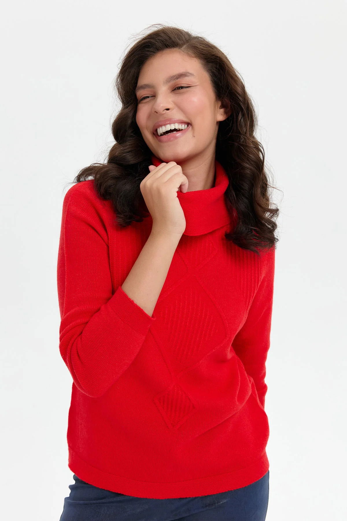 Desen Triko Kadın Degaje Yaka Dikişsiz Önü Selanik Örgü Yün Kazak 24200 Mercan