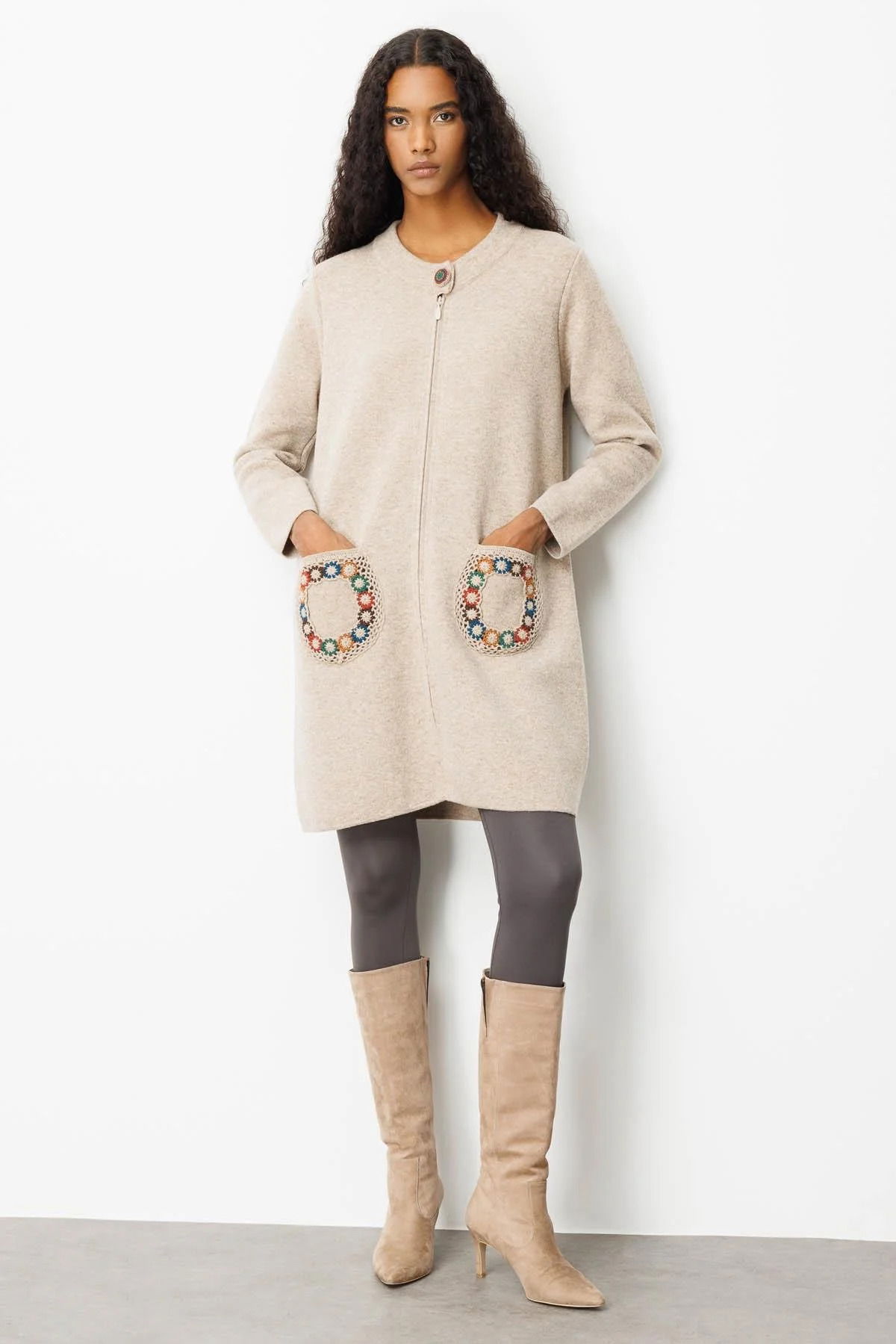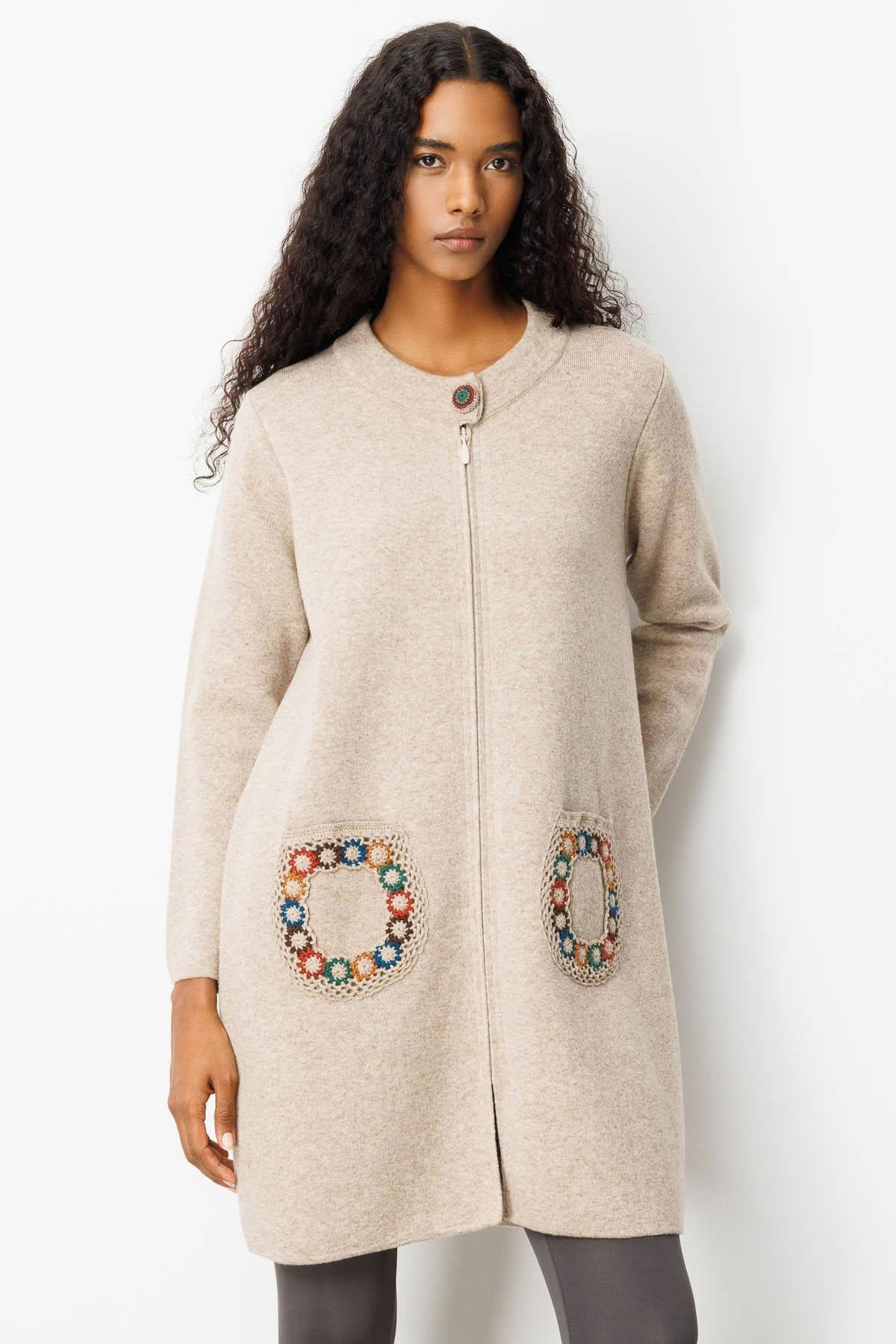Desen Triko Kadın Dik Yaka Cebi Tığlamalı Uzun Yün Kaban 25023 K. Bej