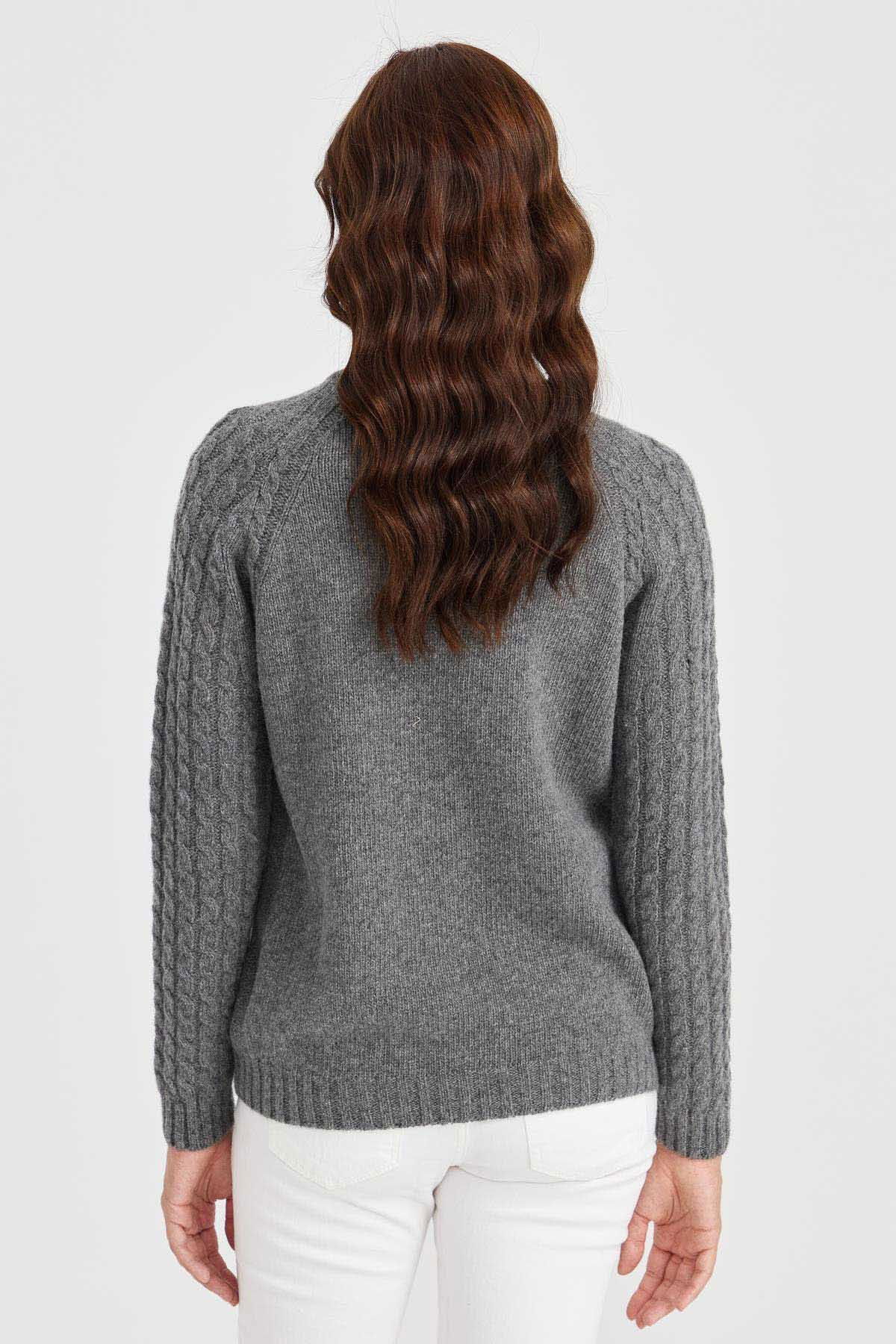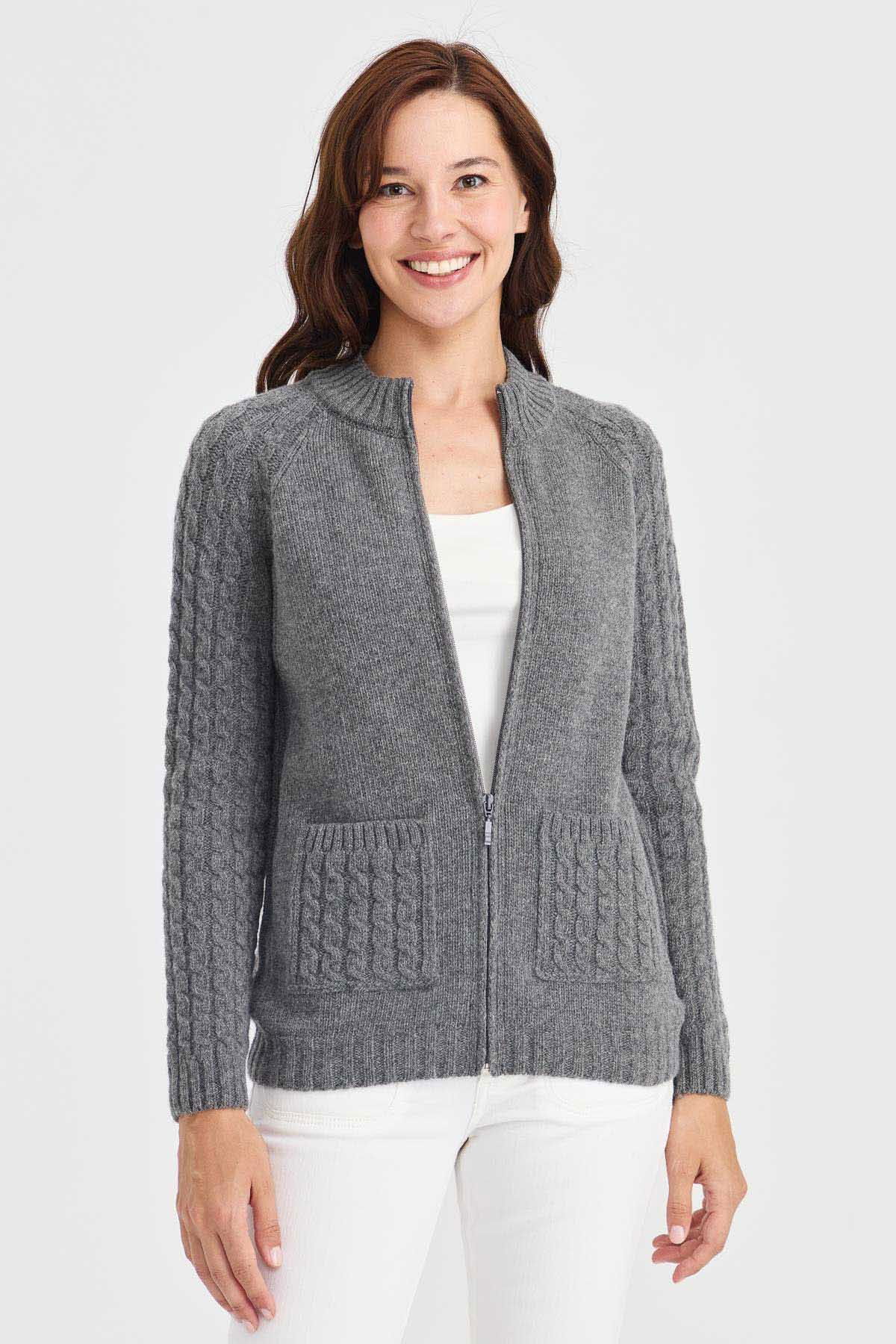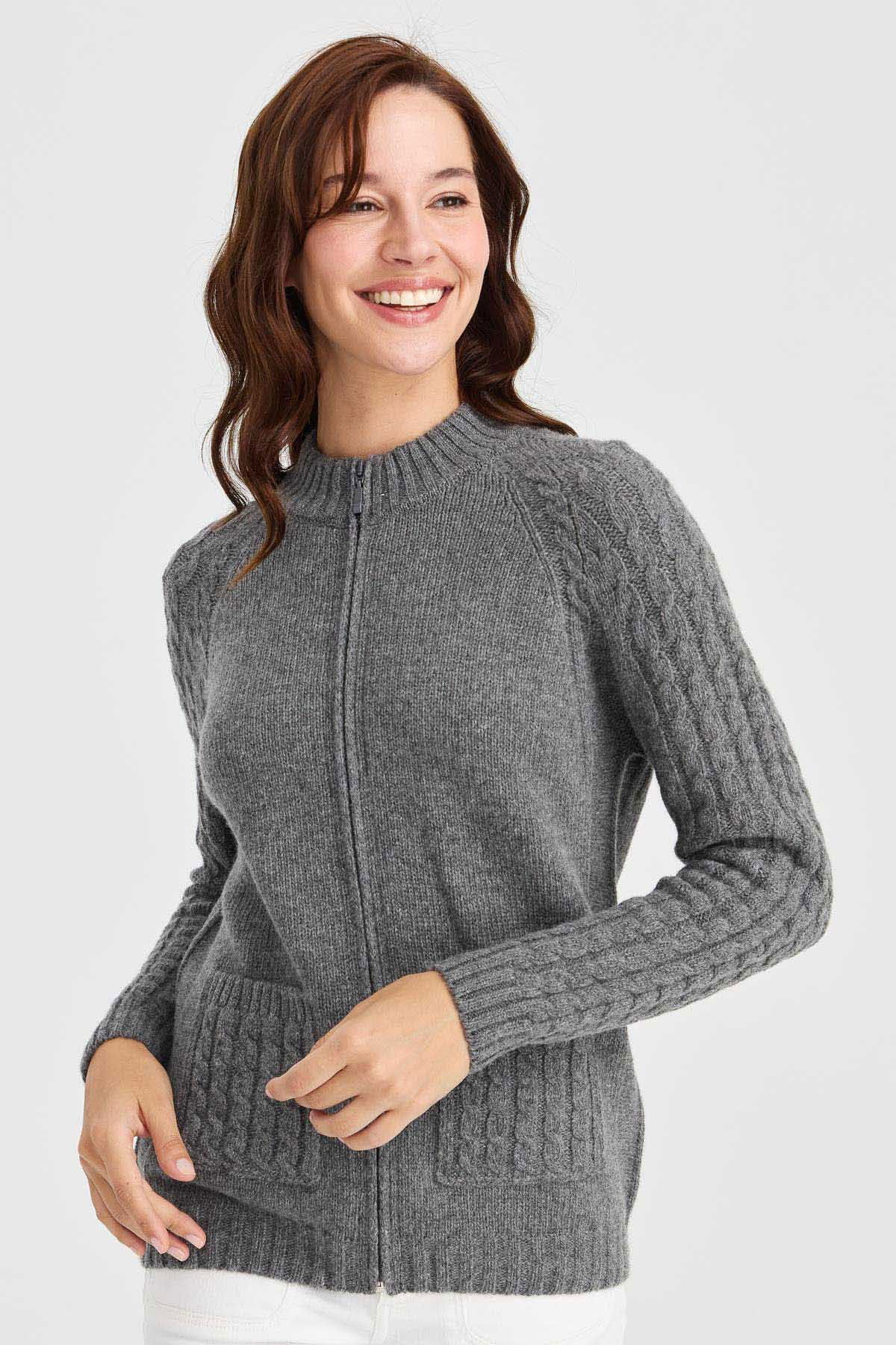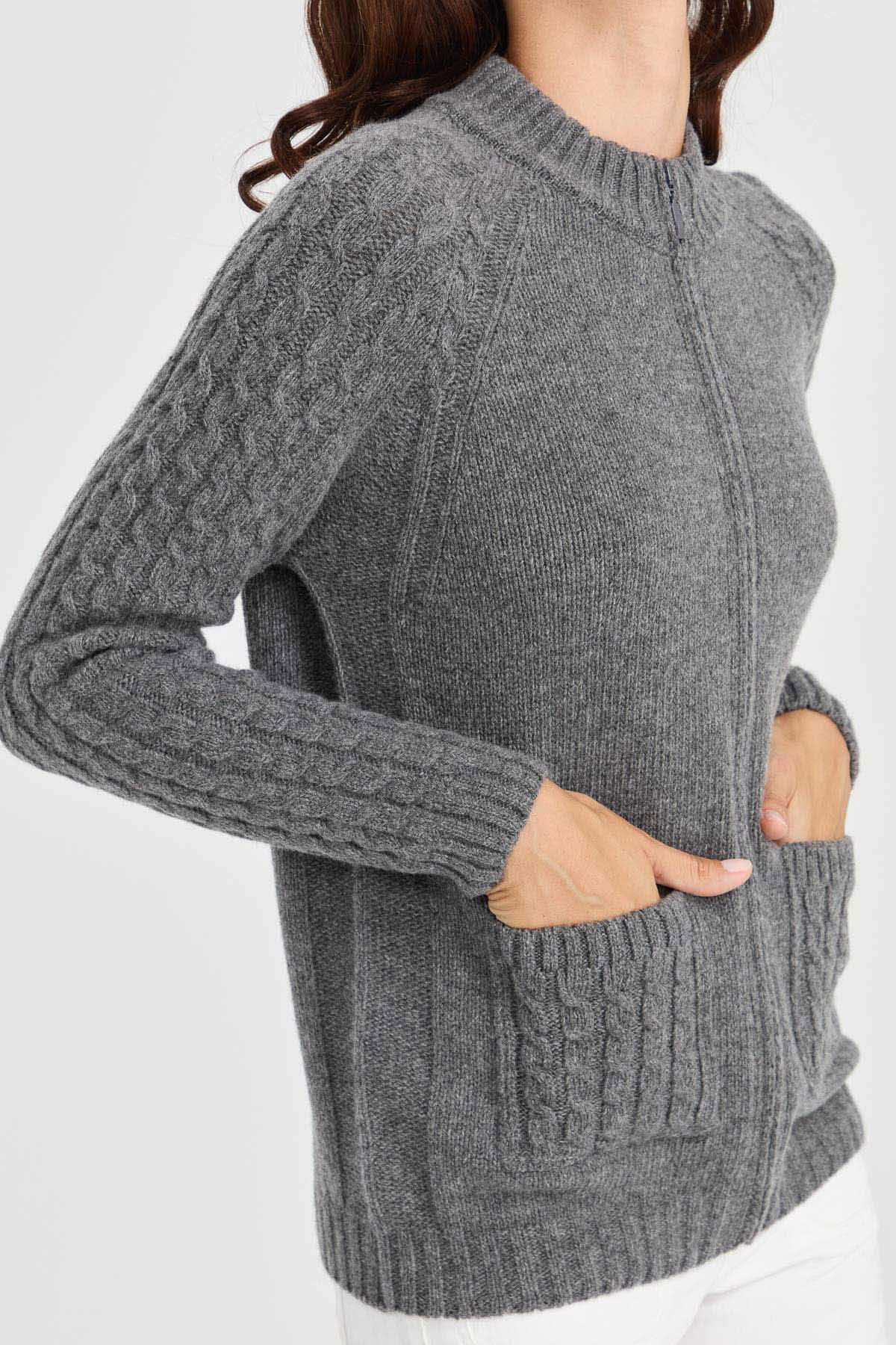 Desen Triko Kadın Dik Yaka Cebi ve Kolu Saç Örgü Yün Hırka 23203 Füme