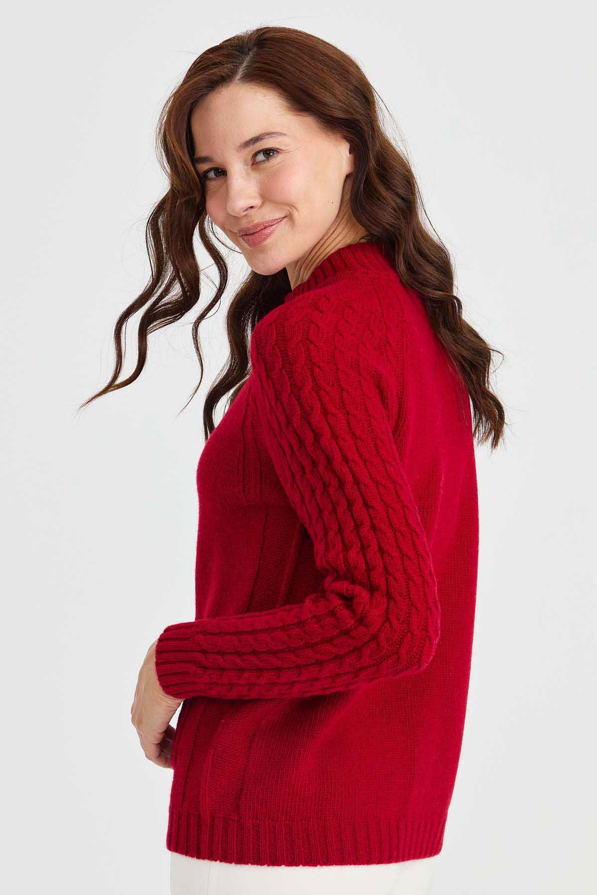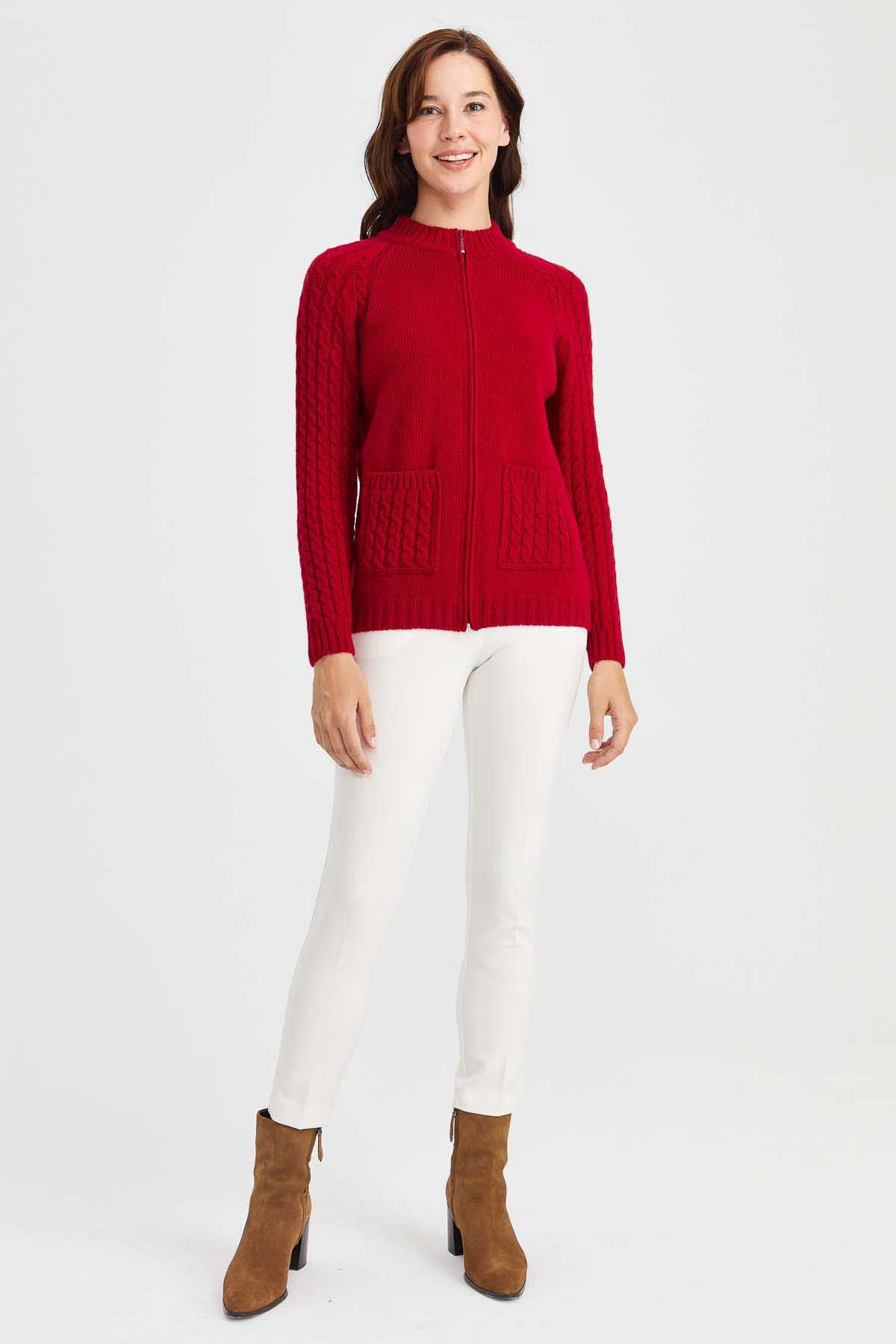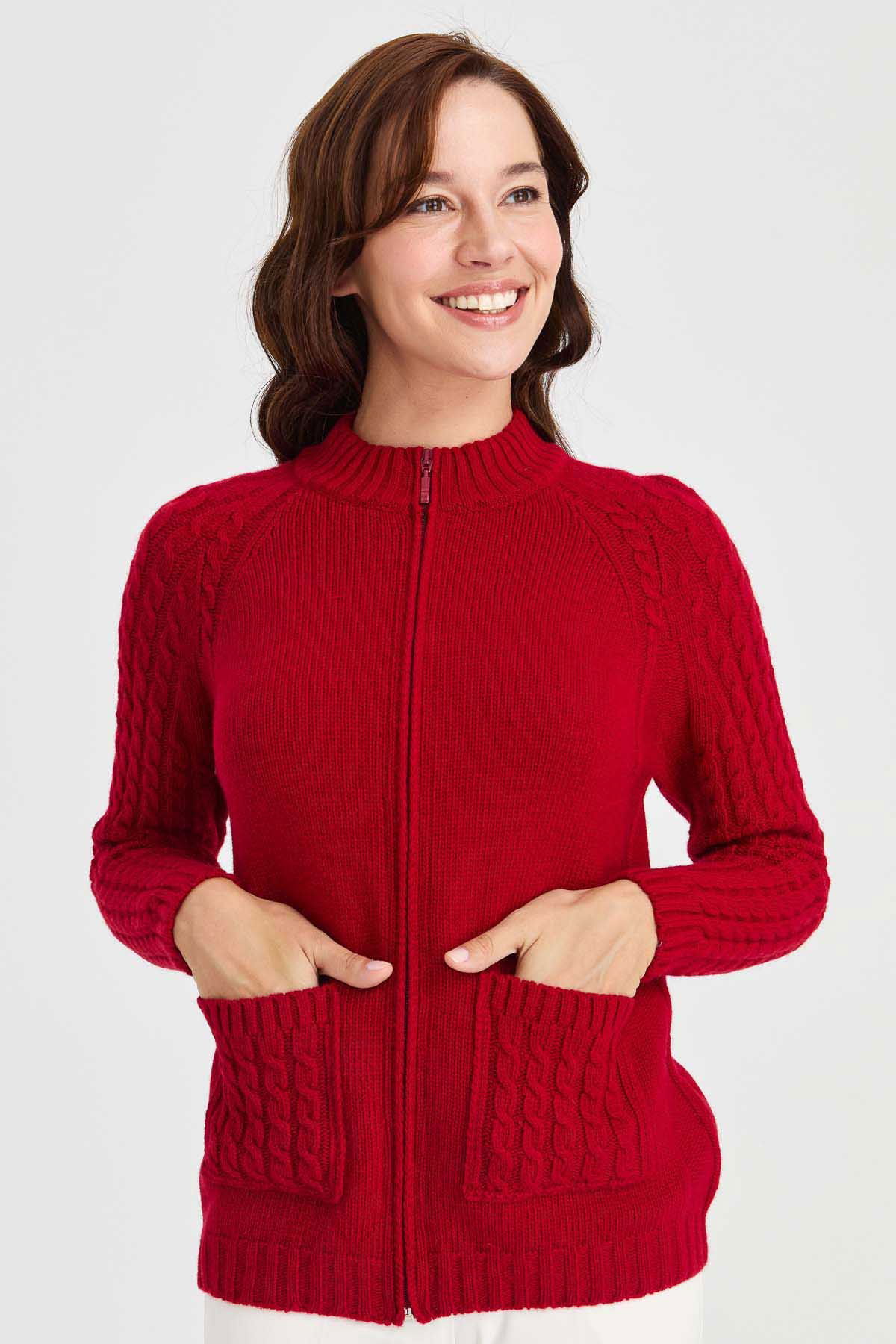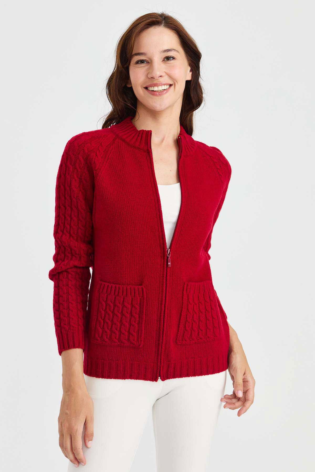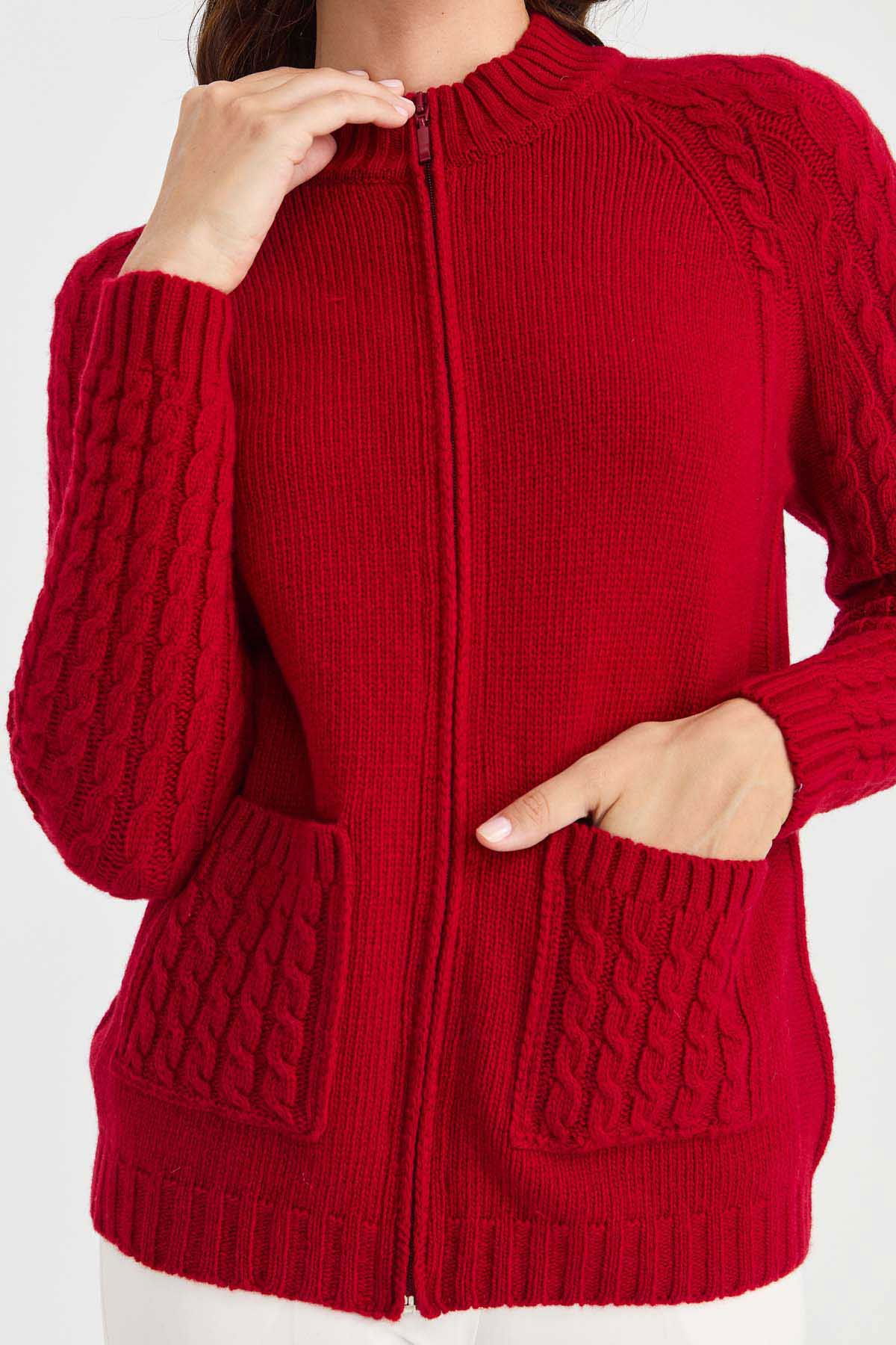 Desen Triko Kadın Dik Yaka Cebi ve Kolu Saç Örgü Yün Hırka 23203 K.Kırmızı